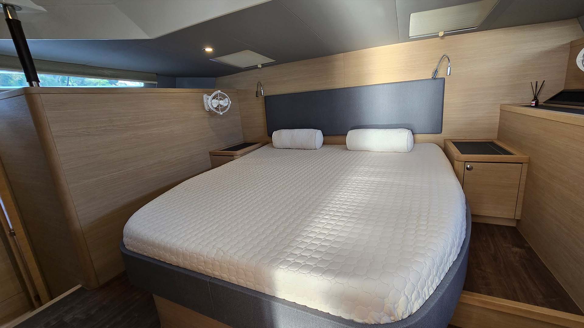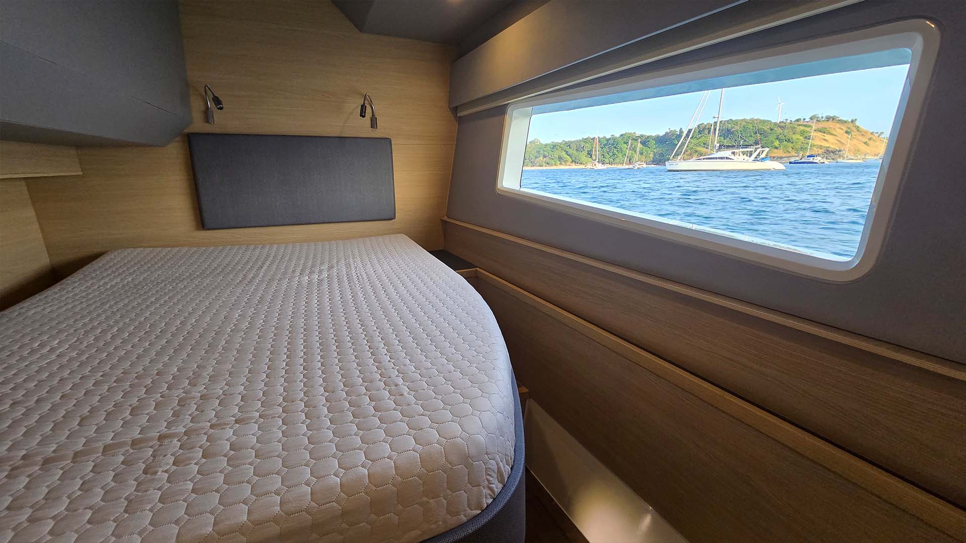 Мастер каюта расположенная в носовой части, эта каюта занимает всю ширину катамарана, около 6,5 метров! Это настоящая хозяйская каюта, где можно провести неделю, не чувствуя себя стесненно.