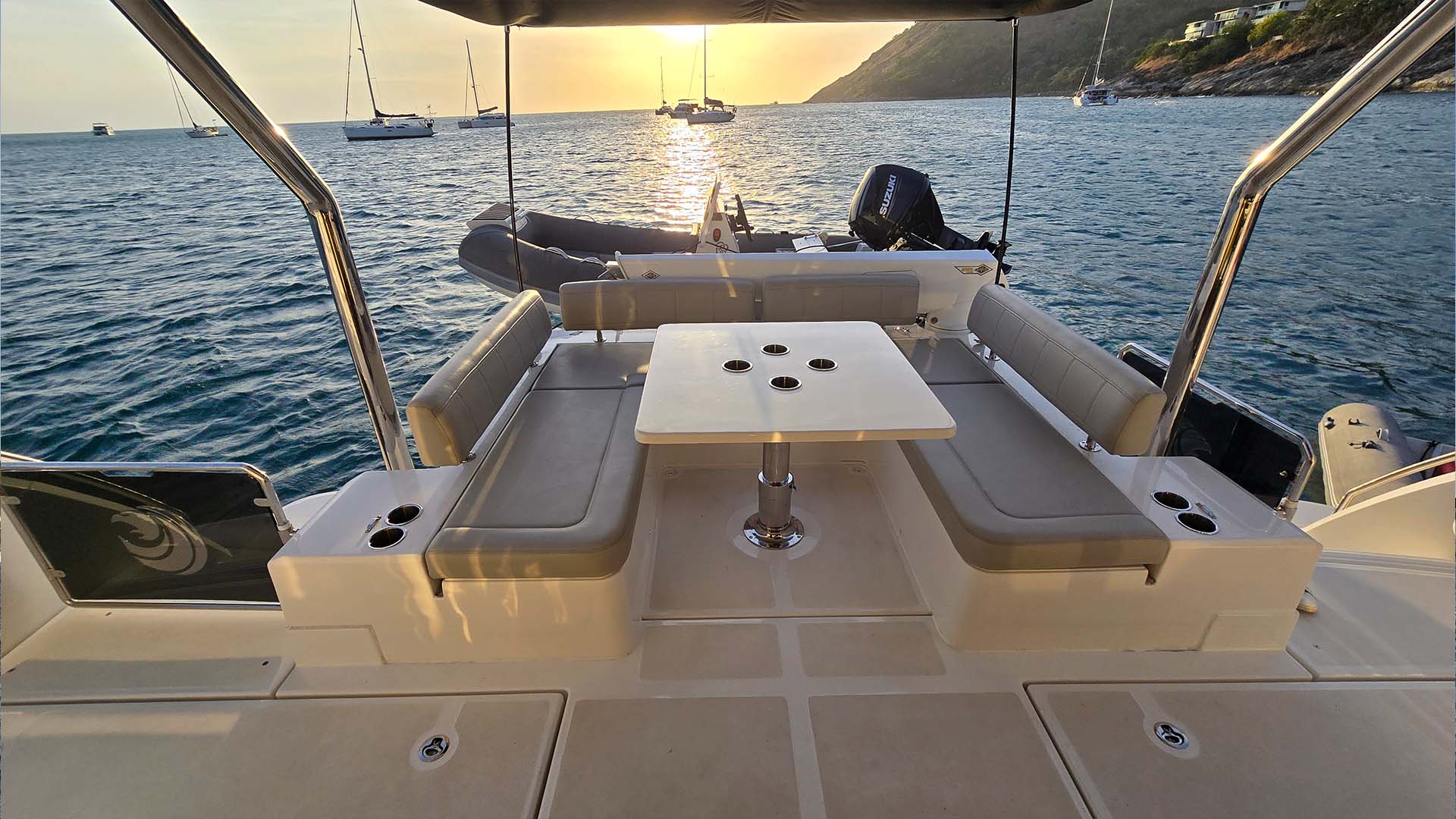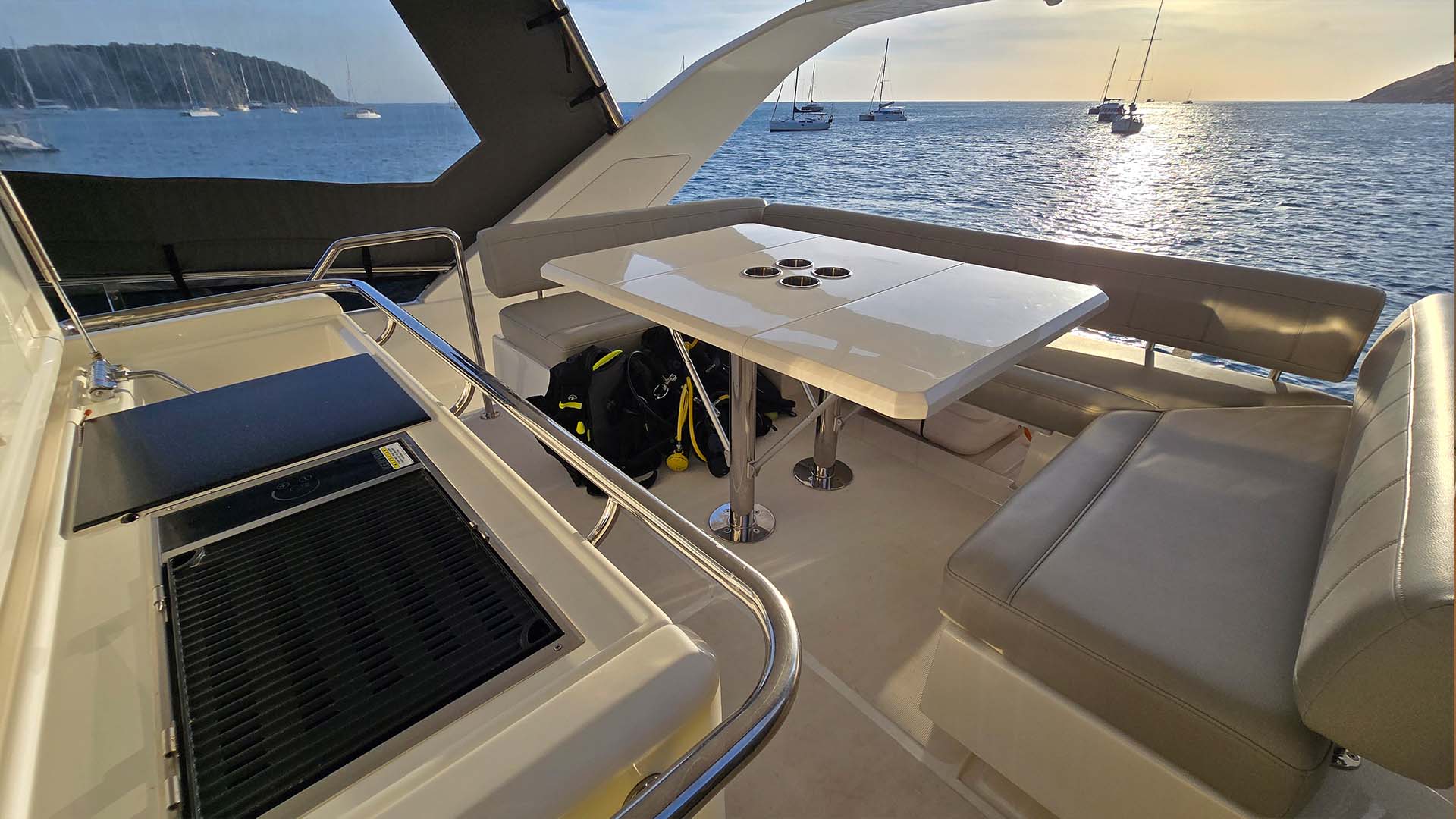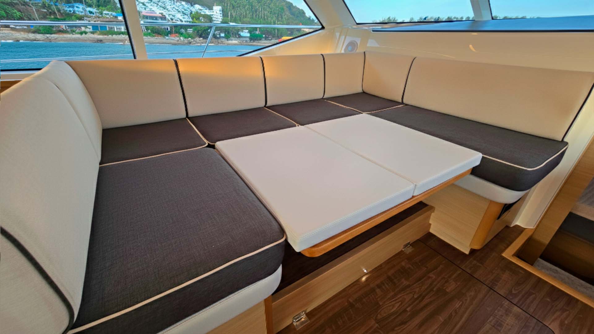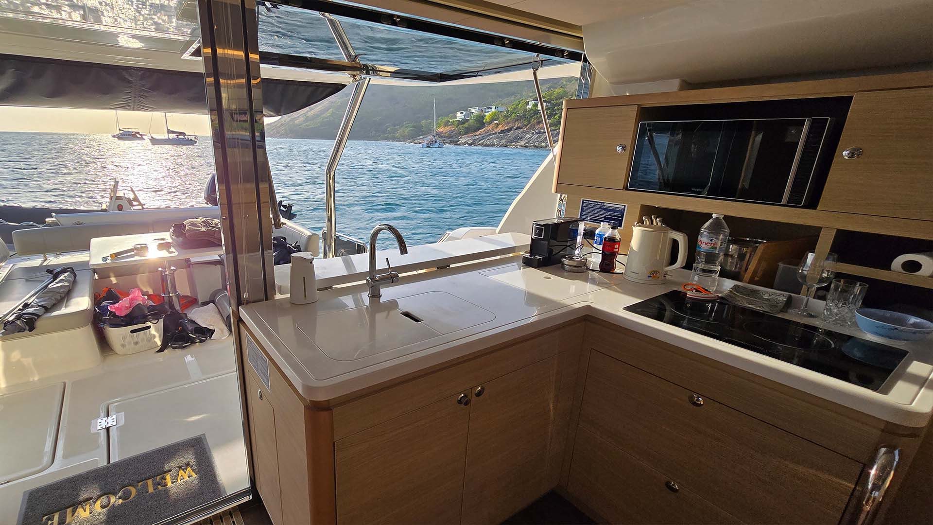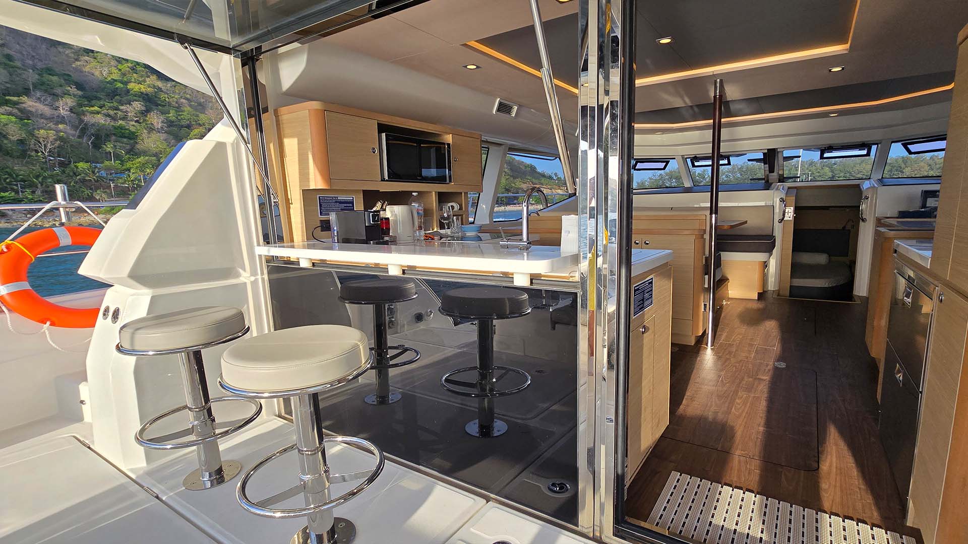 Инженеры Aquila постарались, они создали откидывающееся окно между камбузом (кухней) и задним кокпитом, которое превращается в полноценную барную стойку. Большое панорамное окно, разделяющее внутреннюю кухню от открытой кормовой палубы, оснащено газовыми амортизаторами и откидывается вверх одним легким движением. Одновременно столешница из прочного композитного материала Corian выдвигается наружу, создавая элегантную барную стойку шириной около метра. Эта система превращает Aquila 44 из обычного катамарана в настоящий плавучий бар, где социальное взаимодействие выходит на первый план. Закаты становятся еще прекраснее, когда вы смешиваете Mai Tai, глядя на оранжевое небо и счастливые лица друзей ну и конечно же незабываемые фото.