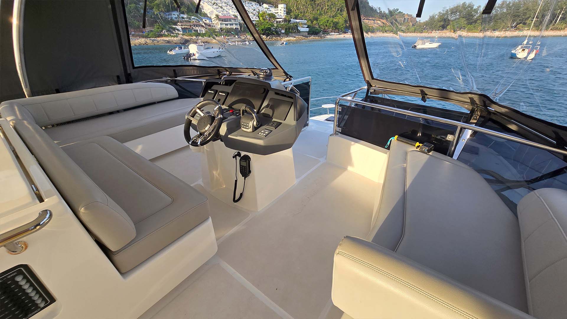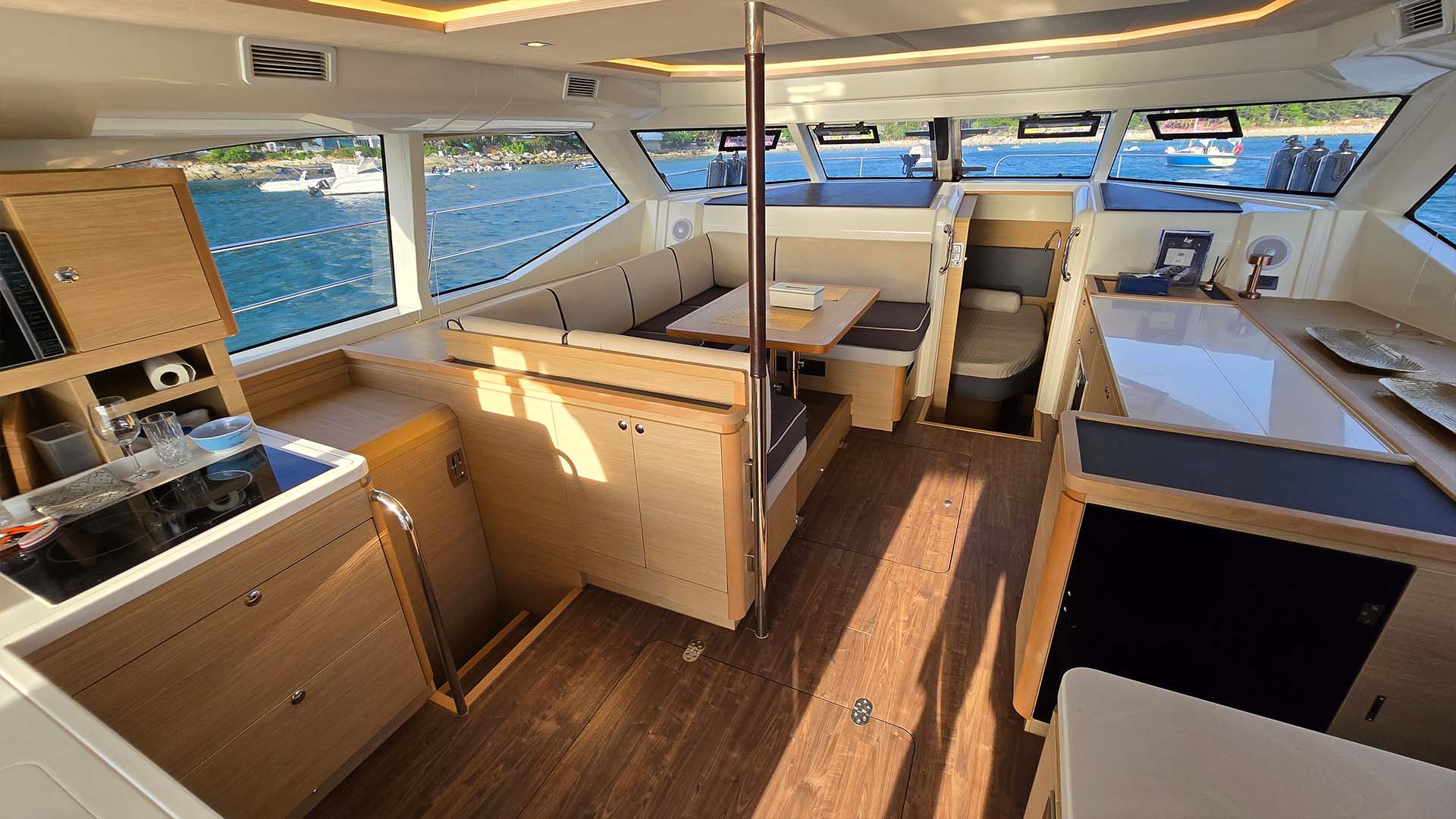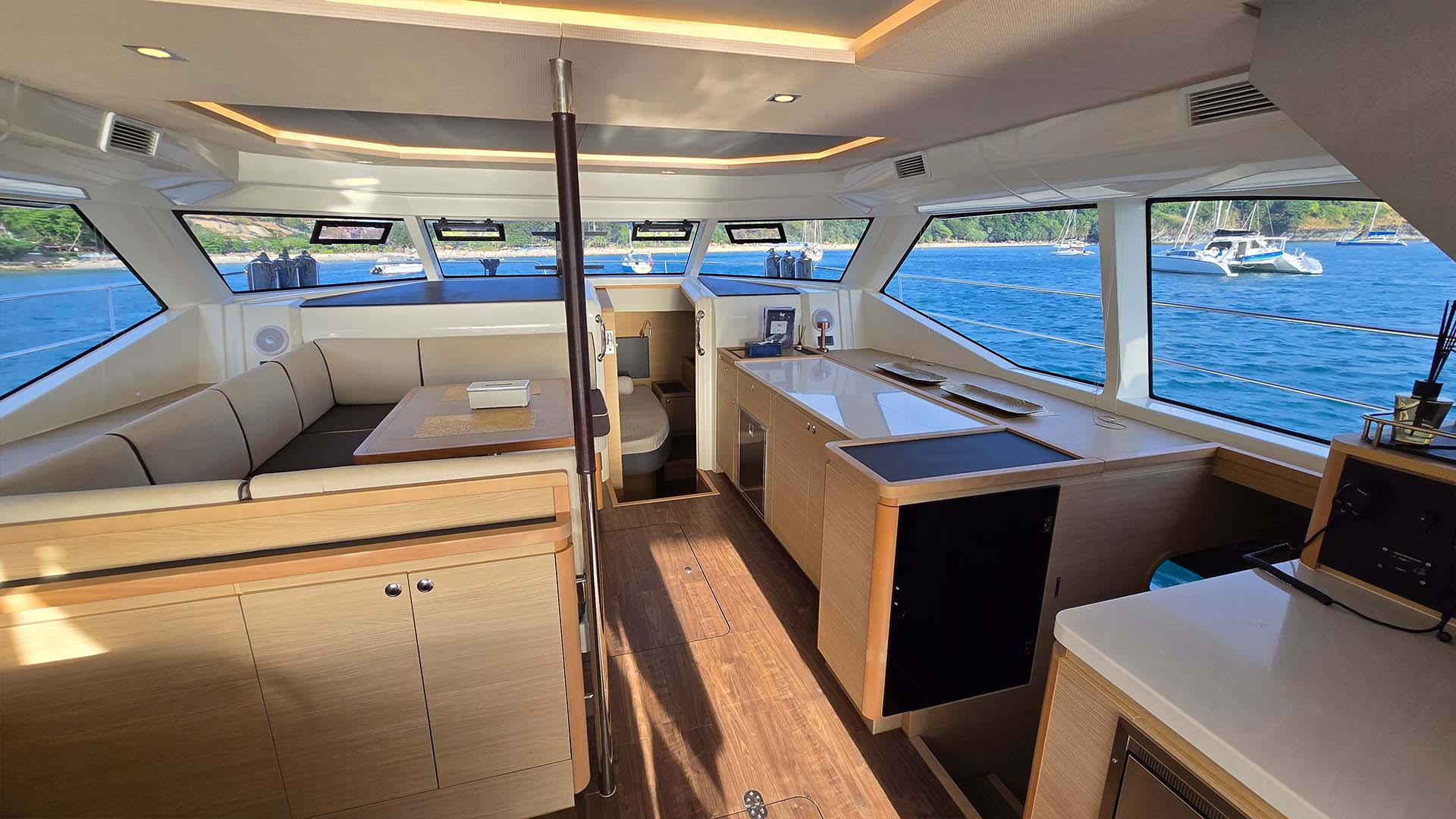 Большой открытый салон с панорамным остеклением создает ощущение единения с морем. Светлая отделка, белые потолки, большие окна, все направлено на создание воздушного пространства. Из салона вы видите все: и кухню, и кокпит, и море вокруг. Это создает ощущение единого пространства, где все находятся вместе.