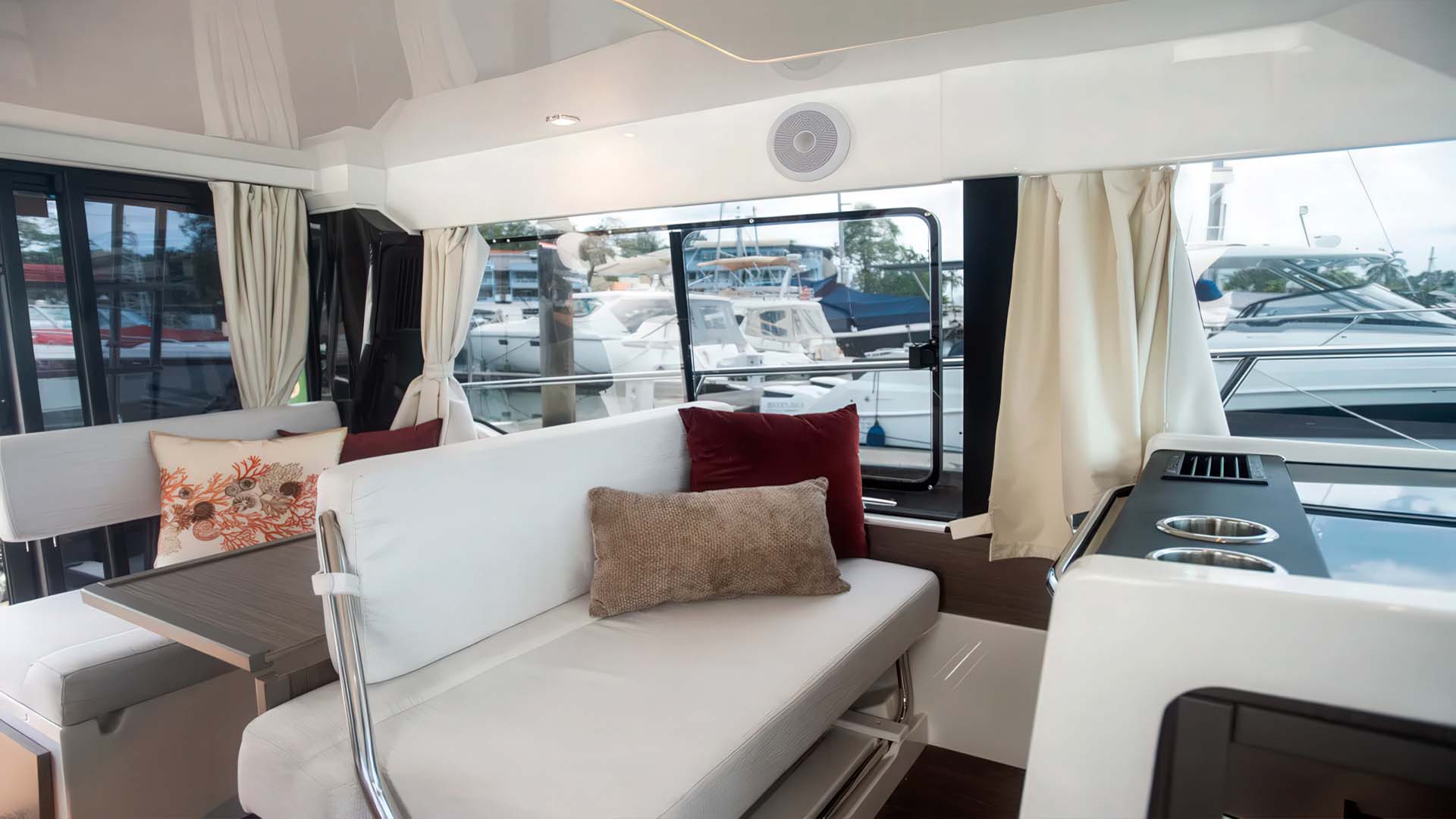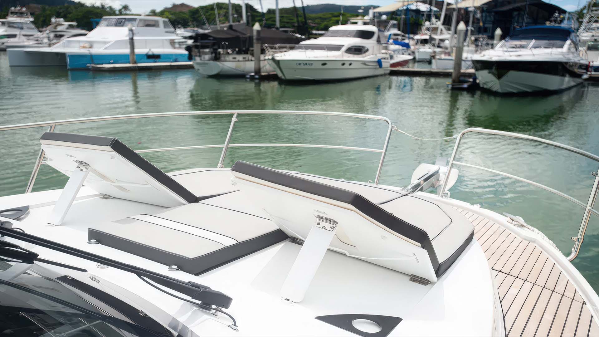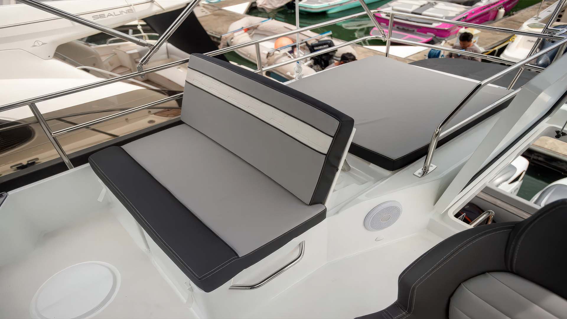 Редкая опция для 34-футовой яхты: зона отдыха на трансформирующимися шезлонгами, меняющими уровень наклона. Защищённое пространство для релакса во время якорной стоянки или движения на малом ходу.