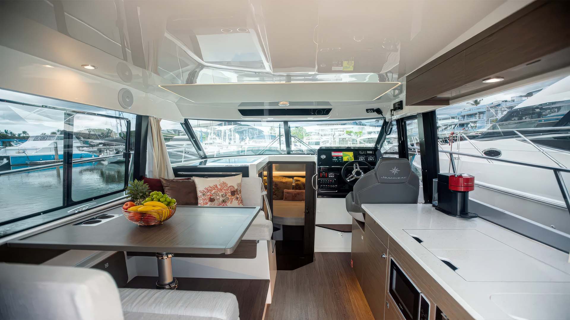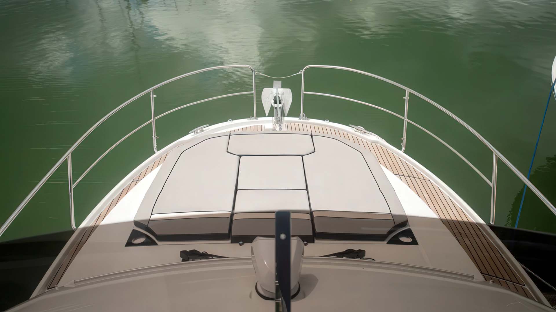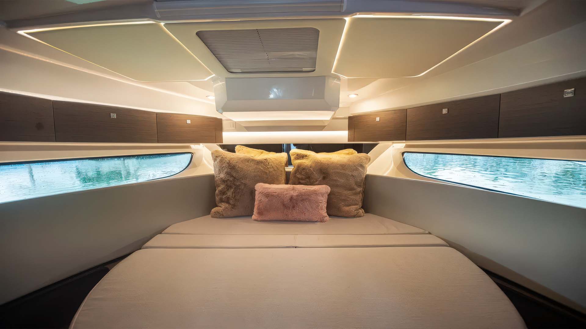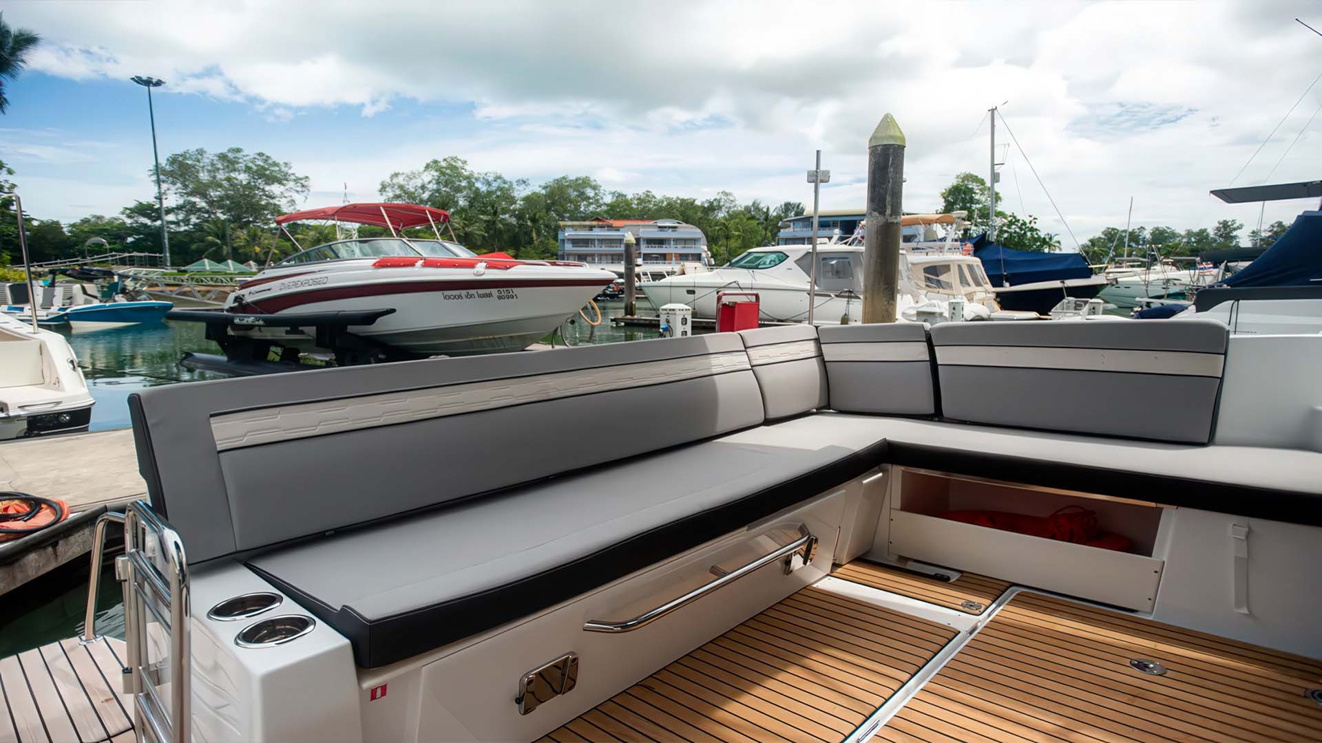 Редкая опция для 34-футовой яхты: зона отдыха на трансформирующимися шезлонгами, меняющими уровень наклона. Защищённое пространство для релакса во время якорной стоянки или движения на малом ходу.