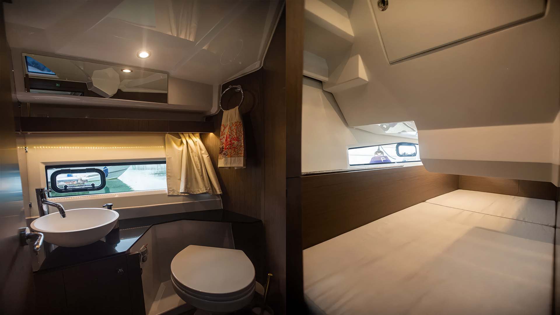 Носовая мастер-каюта: двуспальная кровать с трансформацией, иллюминаторы, встроенные шкафы. Достаточно места для вещей на 3-5 дней круиза.