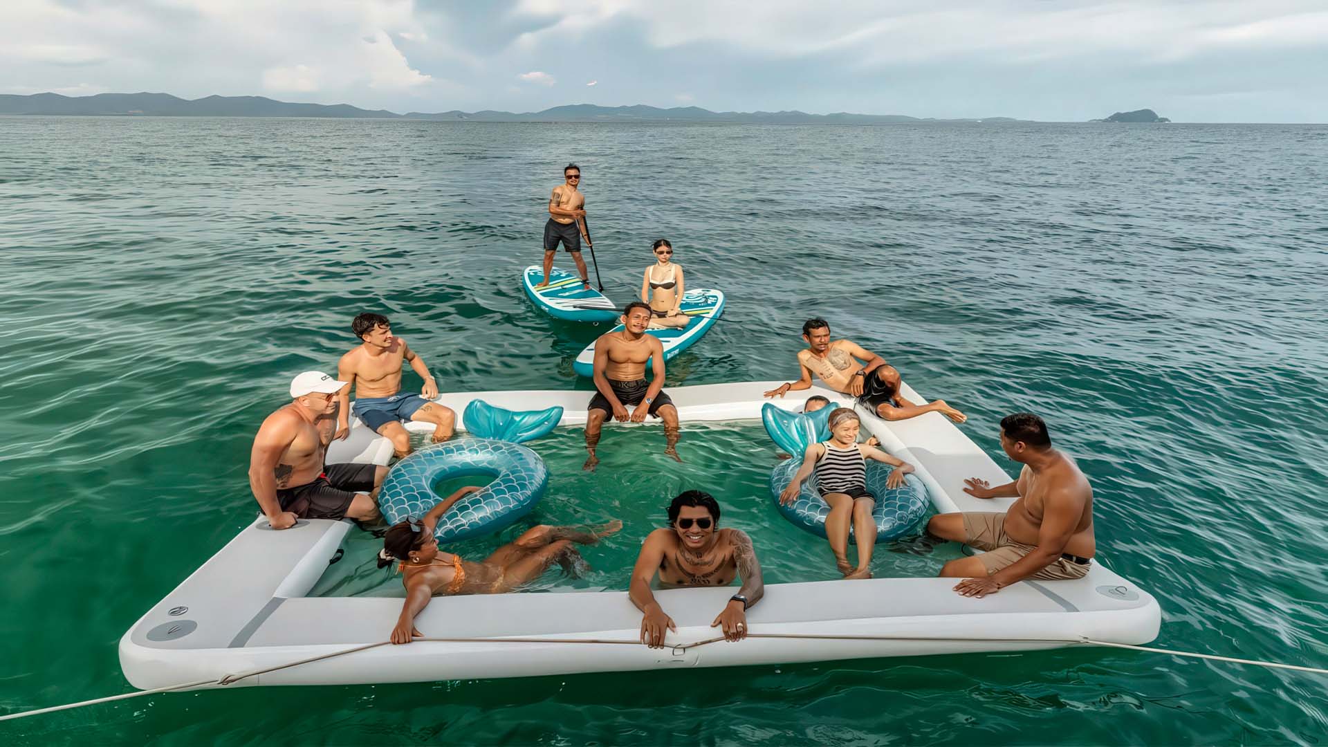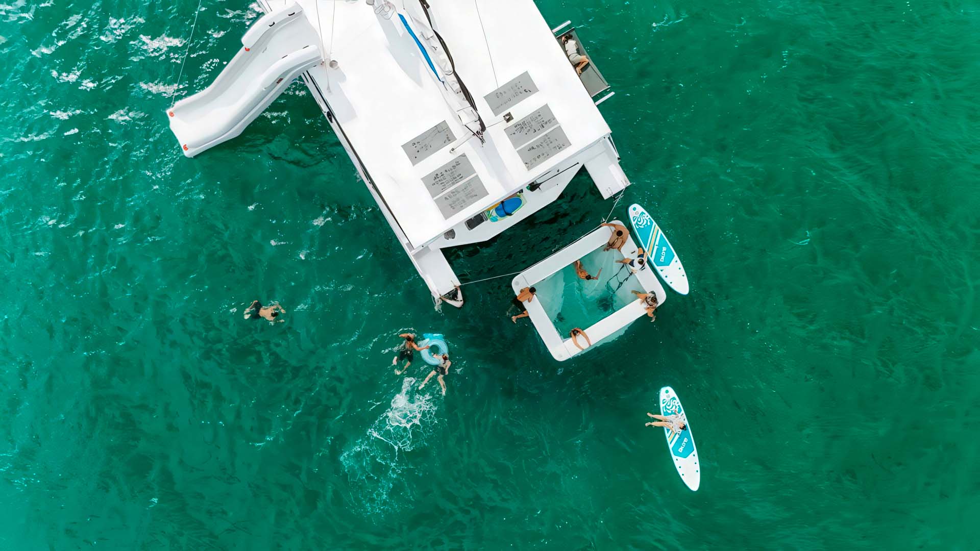 Inflatable pool - один из самых популярных элементов не только на Satisfaction 55, но и на многих мега яхтах. Это большой надувной бассейн, который команда ставит спускает прямо на воду, рядом с катамараном. Представьте: вы в бассейне, который плавает в море, мета-плавание. Идеально для тех, кто хочет освежиться, но не готов нырять в открытое море (вдруг там медузы или что-то ещё). Дети от него без ума и взрослые с коктейлями в руках тоже. По периметру бассейна, широкие борта, на которых можно просто посидеть или лечь позагорать.