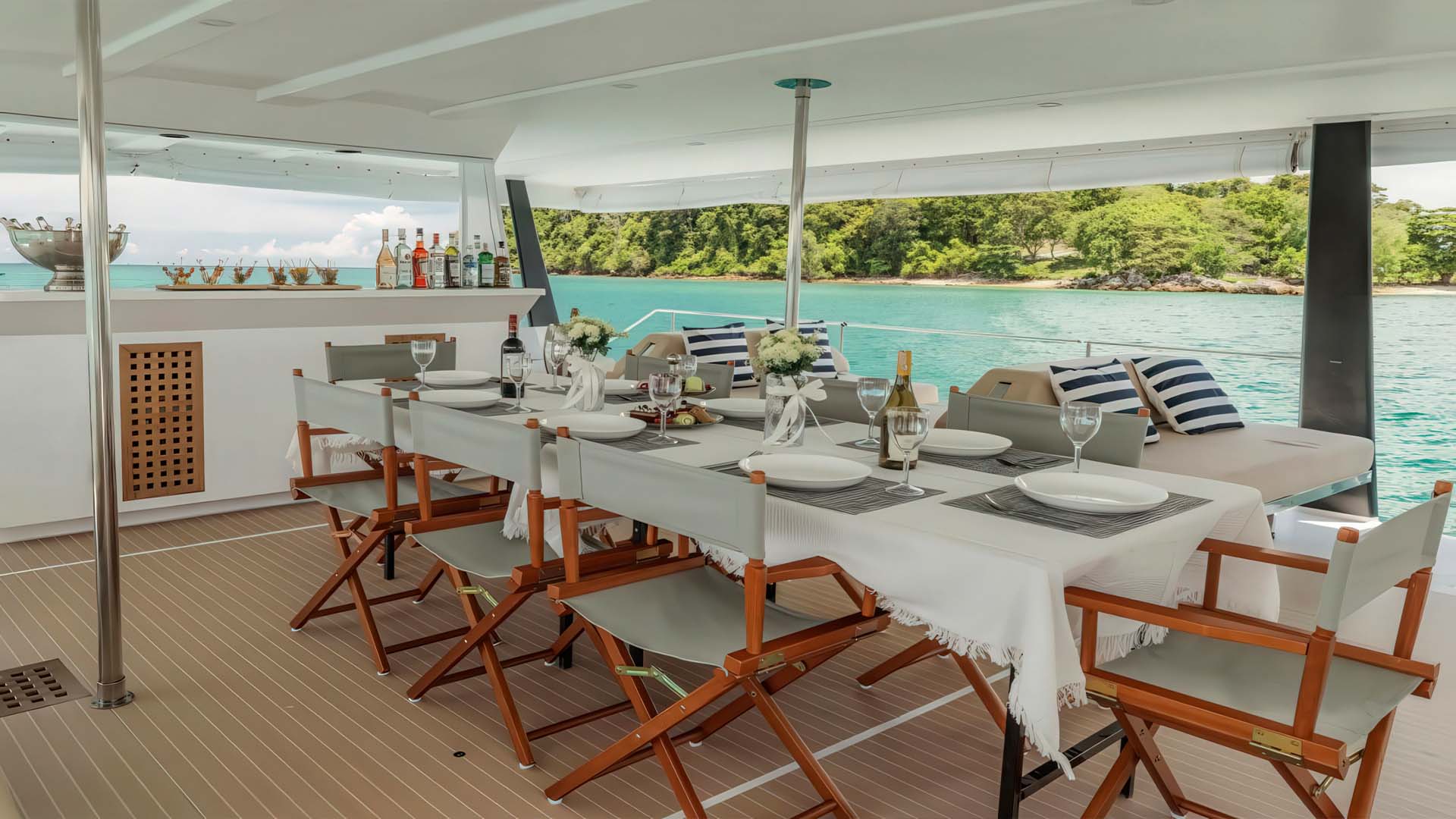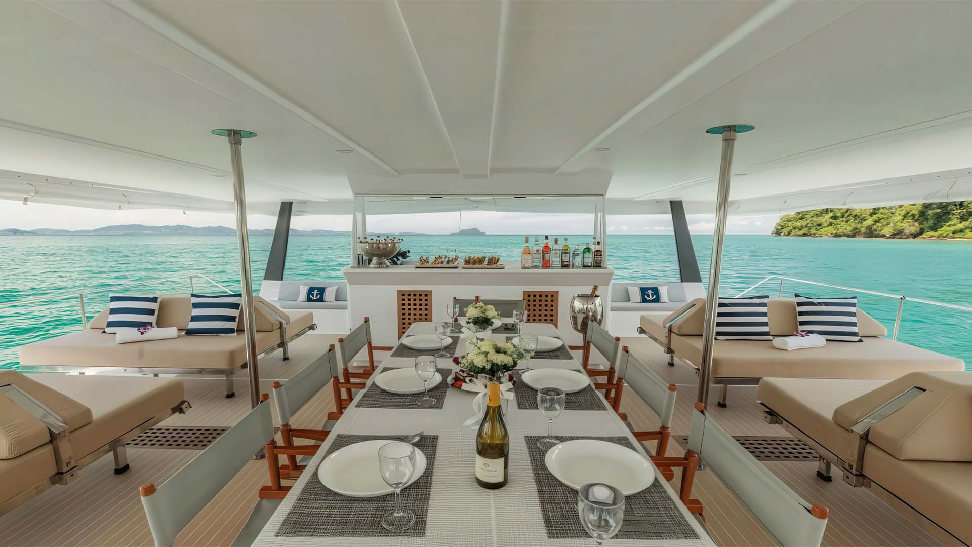Широкая платформа на уровне воды - это ваш личный пляж. Спрыгивайте прямо в воду, возвращайтесь по удобной лестнице, никаких высоких бортов, с которых страшно прыгать, никаких канатов, по которым нужно карабкаться обратно. Здесь же хранится Dinghy boat - надувная лодка с мотором для трансфера на берег, если захотите посетить какой-то остров или пляж, куда катамаран не может подойти вплотную.