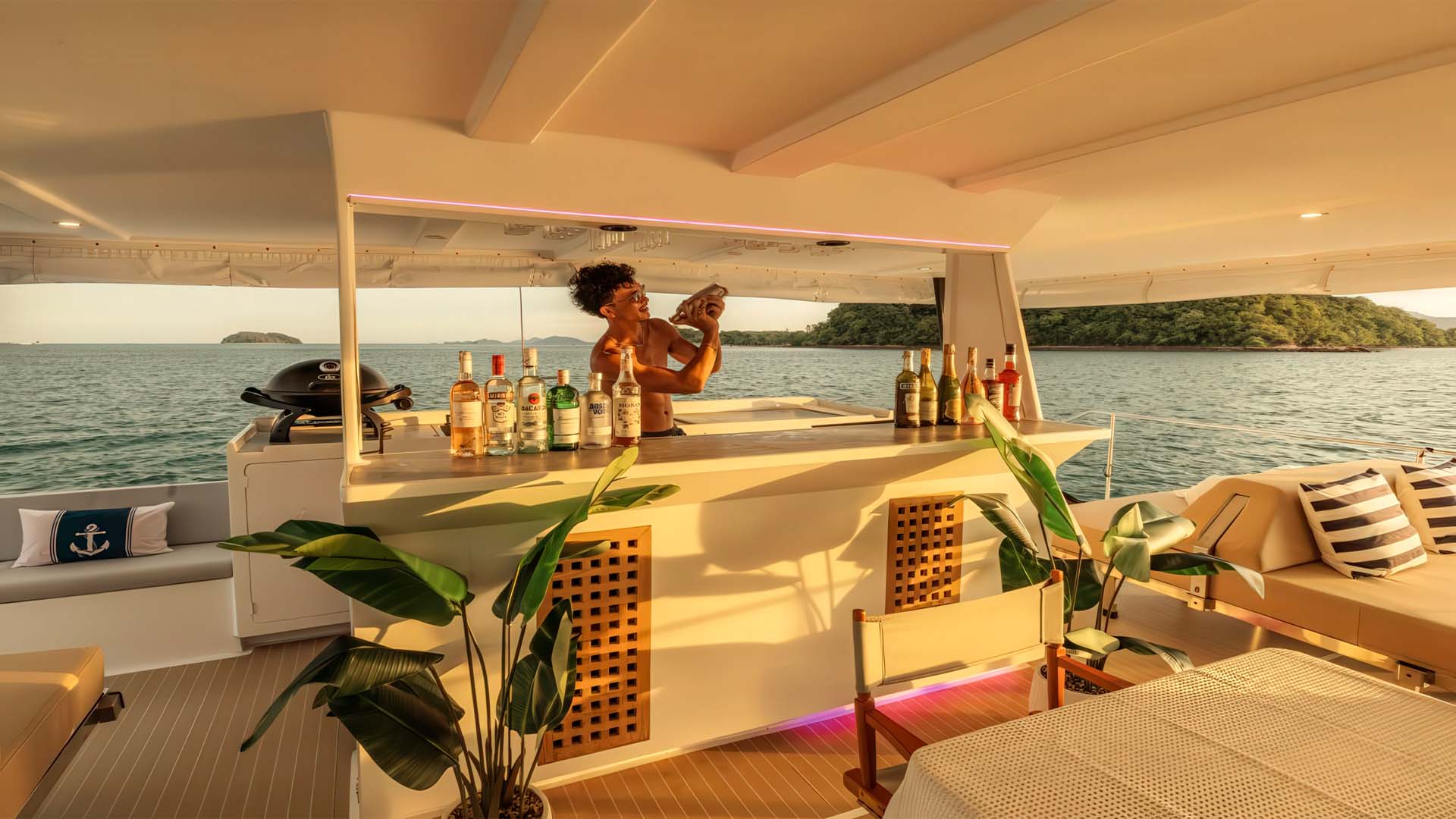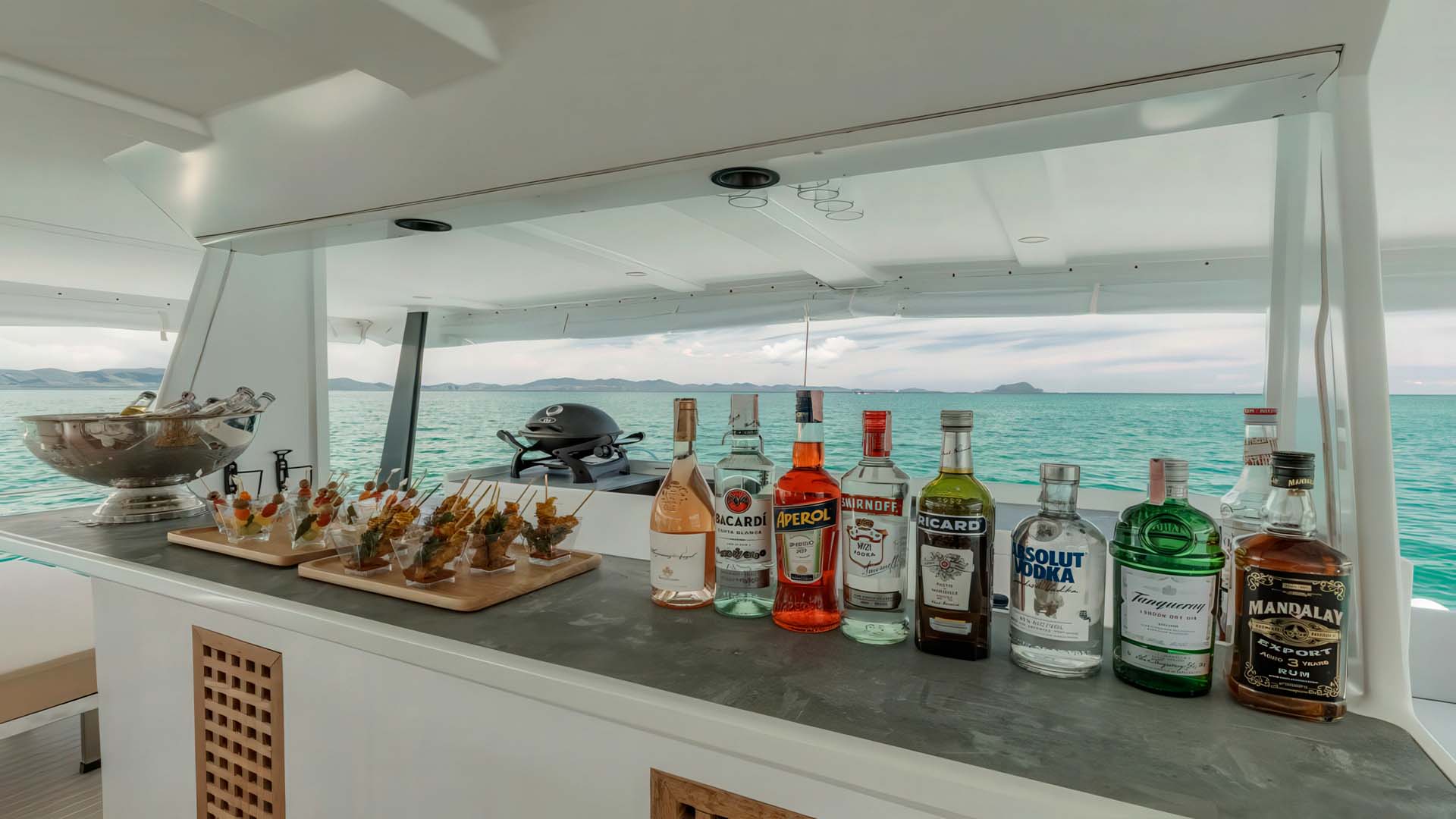 Бар оборудован всем необходимым: лёд, миксеры, бокалы, шейкеры. Алкоголь не входит в стоимость чартера, но вы можете привезти свой или купить на борту. Безалкогольные напитки включены в стоимость аренды: кола, спрайт, вода. Это значит, что базовые напитки у вас есть всегда, и если хотите что-то покрепче, добавляете сами. Так же в стоимость включены: тропические фрукты и легкие закуски: орешки, чипсы, снеки и т.п.
