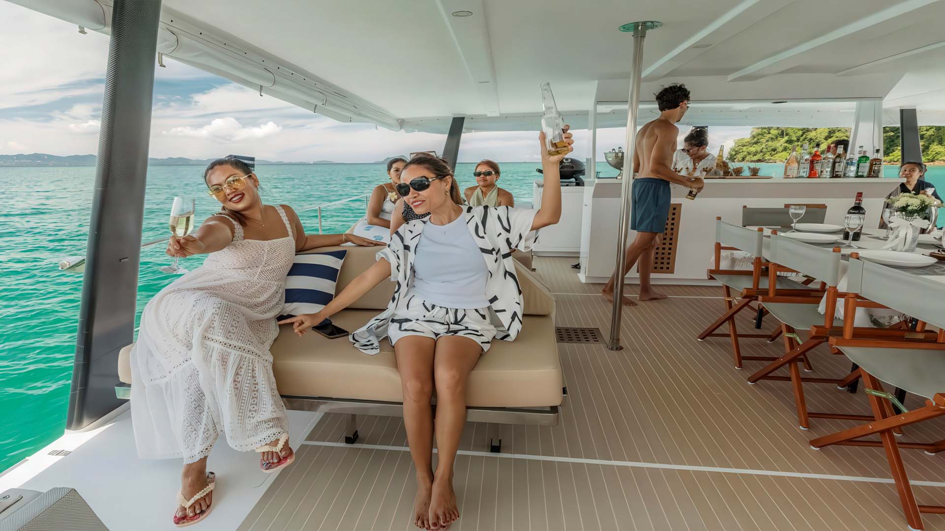 Передняя палуба - идеальное место для фотосессий: девушки в купальниках на фоне бирюзовой воды, парни с бокалами на закате, групповые селфи, где все помещаются в кадр. Здесь же расположен один из столов, где вы можете перекусить или выпить чашечку кофе или чего-то покрепче.