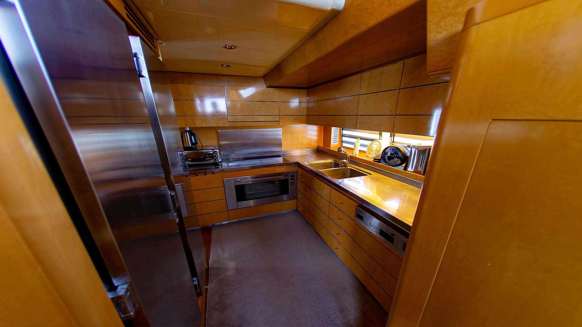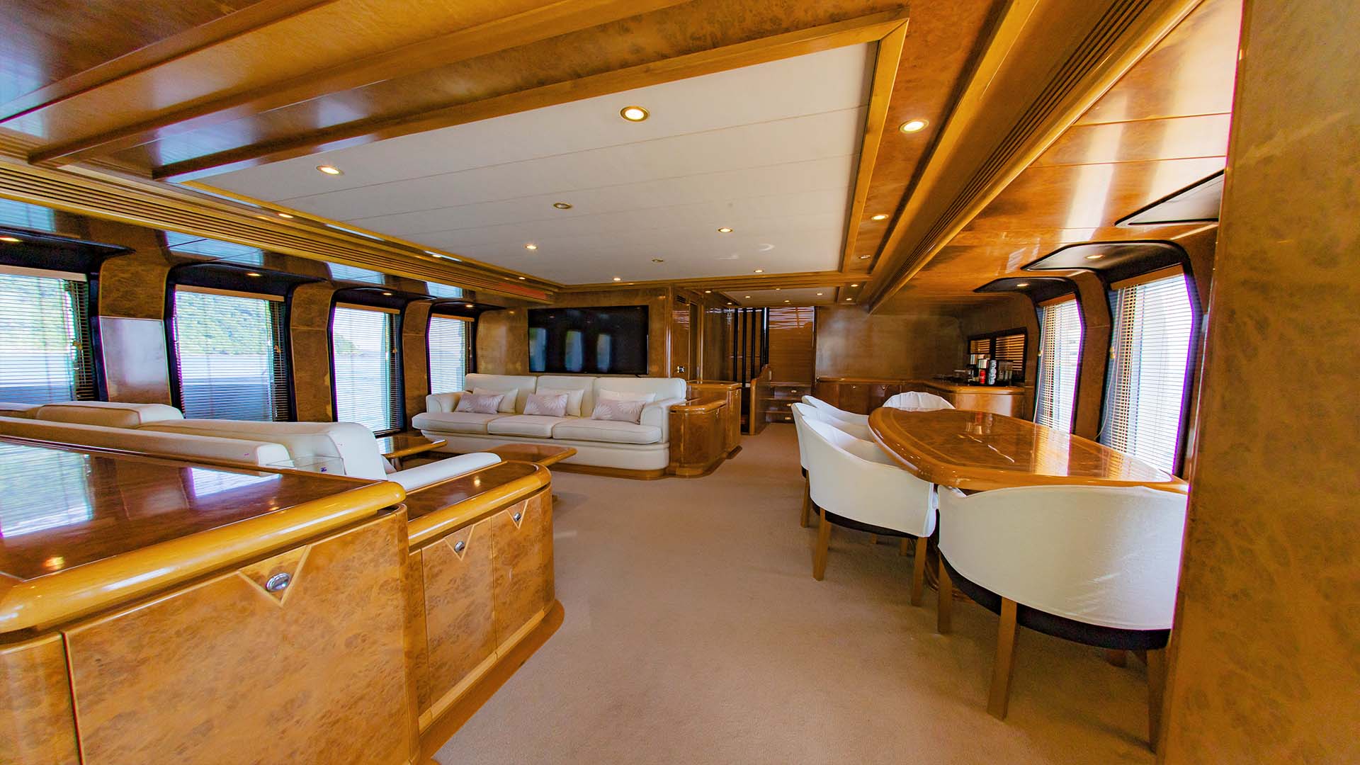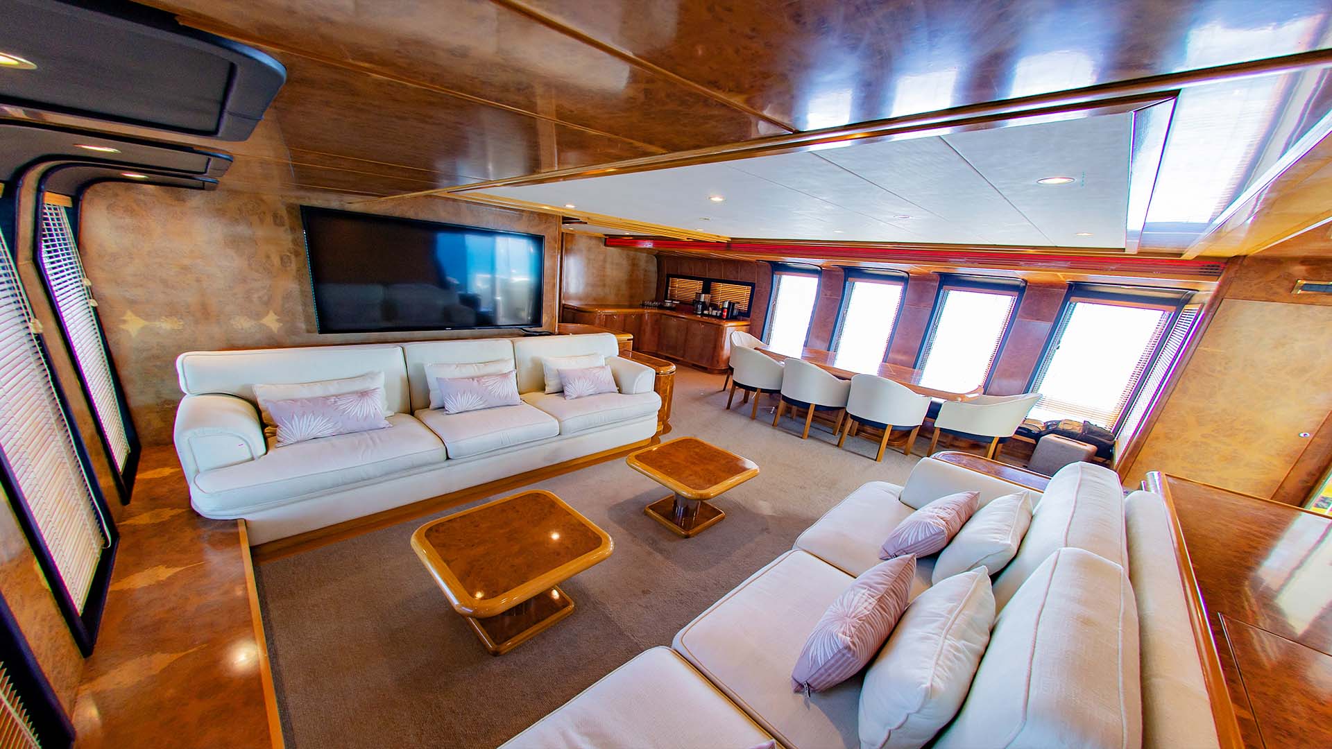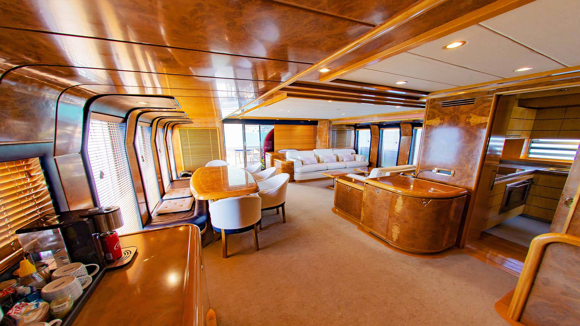 На борту яхты есть просторная гостиная зона, где гости могут отдыхать и наслаждаться красивым видом на море. Кроме того, на яхте есть кухня и бар, где гости могут заказать различные напитки и блюда.