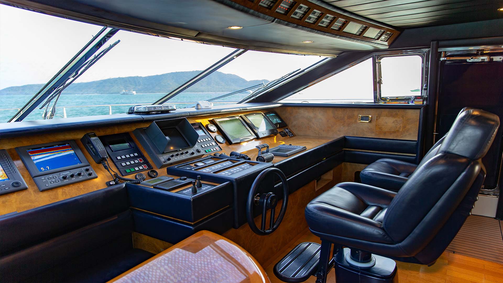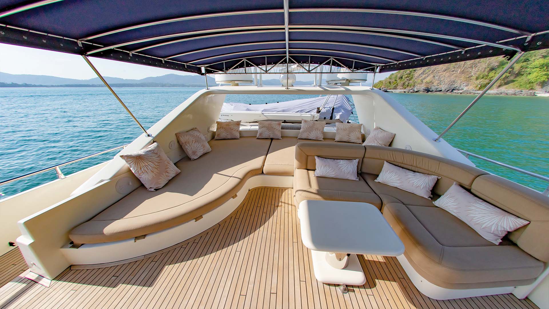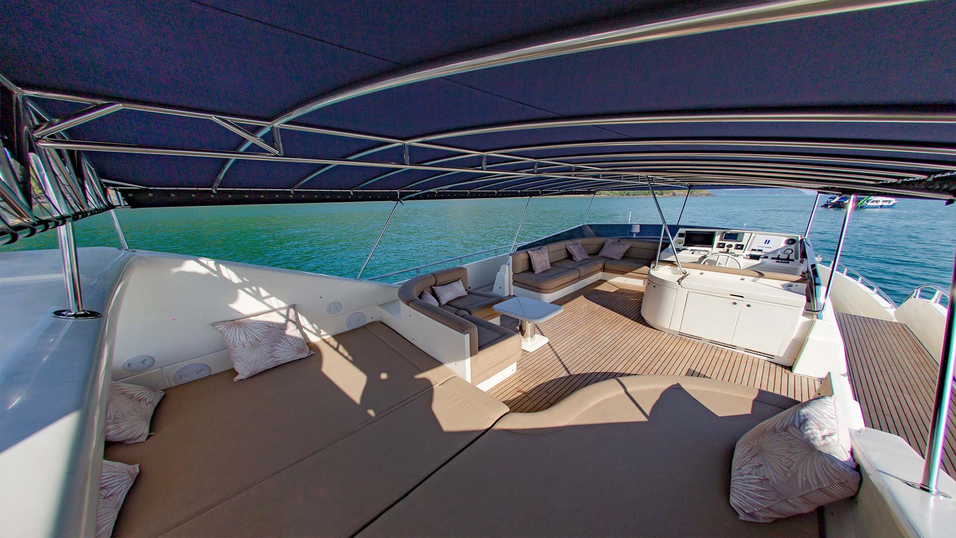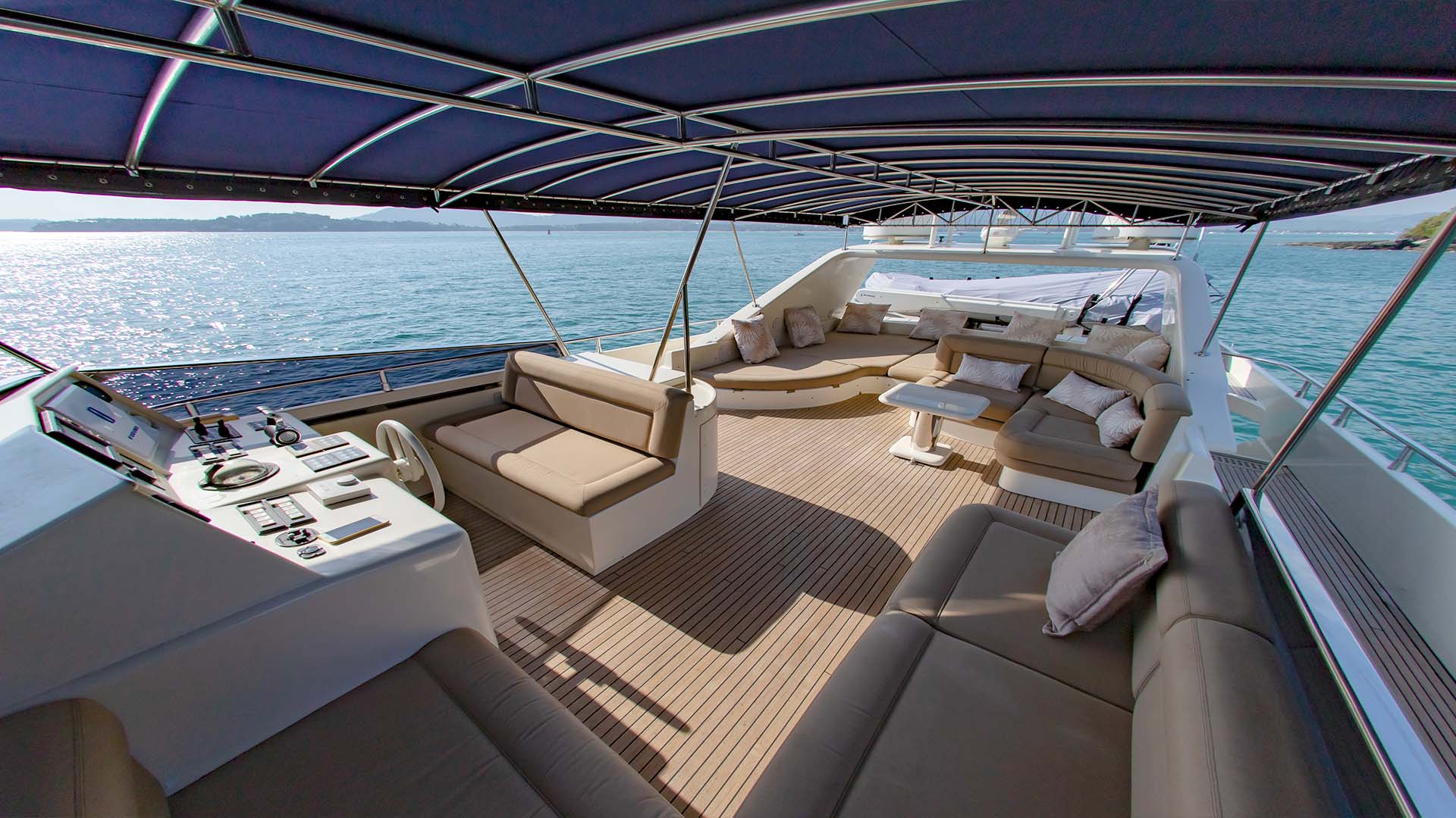 Среди других удобств яхты - большая терраса на флайбридже, на которой можно загорать и наслаждаться красивыми видами, а также просторная палуба, где можно провести время на свежем воздухе и насладиться бризом морского ветра.