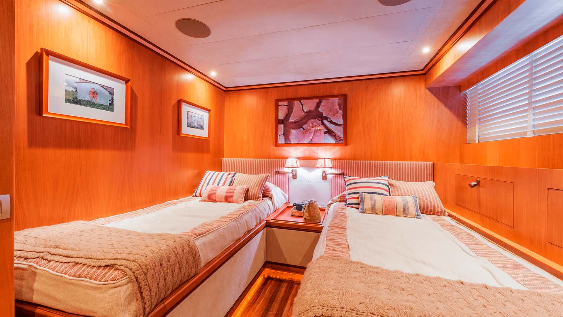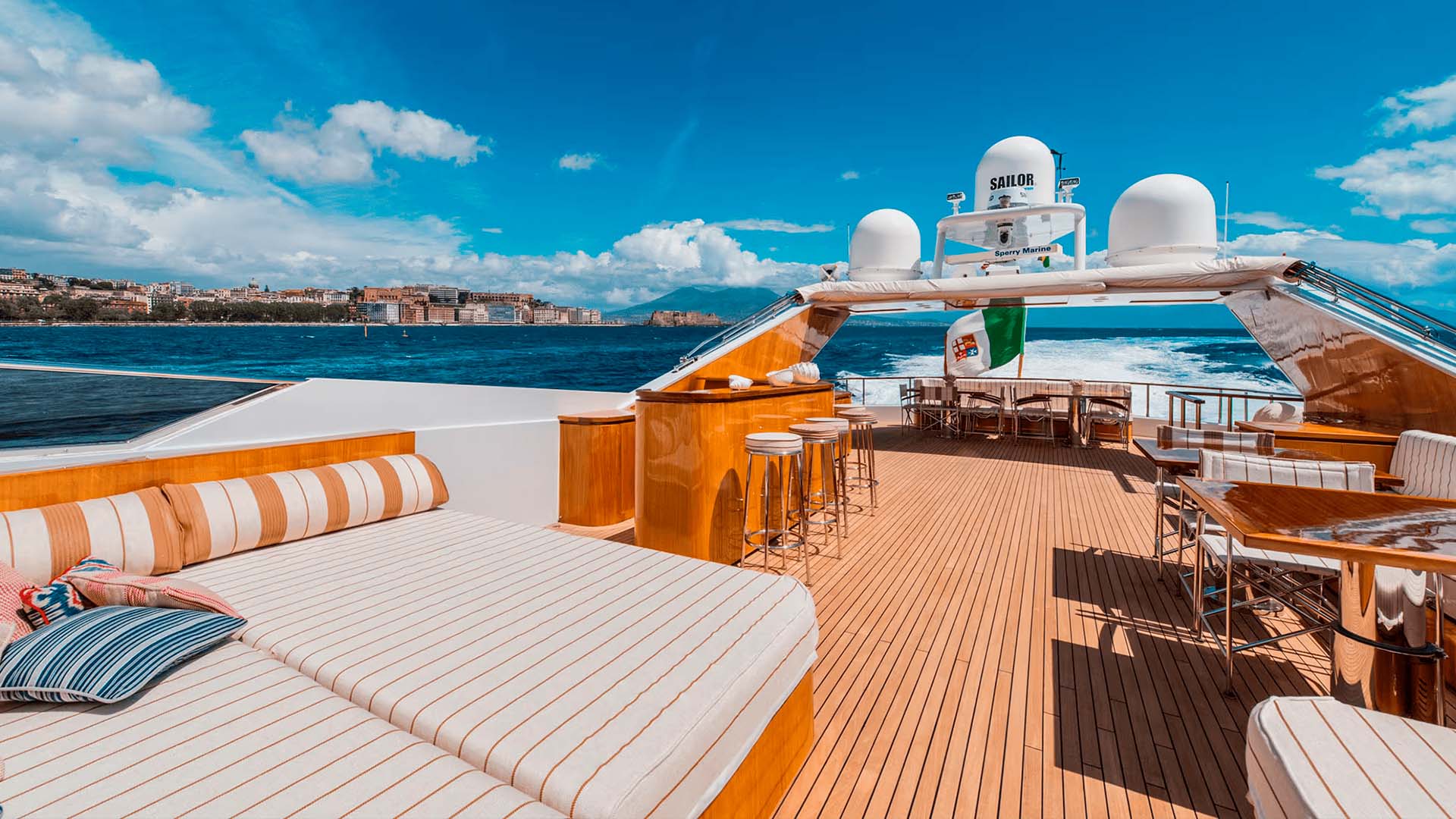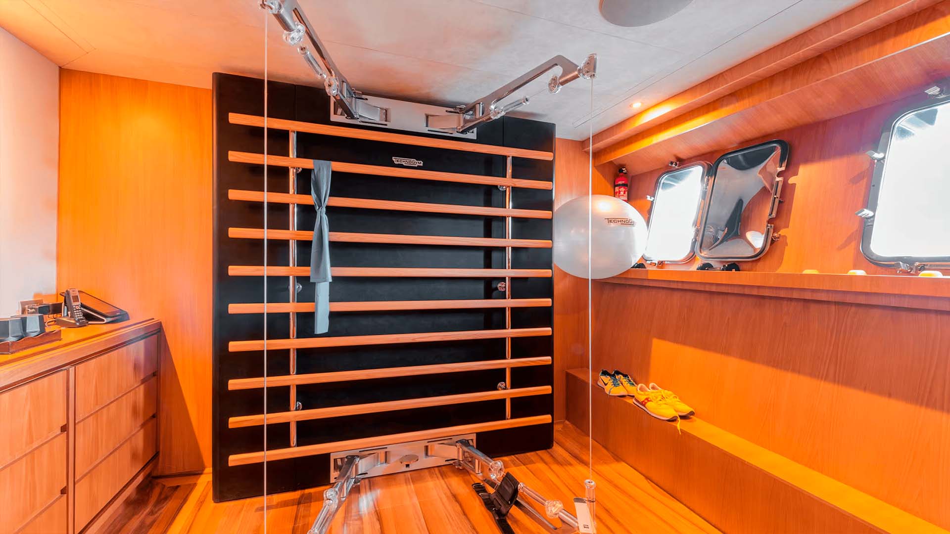 На борту — 5 основных кают: 3 двойные, 2 твин и одна односпальная. Да, здесь свободно разместятся до 10 гостей (или 11, если кто-то захочет уединения). Интерьеры — это баланс между природной теплотой и современным комфортом. Никакого холодного люкса — только уют, вкус и внимание к деталям. Но яхта Castagnola 125 берёт не только дизайном. У неё три палубы, включая потрясающую верхнюю террасу площадью 65 м² — здесь завтраки у горизонта превращаются в ритуал, а закаты — в немое кино с лучшим обзором. Wi-Fi, стабилизаторы и кондиционирование — разумеется. А ещё — полноценный тренажёрный зал, если рука всё же потянется к штанге даже в отпуске.