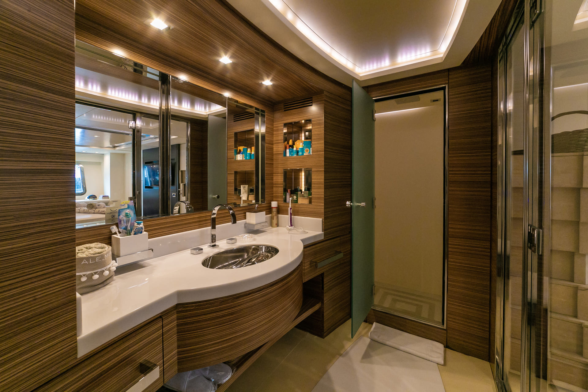 Максимальная скорость до 41 узла — это, если по-простому, почти 76 км/ч по воде. И не просто «может», а делает это с удовольствием: два двигателя MTU по 2.400 л.с. и система Arneson Surface Drive обеспечивают идеальный баланс между мощью и управляемостью. Крейсерская скорость — 36 узлов, и это, честно говоря, больше, чем нужно, но меньше не хочется. Запас хода — до 400 миль. Но скорость — это только часть истории. Вторая — комфорт.