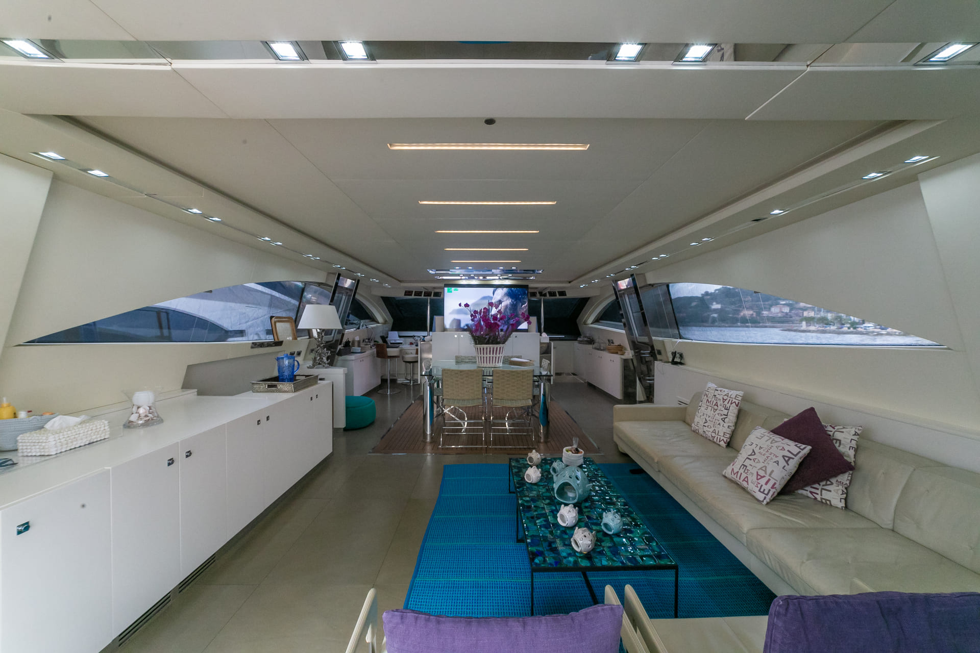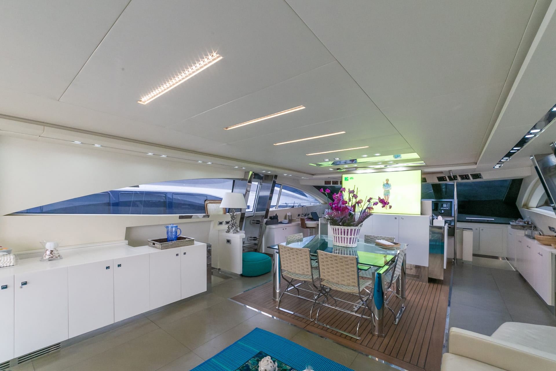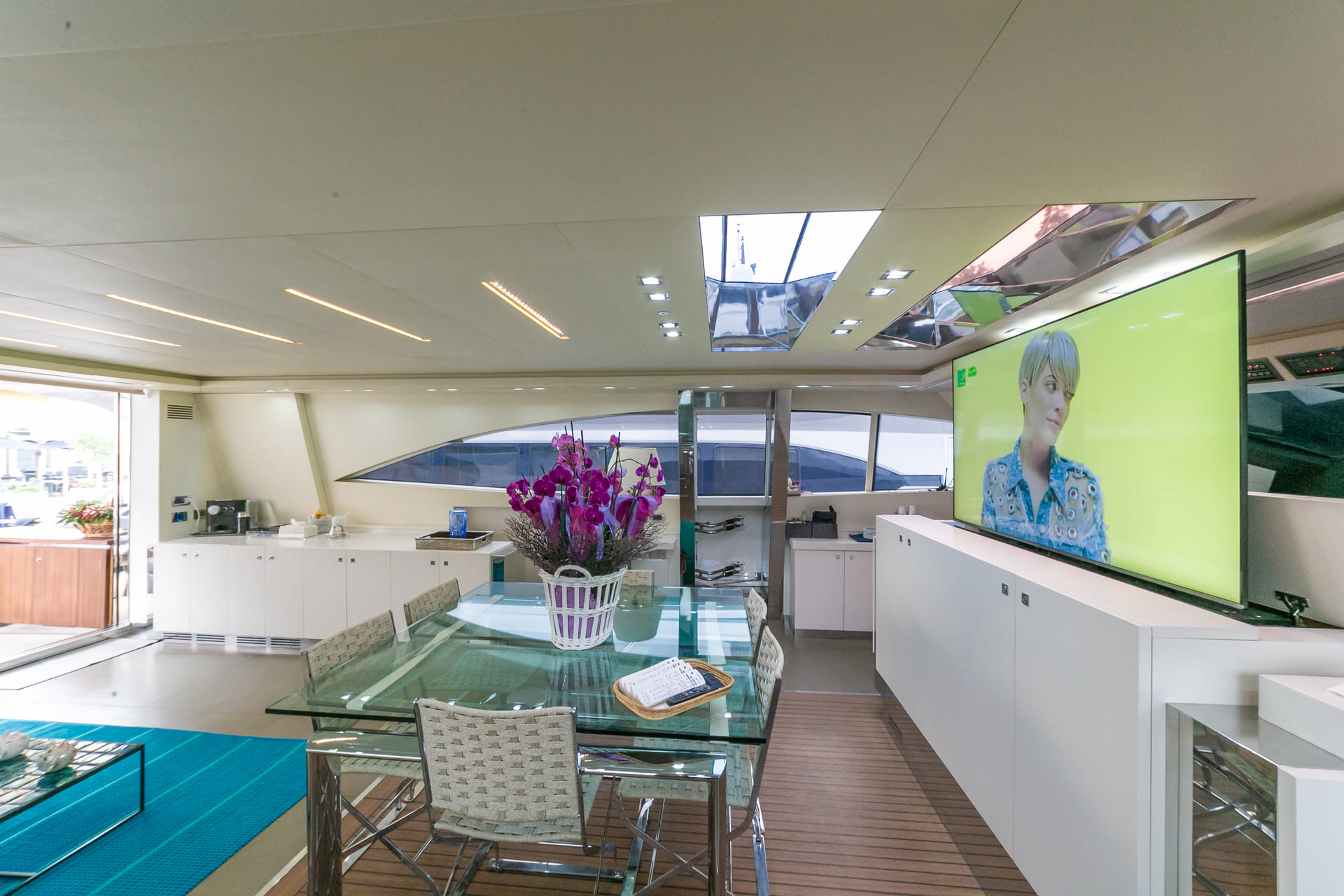 На борту — все, чтобы вы не вспоминали, что находитесь не в пятизвёздочном отеле, а посреди моря. Просторная палуба 50 м², на которой с утра можно лениво потягивать кофе под мягким солнцем, а вечером устраивать ужин под звёздами. В кормовой части — большой лежак и мягкий диван. По центру — обеденная зона с C-образной софой и выдвижным столом на 8–10 человек, с баром и встроенным грилем. Всё это скрывается под автоматическим навесом, который при желании превращает открытую палубу в уютный тент. Пройдитесь по бортам — широкие проходы и высокие борта ведут на нос, где находится ещё одна лаунж-зона с видом на бесконечную воду: мягкие подушки, солнце и ощущение, будто весь мир остался где-то позади.