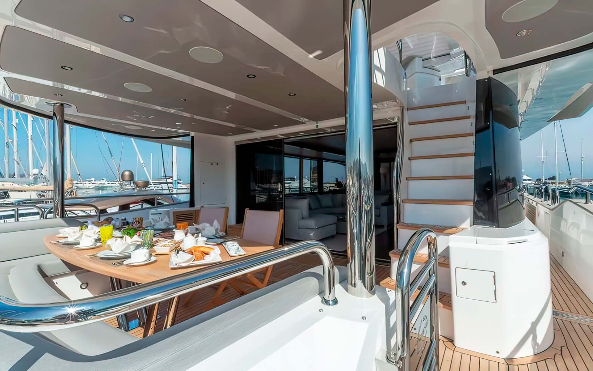 Спуститесь к корме, и здесь вас ждет приятный сюрприз, гидравлическая купальная платформа. Нажатие кнопки, и она опускается прямо к воде, превращаясь в ваш личный пляж. Дети безопасно входят и выходят из моря, взрослые запускают водные игрушки, а вечером платформа становится идеальным местом для созерцания заката в полной тишине. Представьте: солнце клонится к горизонту, вы лежите на платформе на уровне воды, и кажется, что весь мир принадлежит только вам. Волны мягко плещутся рядом, а где-то вдалеке горы итальянского побережья окрашиваются в золотистые тона.