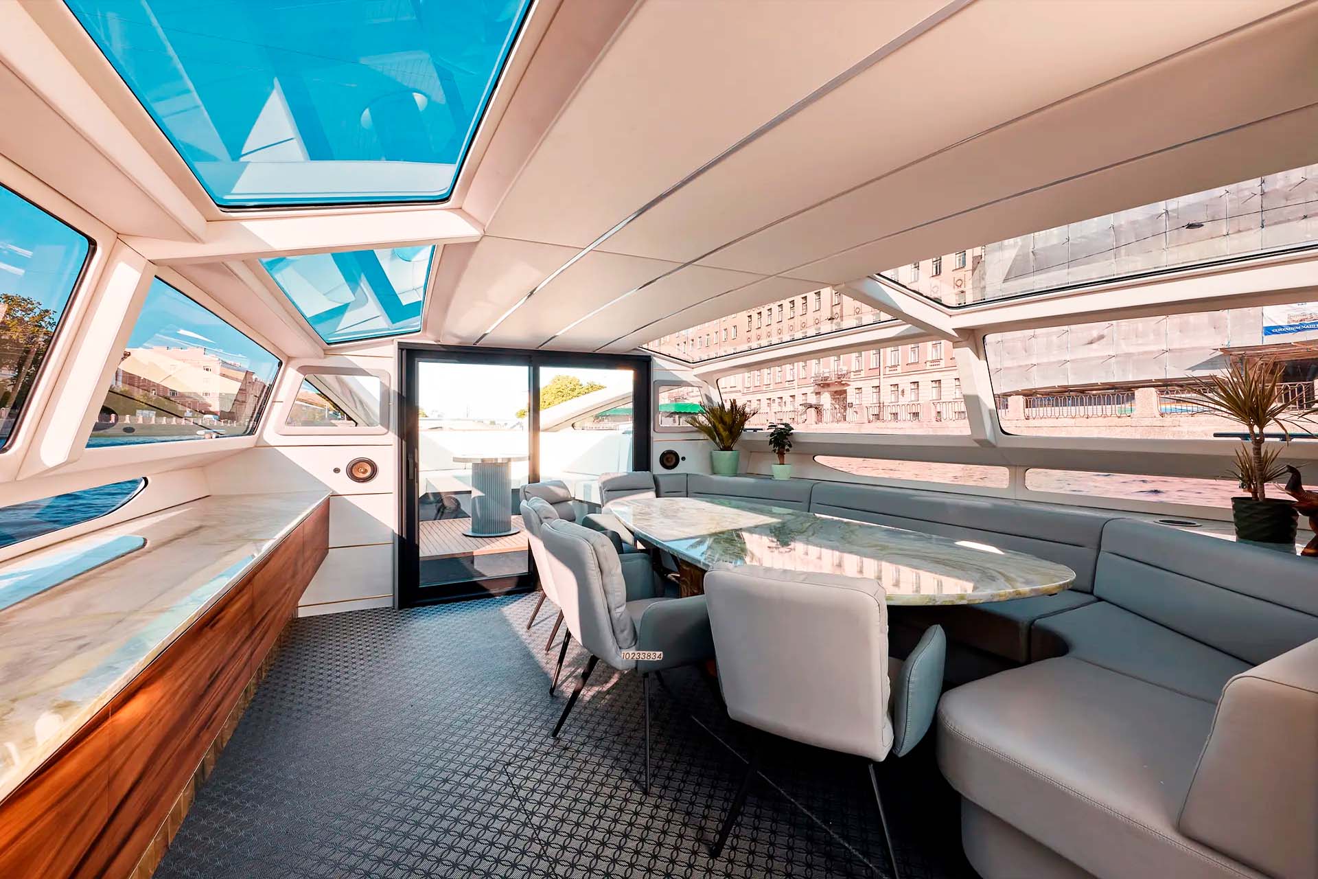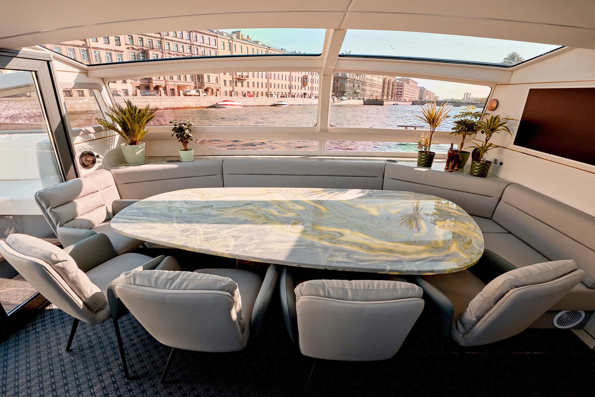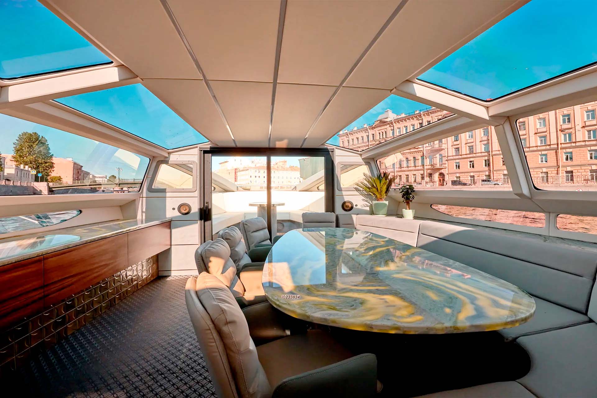 Просторный салон с панорамным остеклением создает ощущение единения с водной стихией. Благодаря высокой светопропускной способности окон, гости наслаждаются захватывающими видами Невы и каналов Северной Венеции в любую погоду.