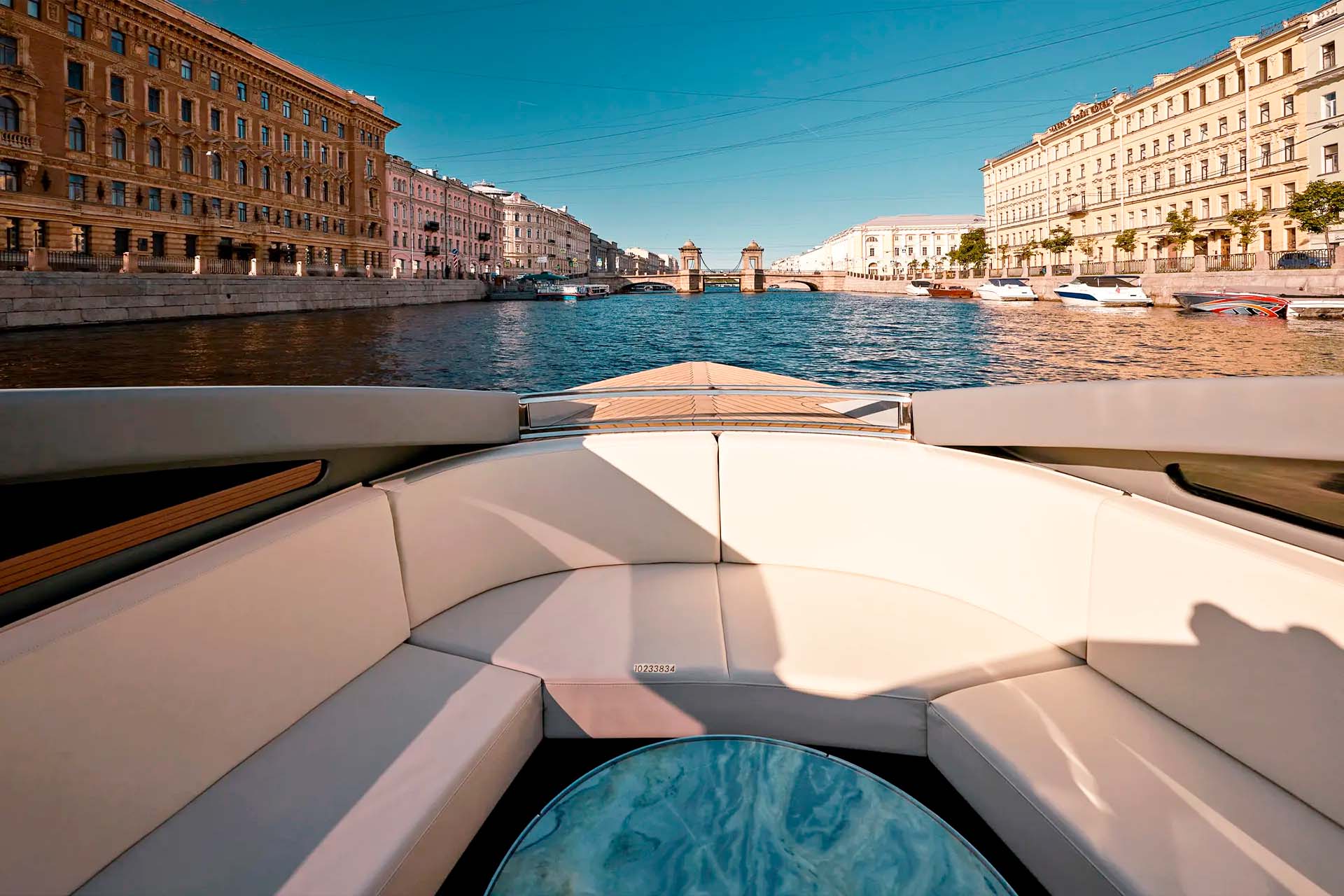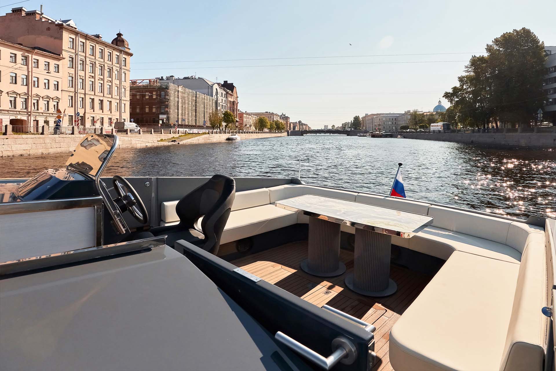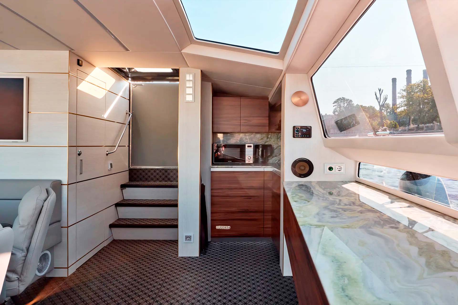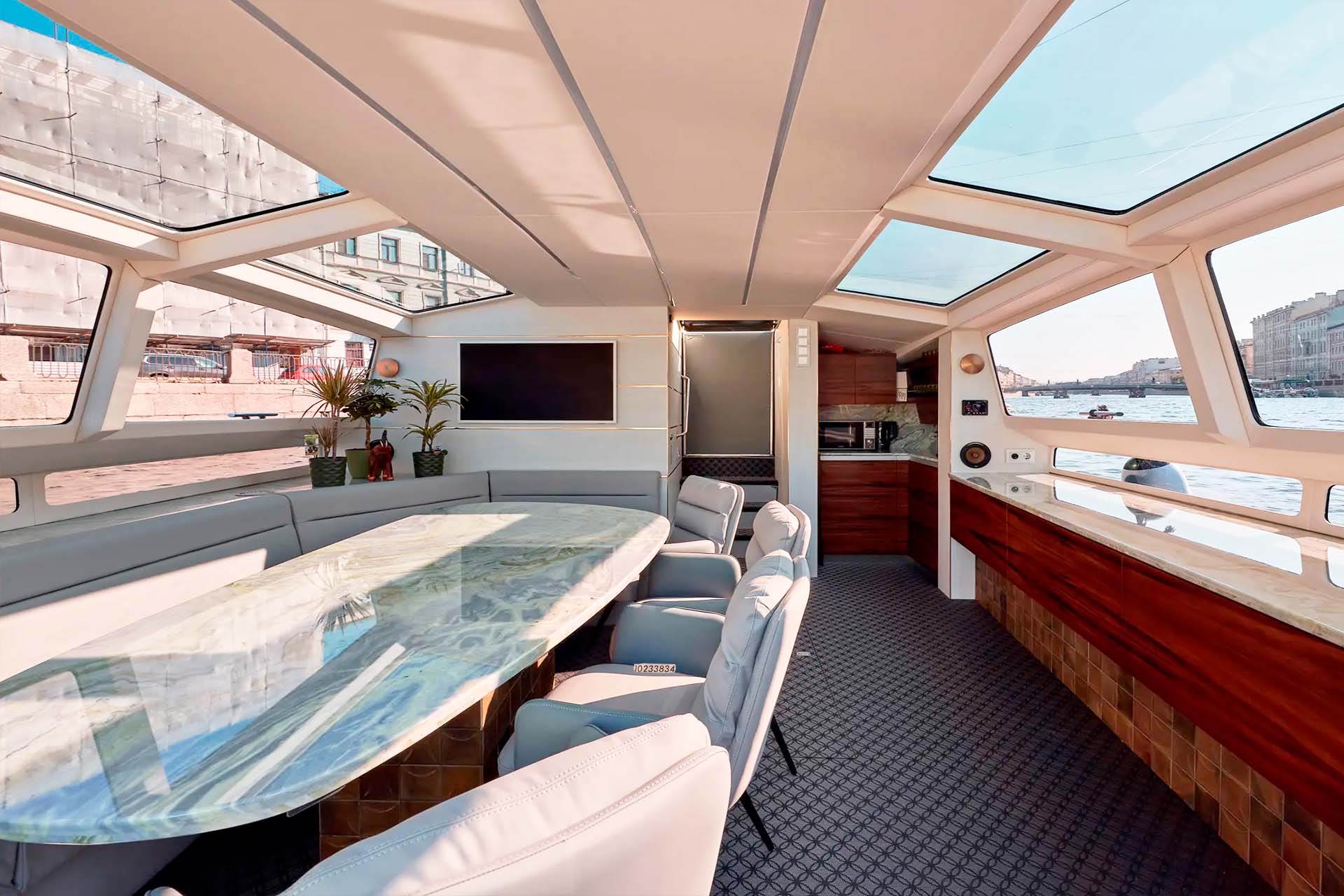 Просторный салон с панорамным остеклением создает ощущение единения с водной стихией. Благодаря высокой светопропускной способности окон, гости наслаждаются захватывающими видами Невы и каналов Северной Венеции в любую погоду.