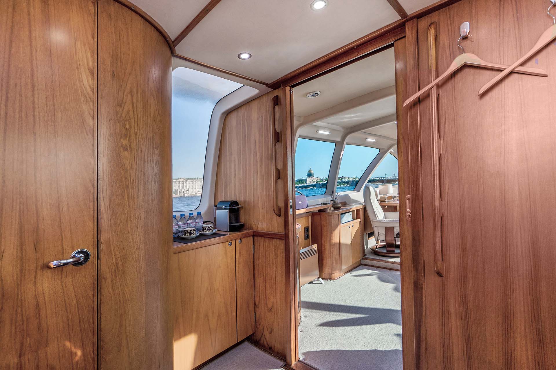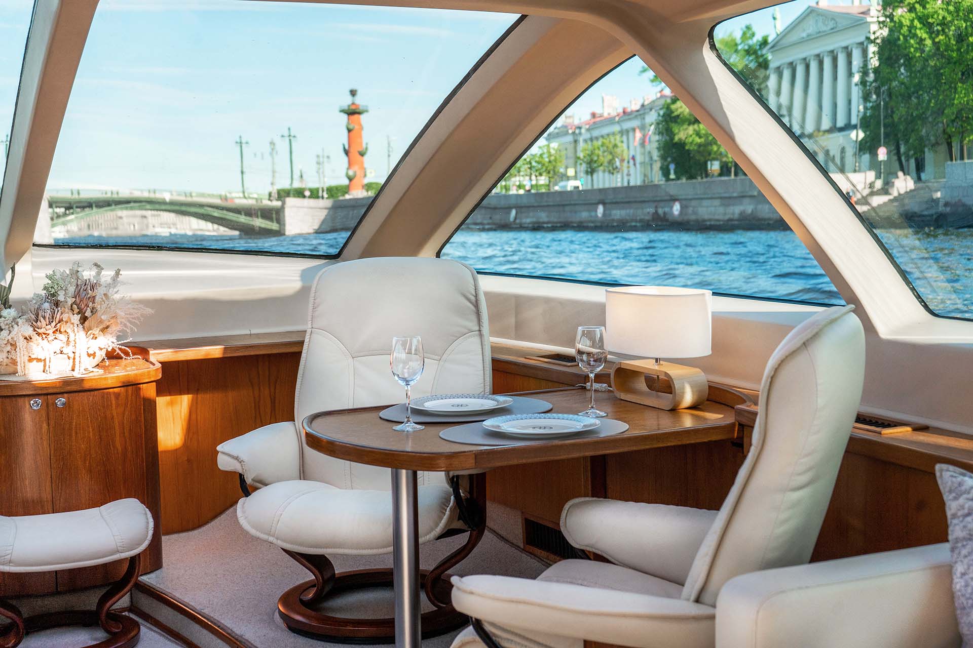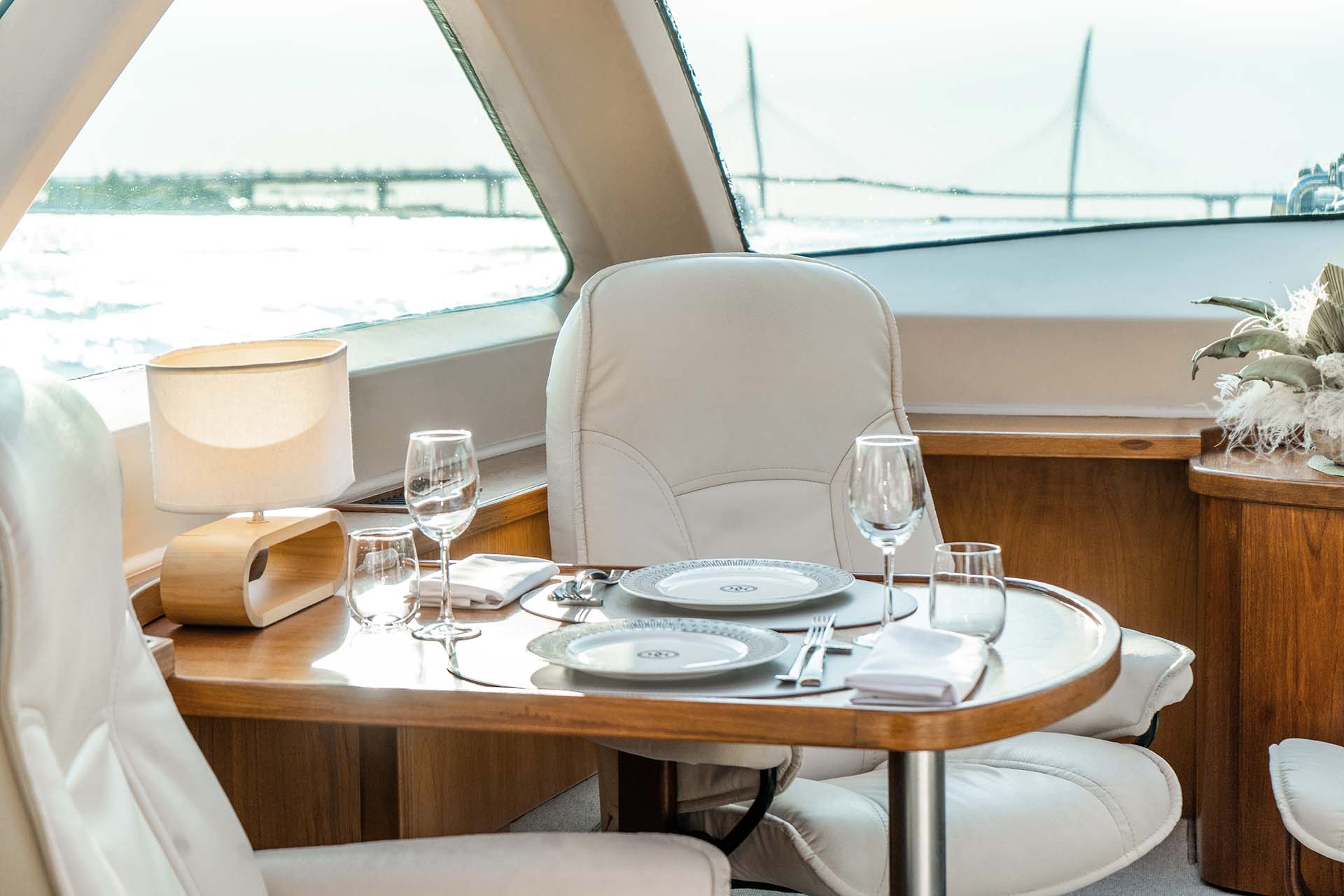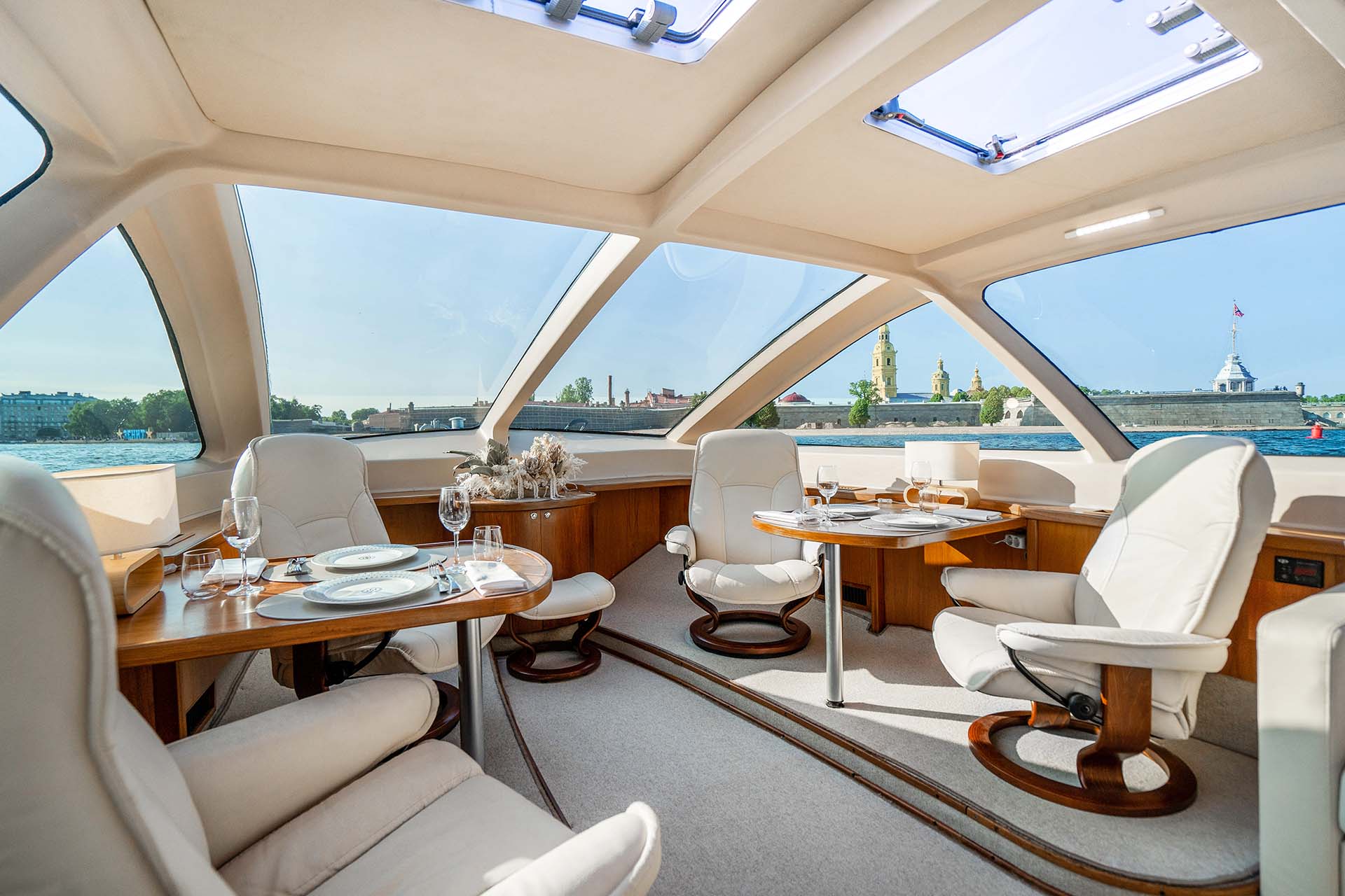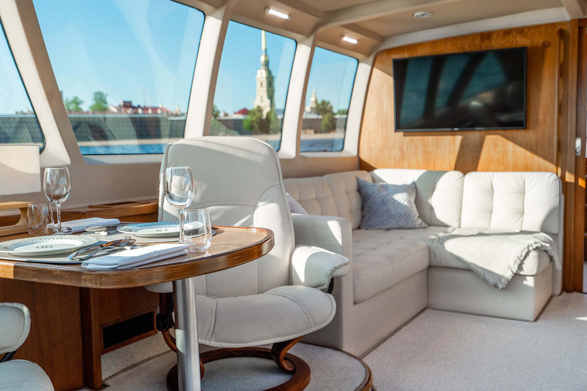 В носовой части — мягкие поворотные кресла и столики, где удобно и обсудить сделку, и выпить бокал вина на закате.