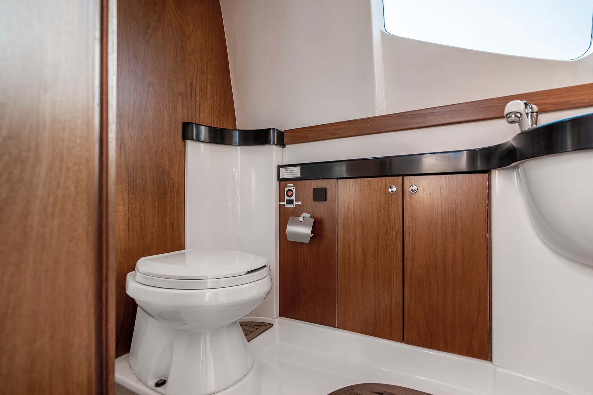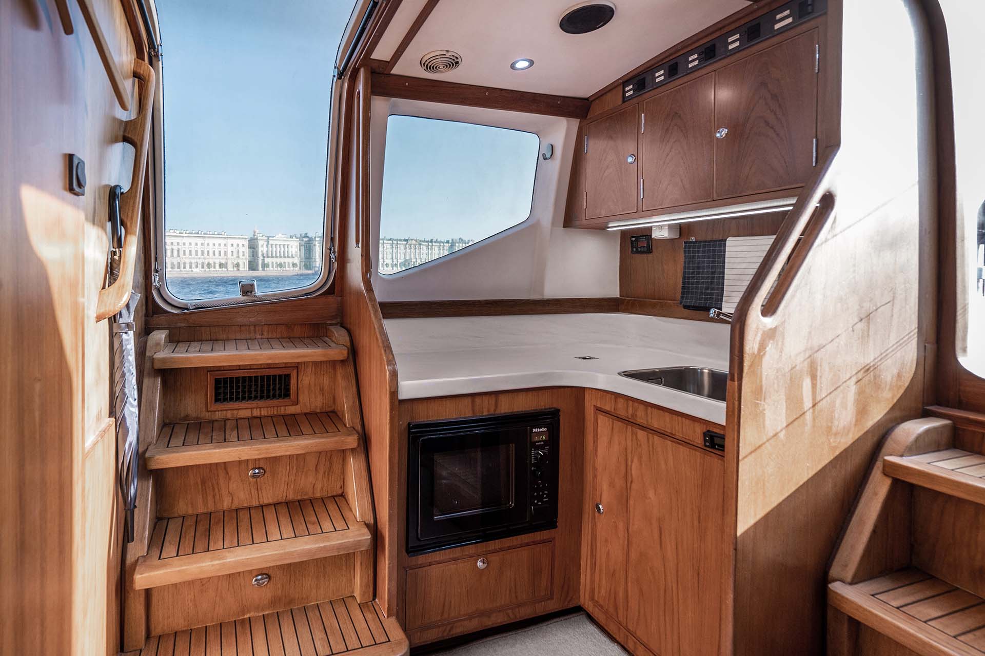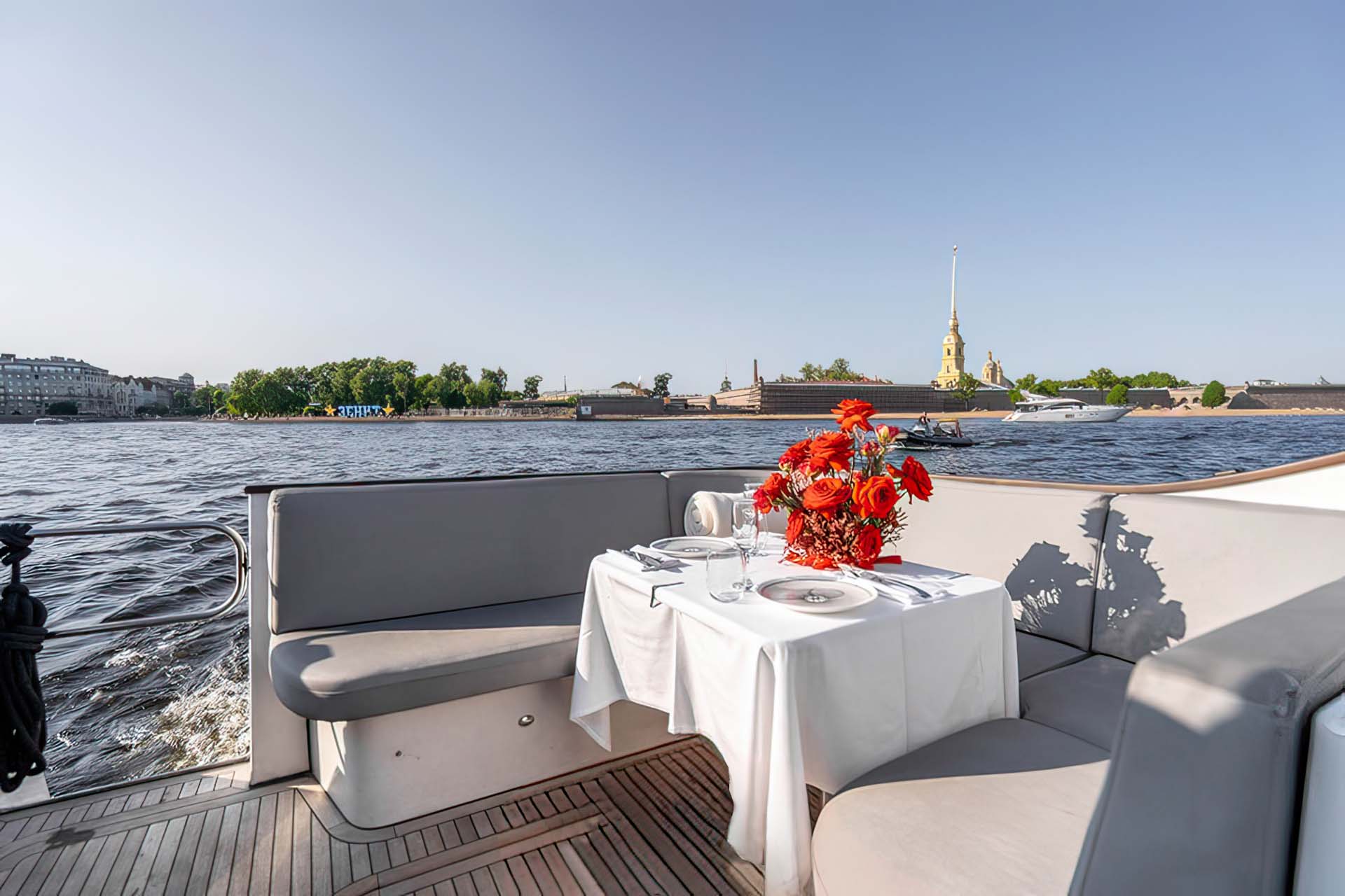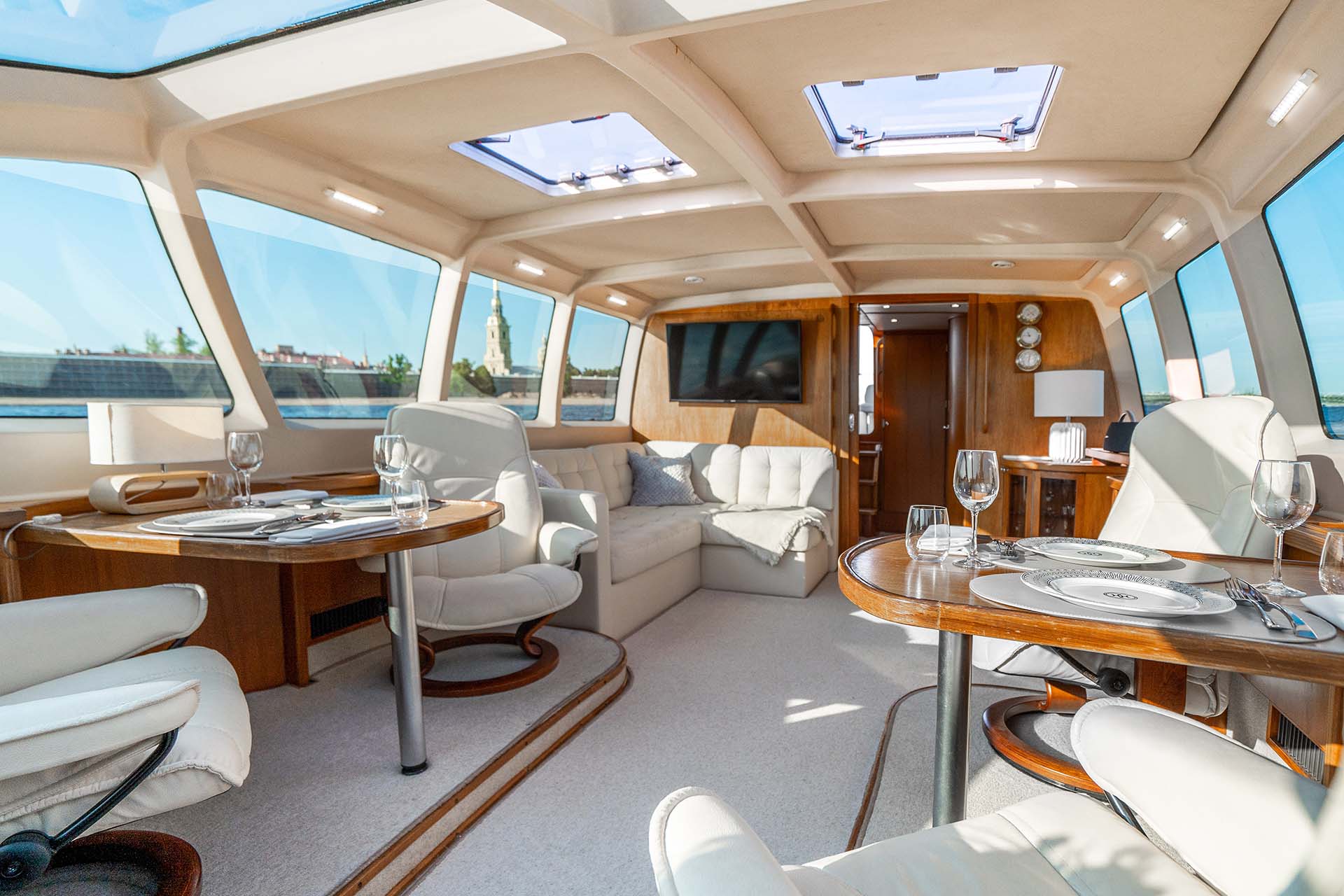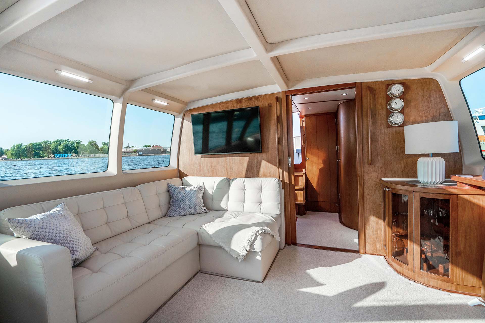 В носовой части — мягкие поворотные кресла и столики, где удобно и обсудить сделку, и выпить бокал вина на закате.