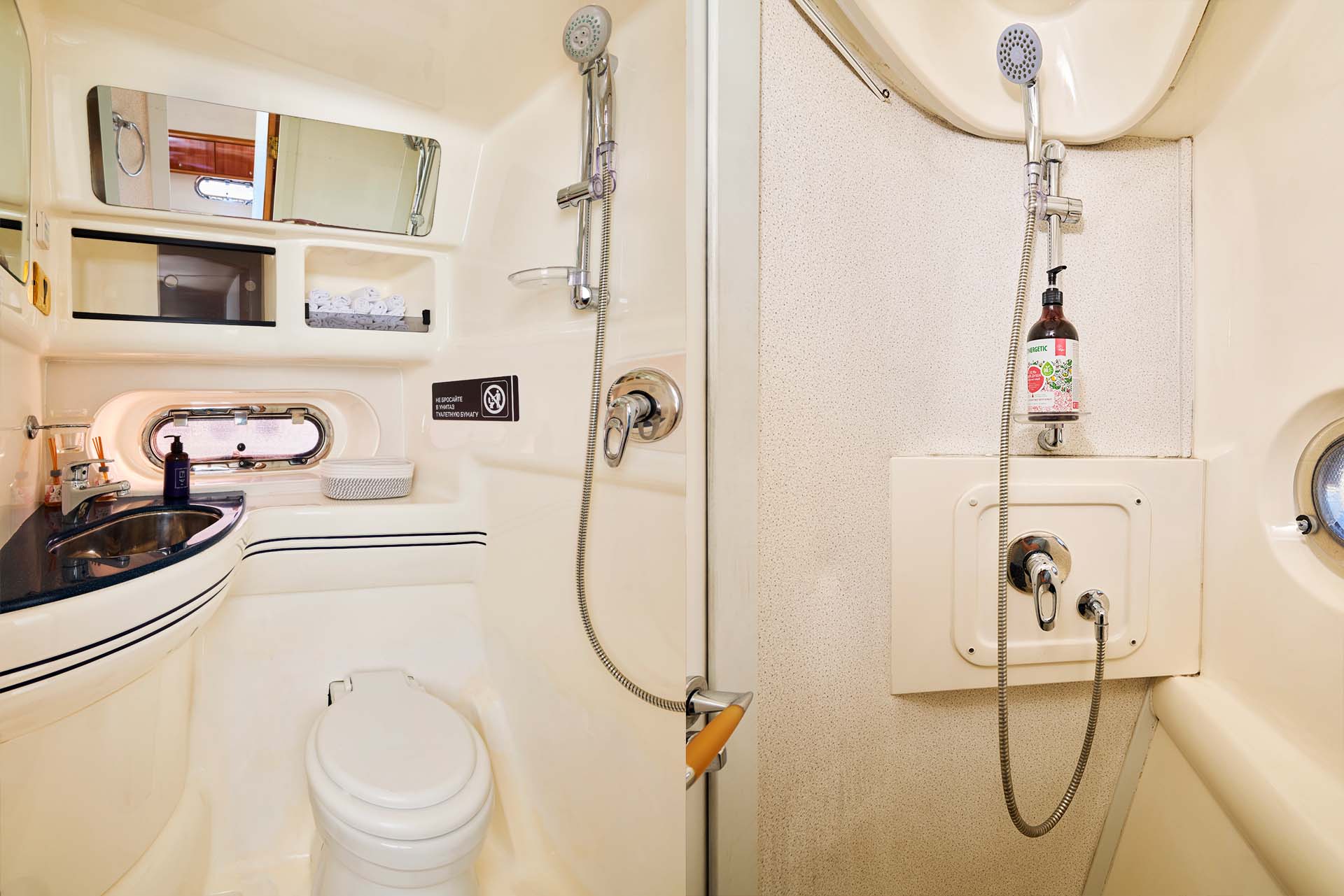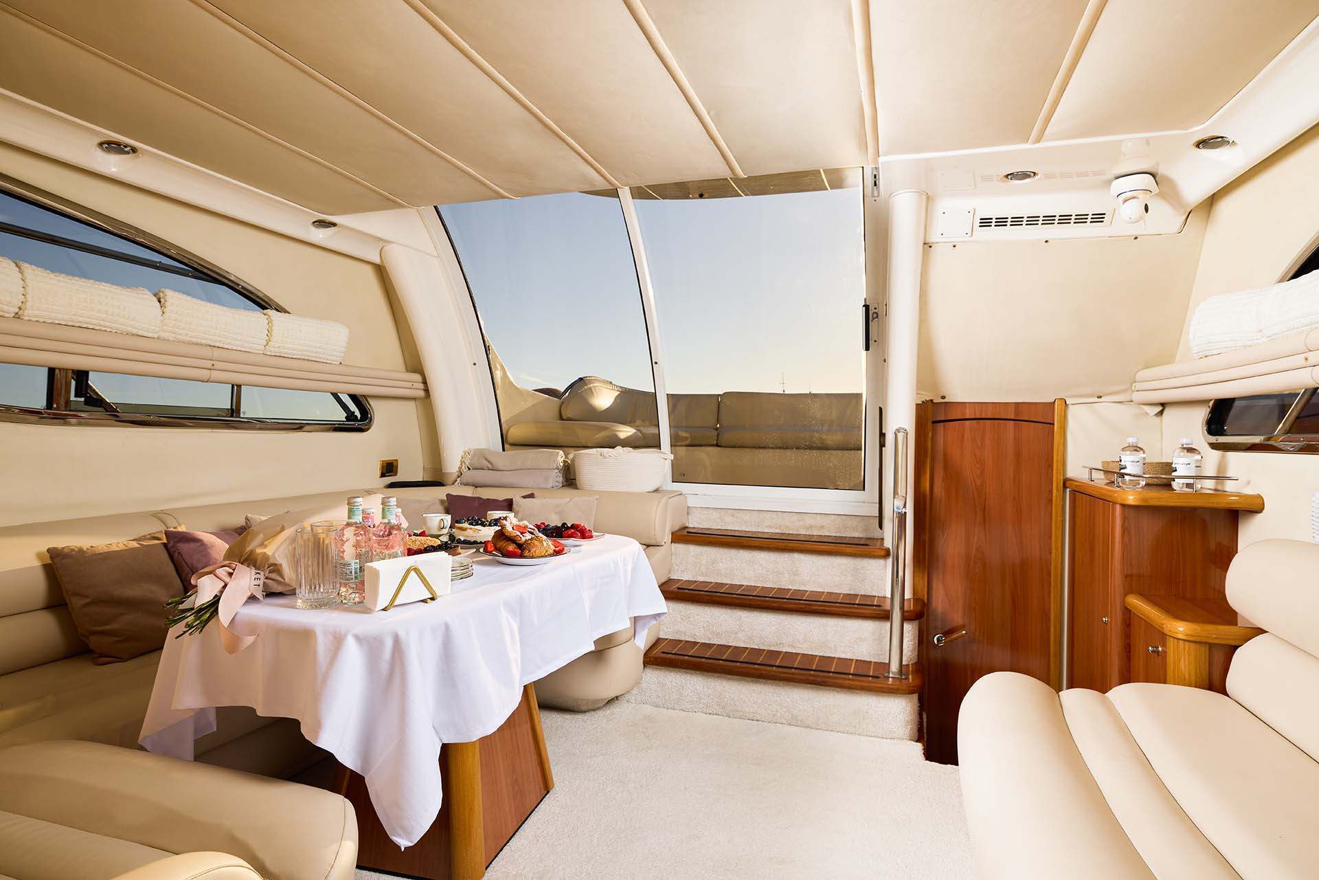 На флайбридже — лежаки для загара и диванчик рядом с капитанским постом. Здесь особенно хорошо на рассвете или в золотой час — свет ложится красиво, фотографии получаются как обложка журнала, а в голове наступает удивительная ясность. Есть тент — для тех, кто хочет быть на солнце, но не в жаровне.
