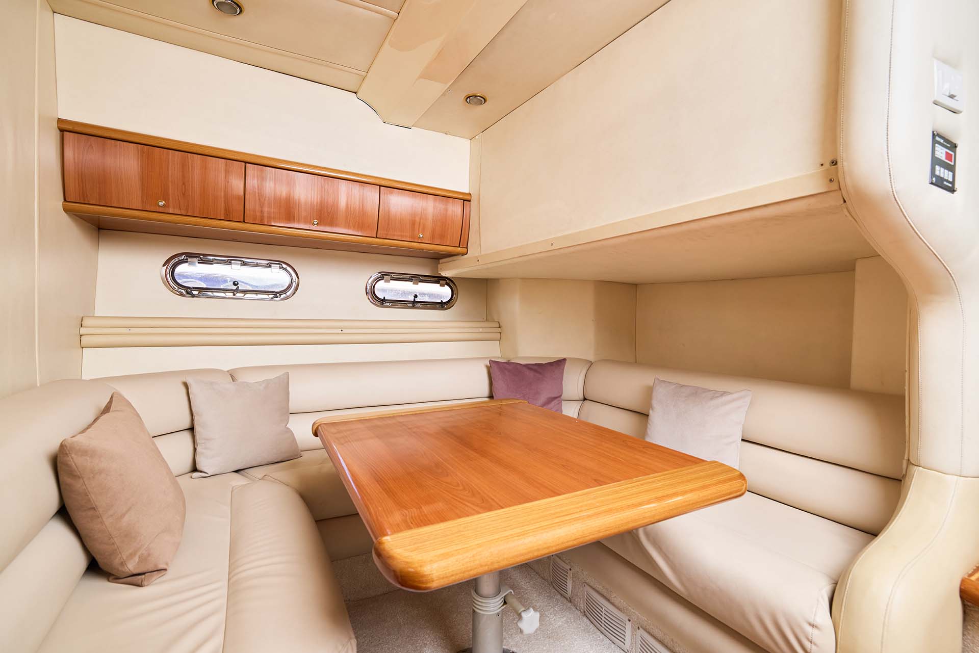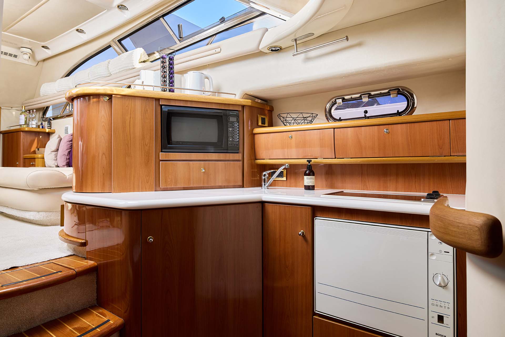 Кают-компания радует не только кожаным U-образным диваном и обеденным столом, но и ощущением “мы дома, только где-то посреди воды”. Камбуз — на нижней палубе, а значит, никакие готовки не нарушают ваш отдых, тишину и уют наверху.