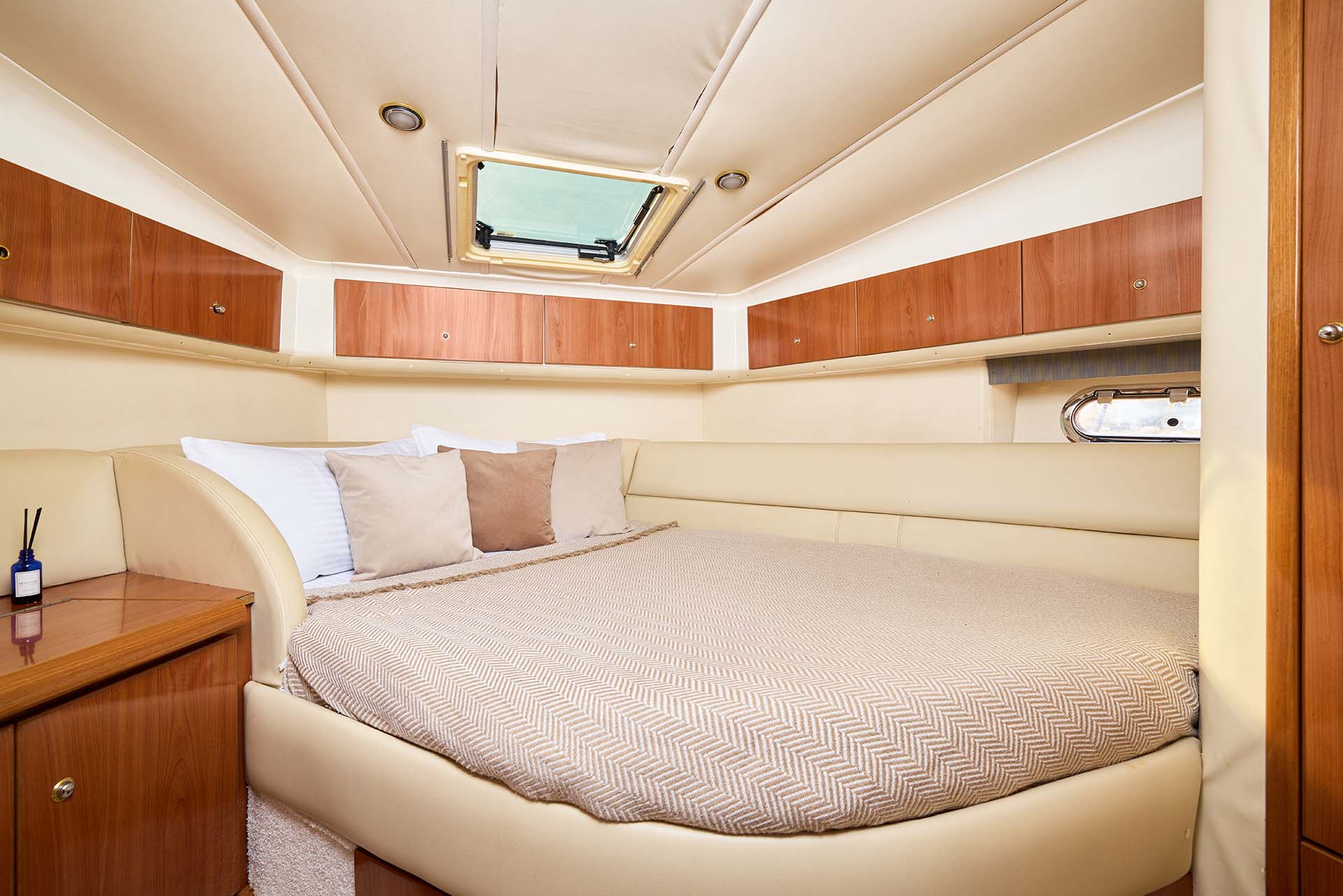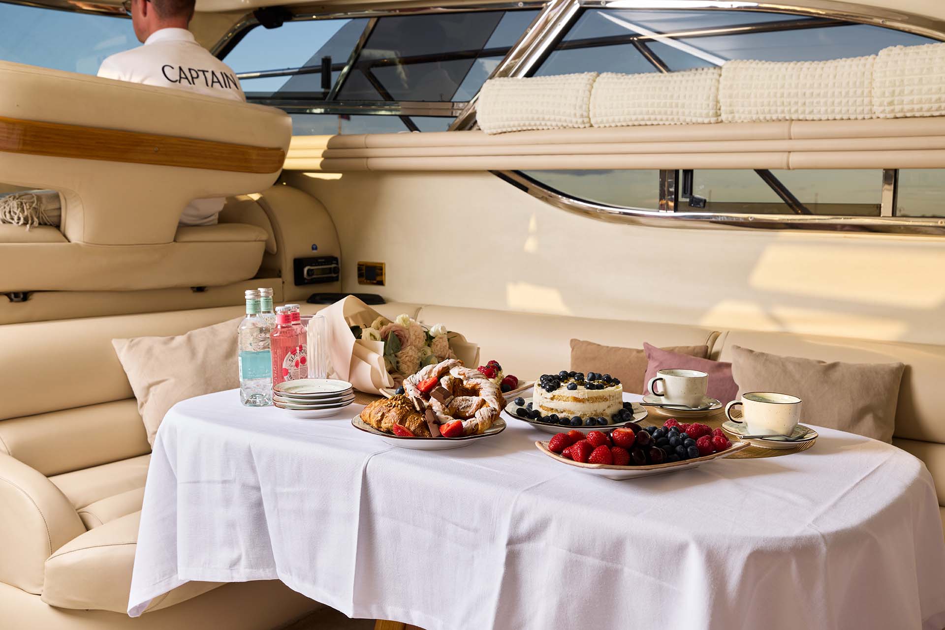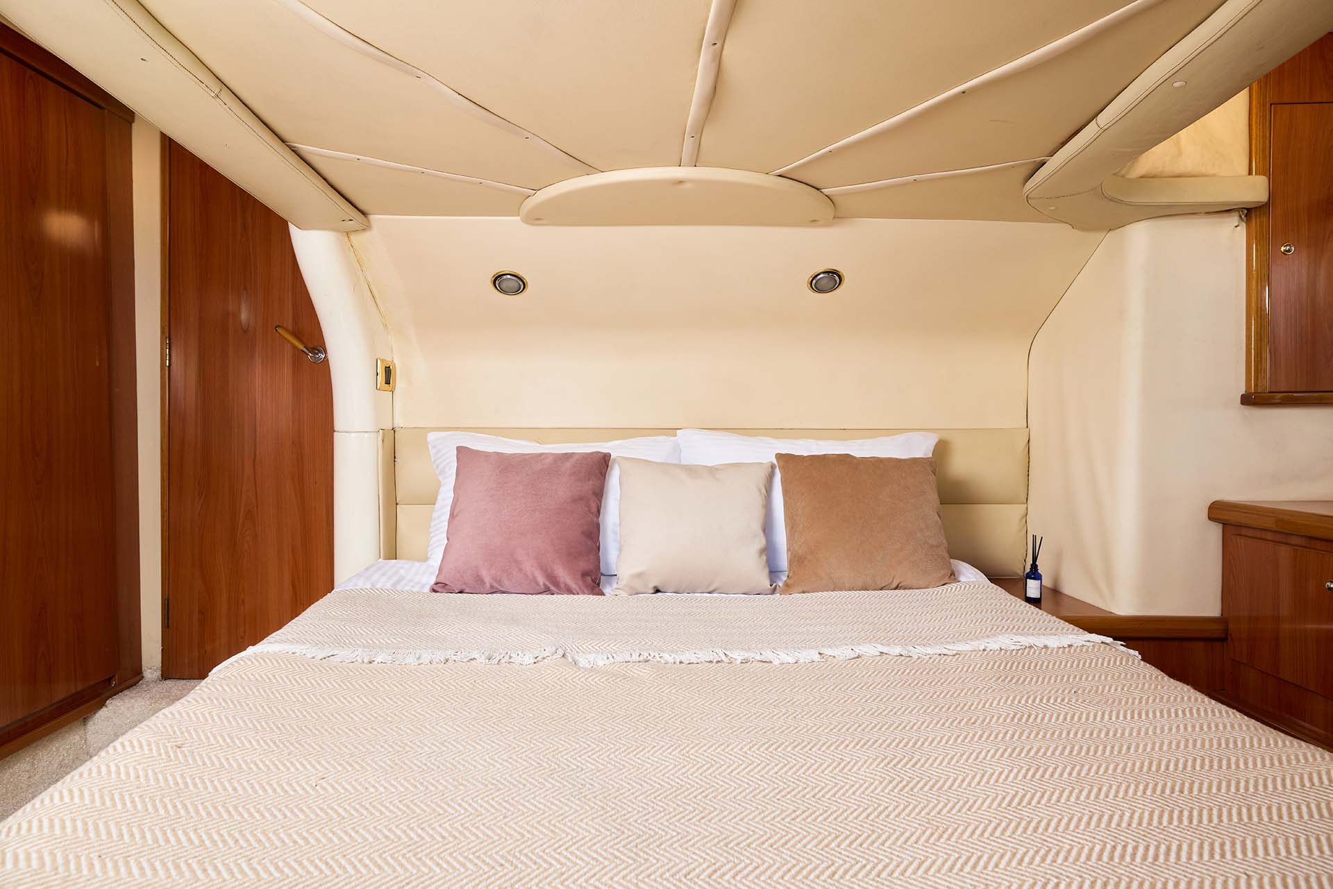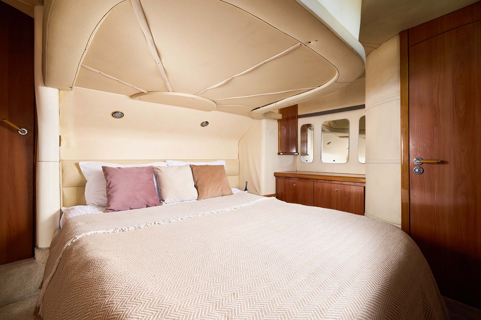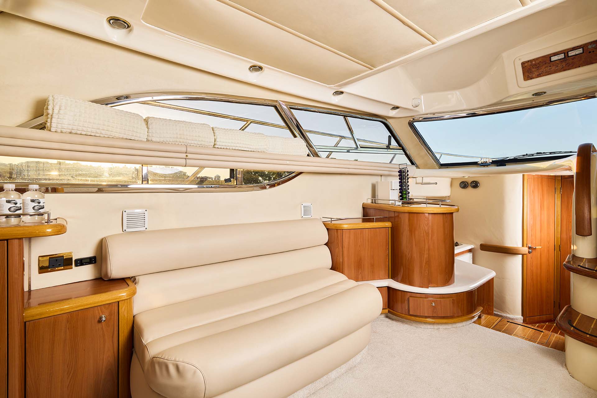 Sealine F43 - это 13,5-метровая трехпалубная яхта с удобной планировкой для дневных и ночных маршрутов. Буква F в названии означает, что яхта с флайбриджем (верхняя палуба). Просторная, стильная и по-настоящему уютная. В дневной круиз можно взять до 11 гостей — компания уместится свободно и без тесноты. А если хочется чего-то неспешного, ночного и почти медитативного — оставайтесь на борту вчетвером. Уютные каюты с двуспальными кроватями, мягким освещением и ненавязчивыми ароматами к этому располагают.