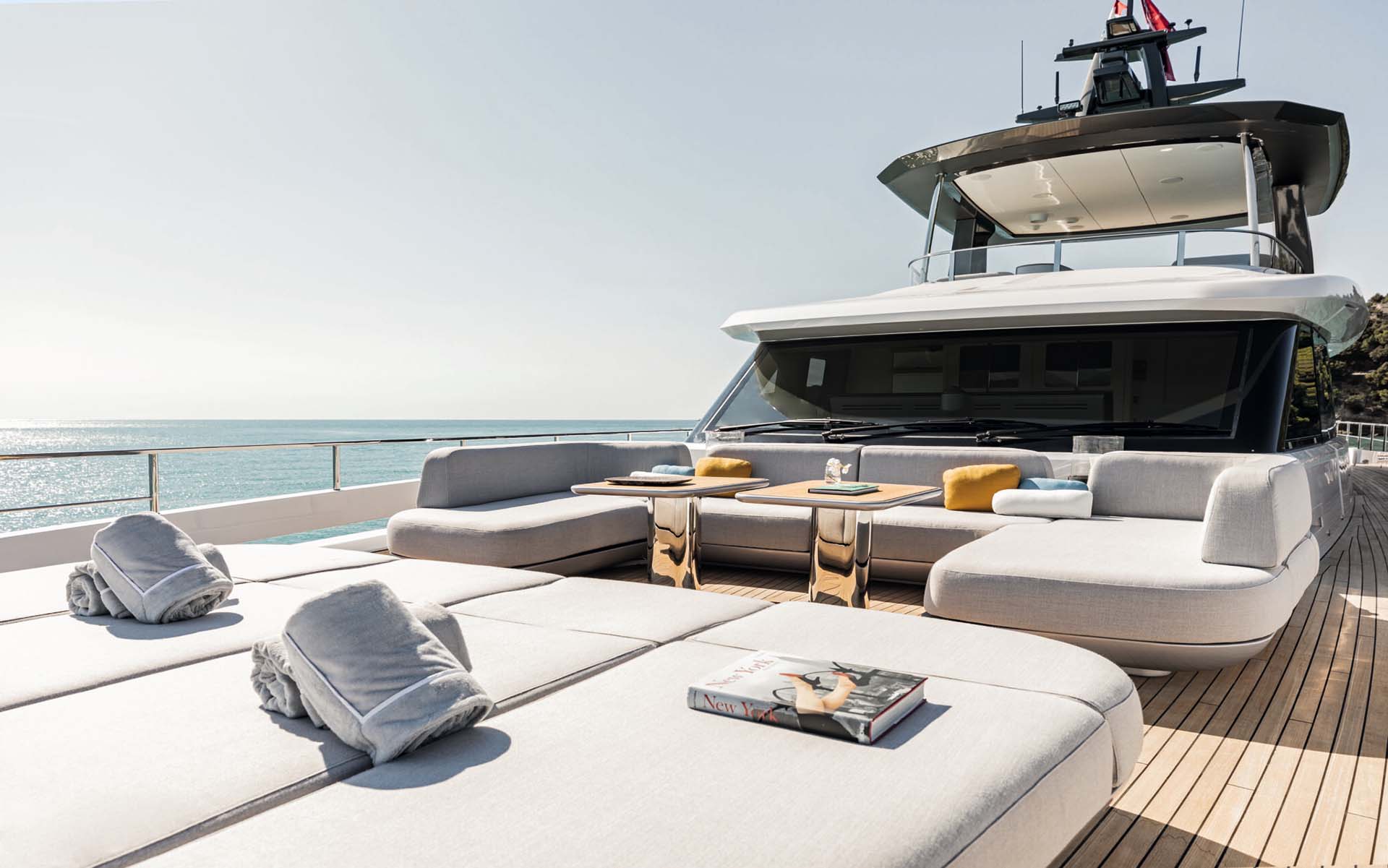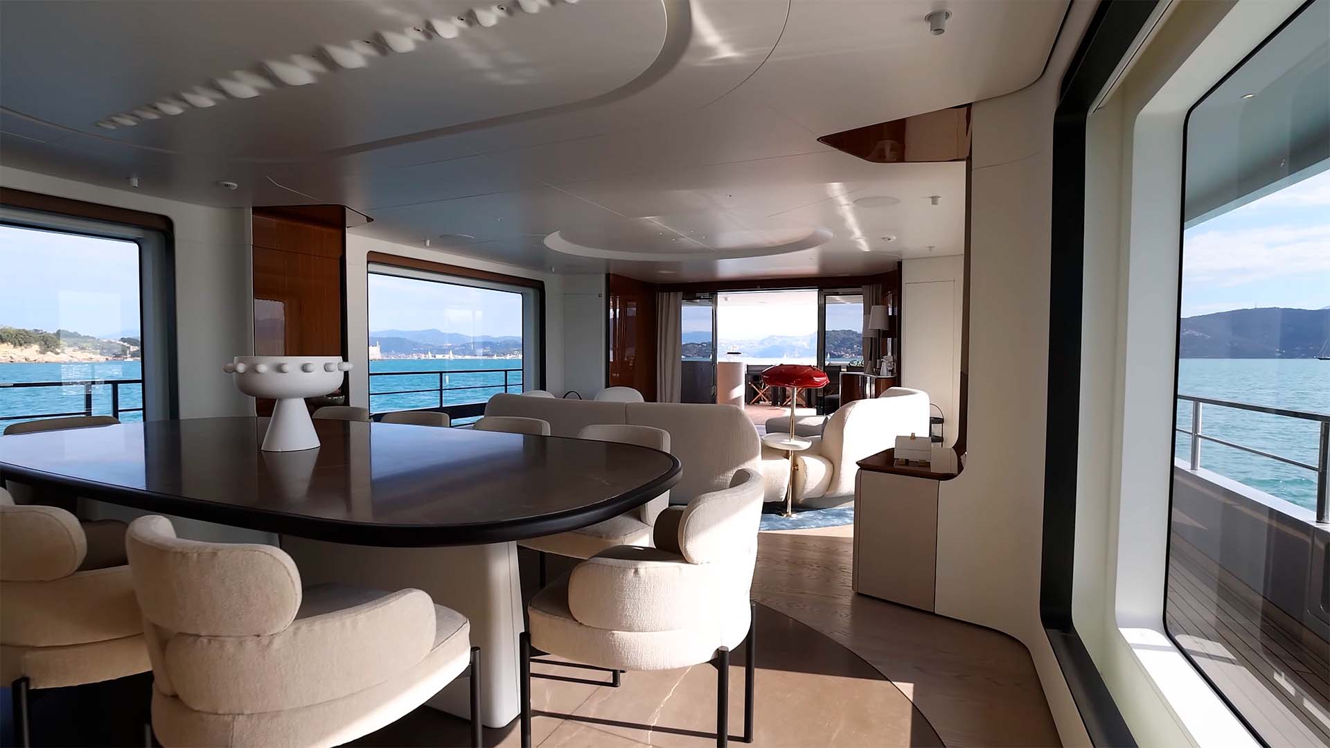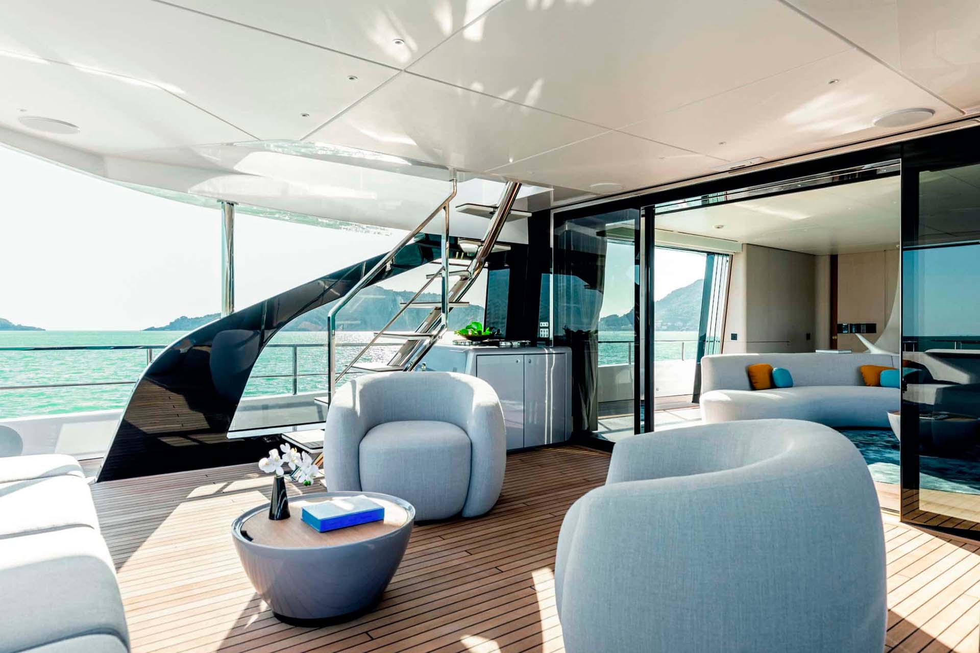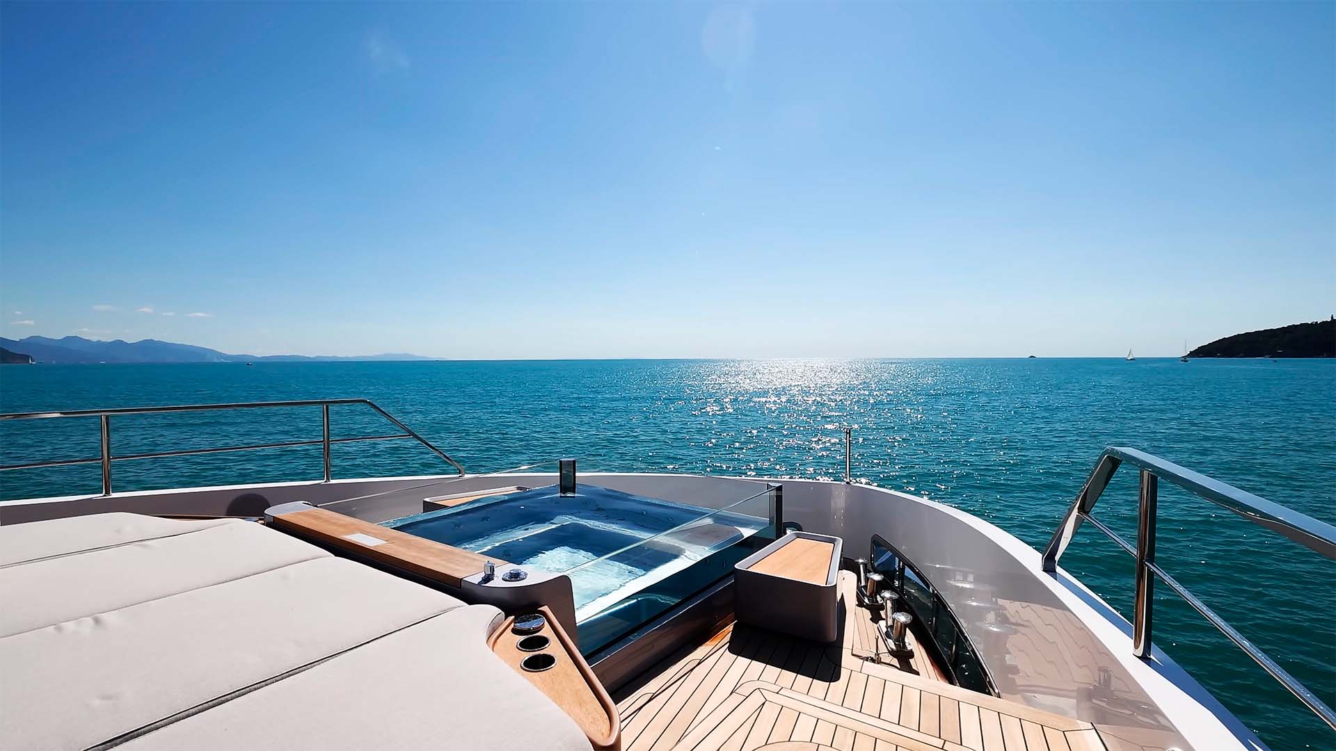 Этот революционный дизайн, разработанный знаменитым Alberto Mancini, позволяет использовать верхнюю палубу с максимальной эффективностью. Здесь достаточно места для полноценного коктейльного лаунжа и обширных зон для принятия солнечных ванн. Центральным элементом является роскошная джакузи с прозрачными стеклянными стенками, расположенная на носу яхты. Находясь в этой изысканной ванне, вы словно парите над водой – панорамный вид на 270 градусов создаёт неповторимое ощущение единения с морем, а прозрачные боковые стенки усиливают эффект бесконечности. Даже во время медленного круиза вы сможете наслаждаться уникальным сочетанием горячей воды, морского бриза и, возможно, бокалом шампанского.