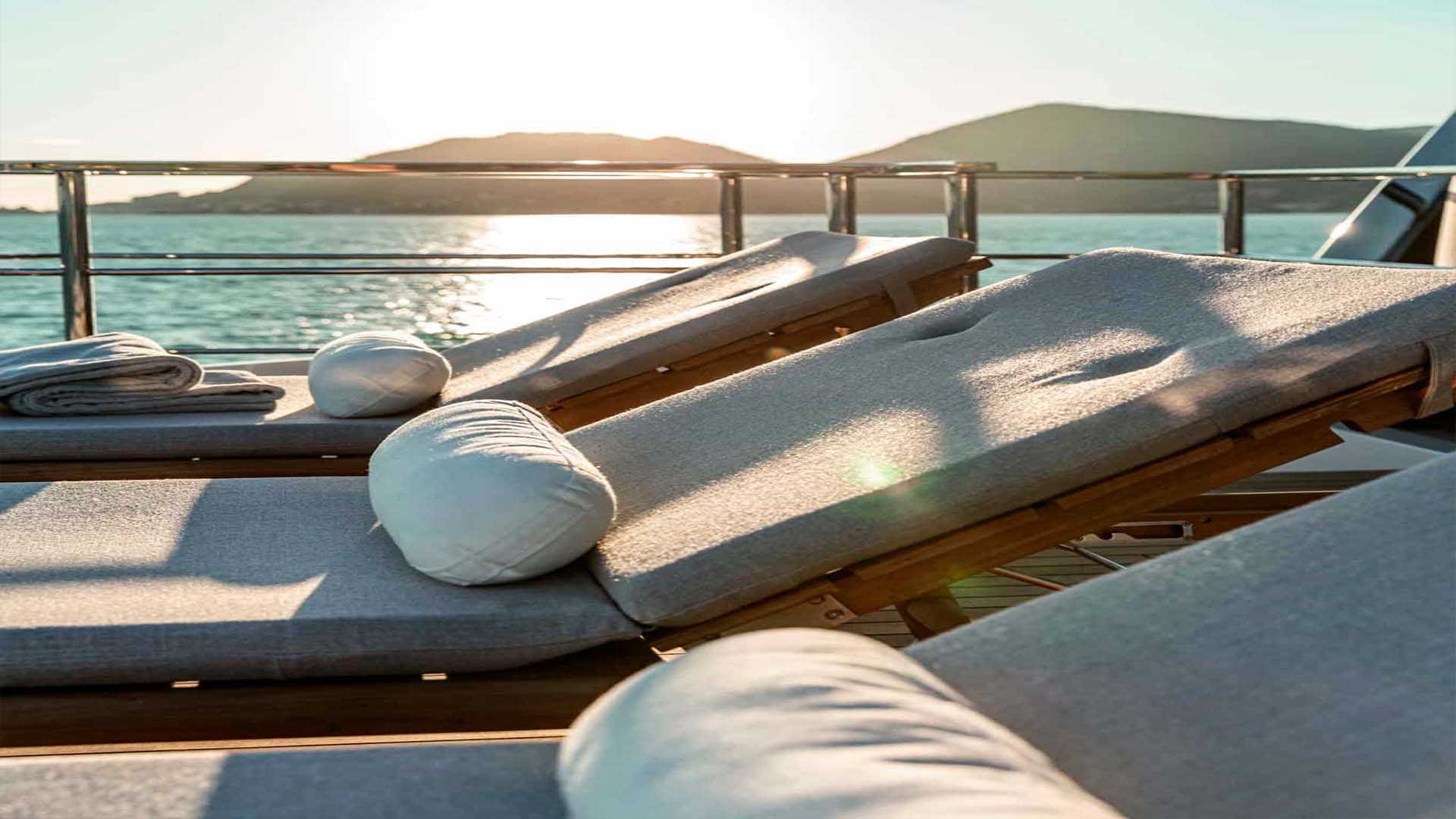 Главная архитектурная инновация "LUZ DE MAR" – её впечатляющий Infinity Skydeck, уникальная особенность, которую не найти на других яхтах этого класса. Представьте себе полностью ровную палубу, простирающуюся от самой кормы до носа, без единого перепада высоты. Термин "infinity" здесь полностью оправдан – вы буквально не видите конца палубы, создавая ощущение бесконечного пространства.