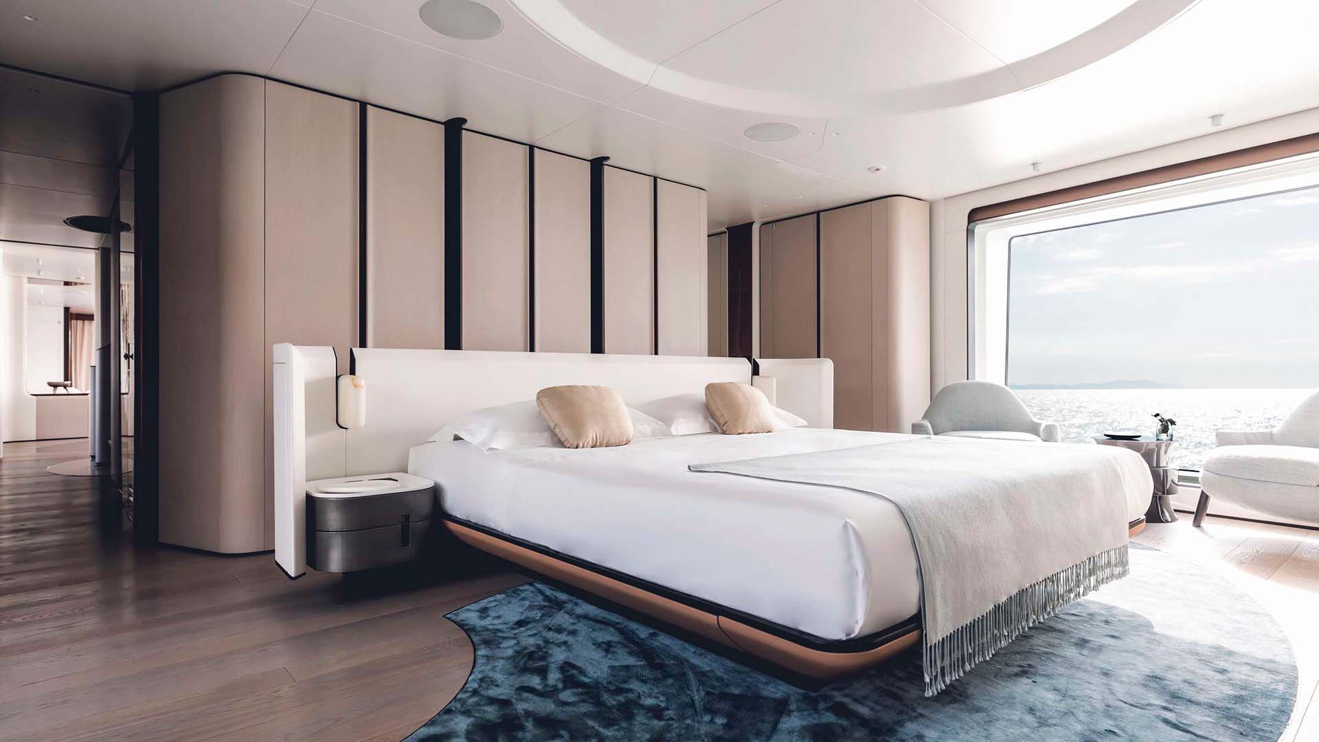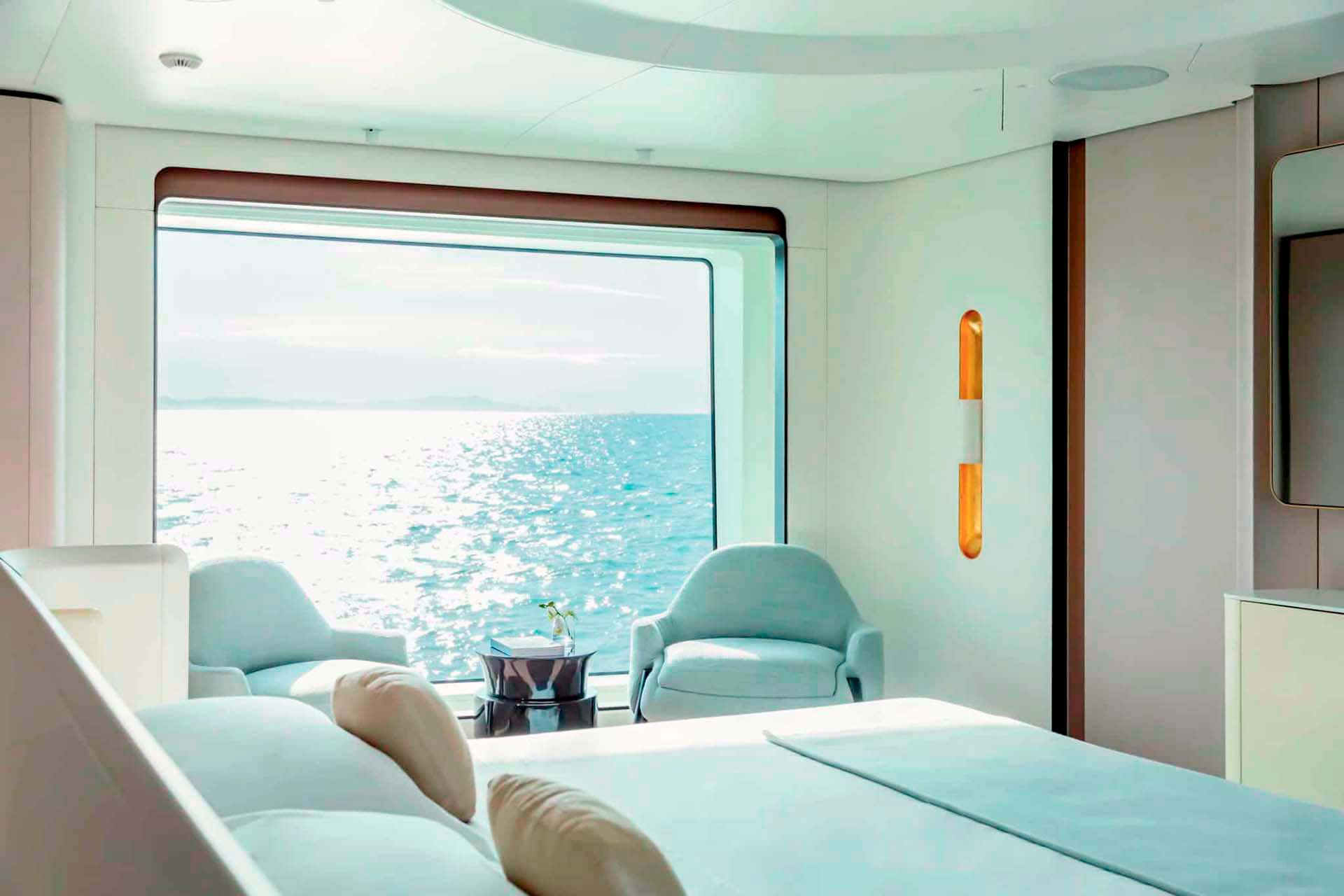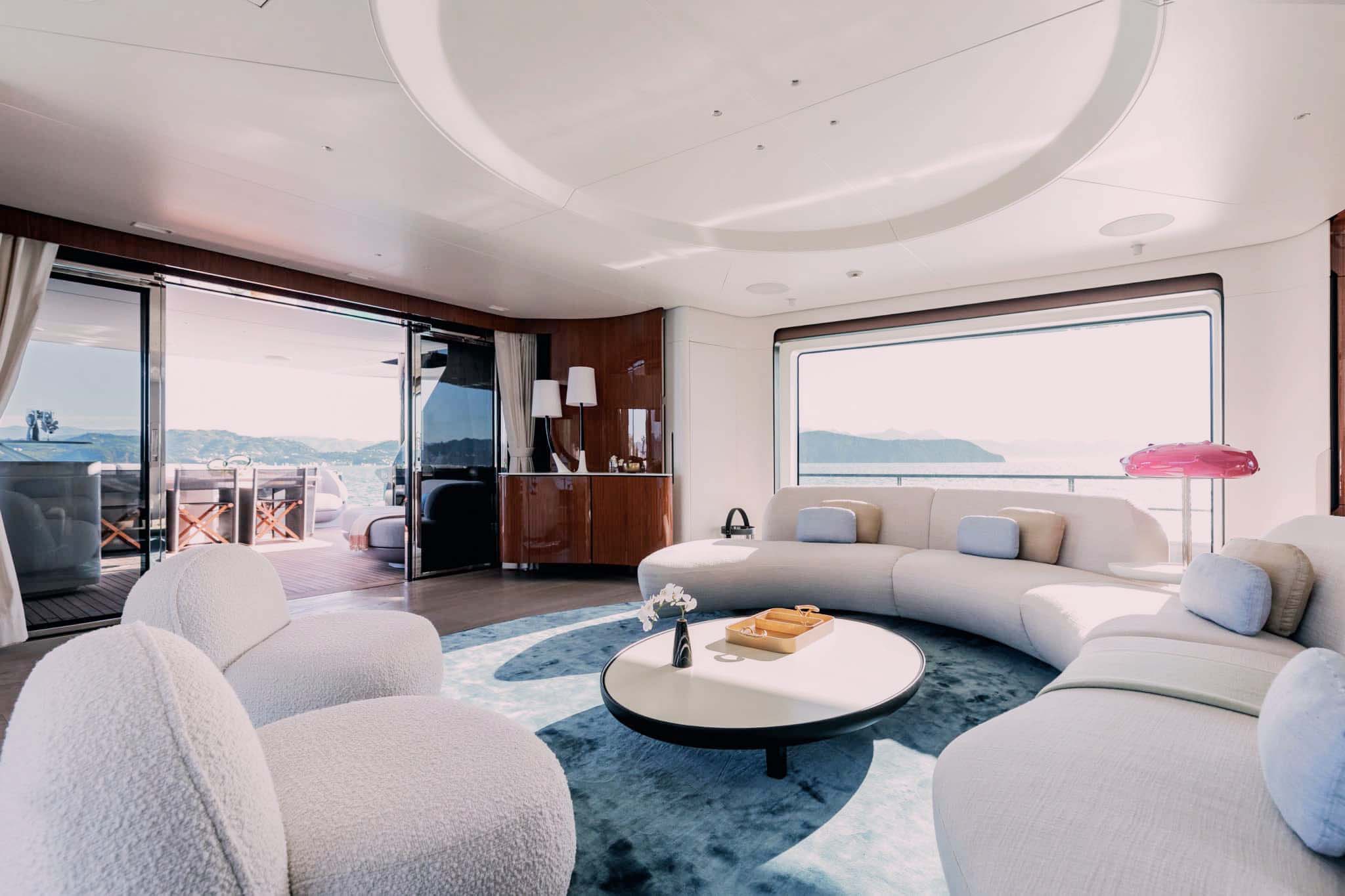 Главная палуба – настоящее произведение дизайнерского искусства. Панорамное остекление создаёт невероятный эффект присутствия, стирая границы между морем и интерьером. Особенность яхты – мастер-каюта на главной палубе с окнами от пола до потолка, откуда открывается захватывающий вид на морской горизонт. Проснуться здесь – уже само по себе роскошь.
