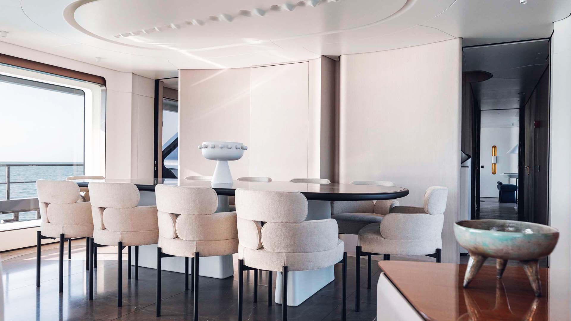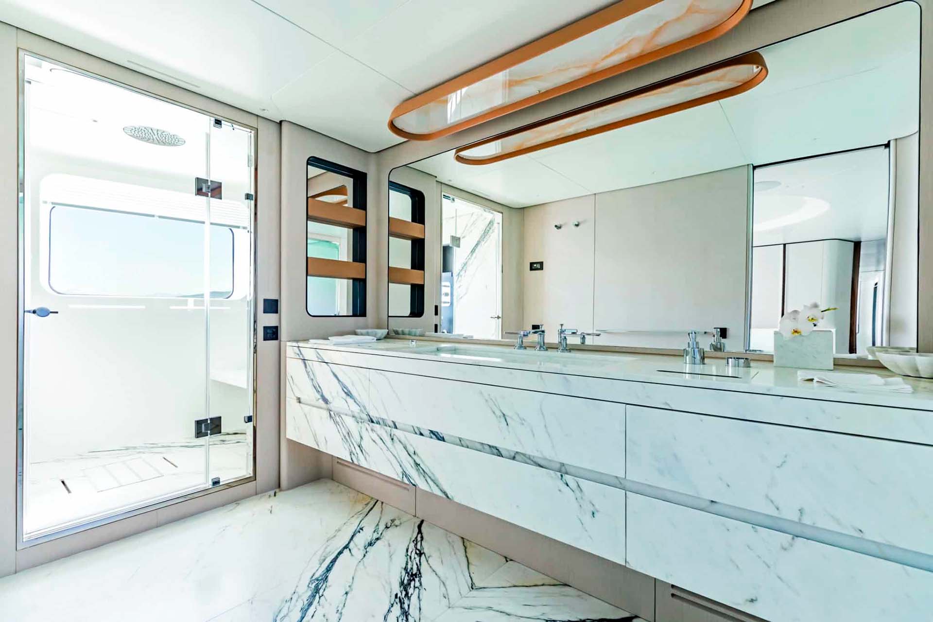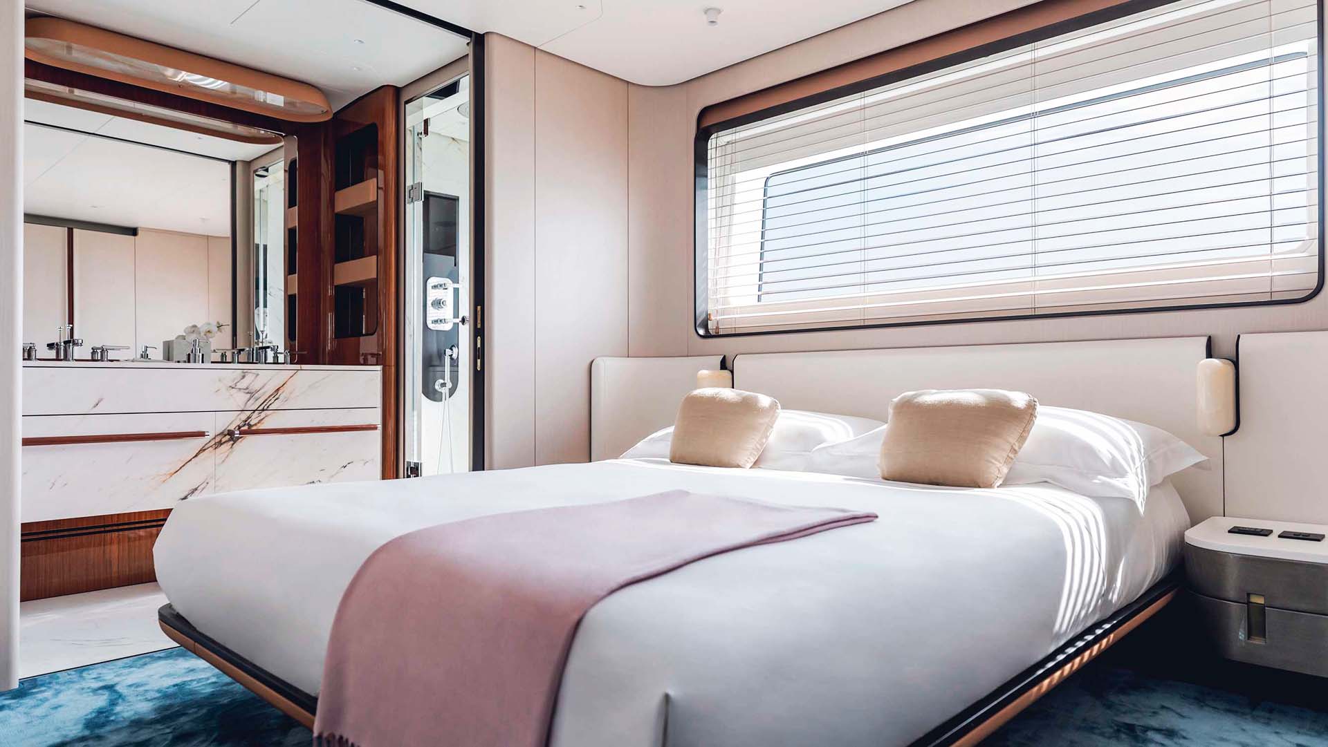 Главная палуба – настоящее произведение дизайнерского искусства. Панорамное остекление создаёт невероятный эффект присутствия, стирая границы между морем и интерьером. Особенность яхты – мастер-каюта на главной палубе с окнами от пола до потолка, откуда открывается захватывающий вид на морской горизонт. Проснуться здесь – уже само по себе роскошь.