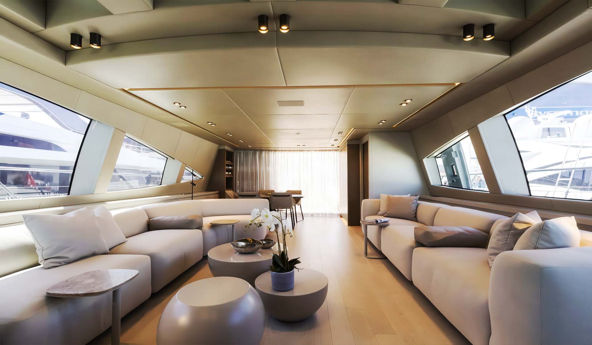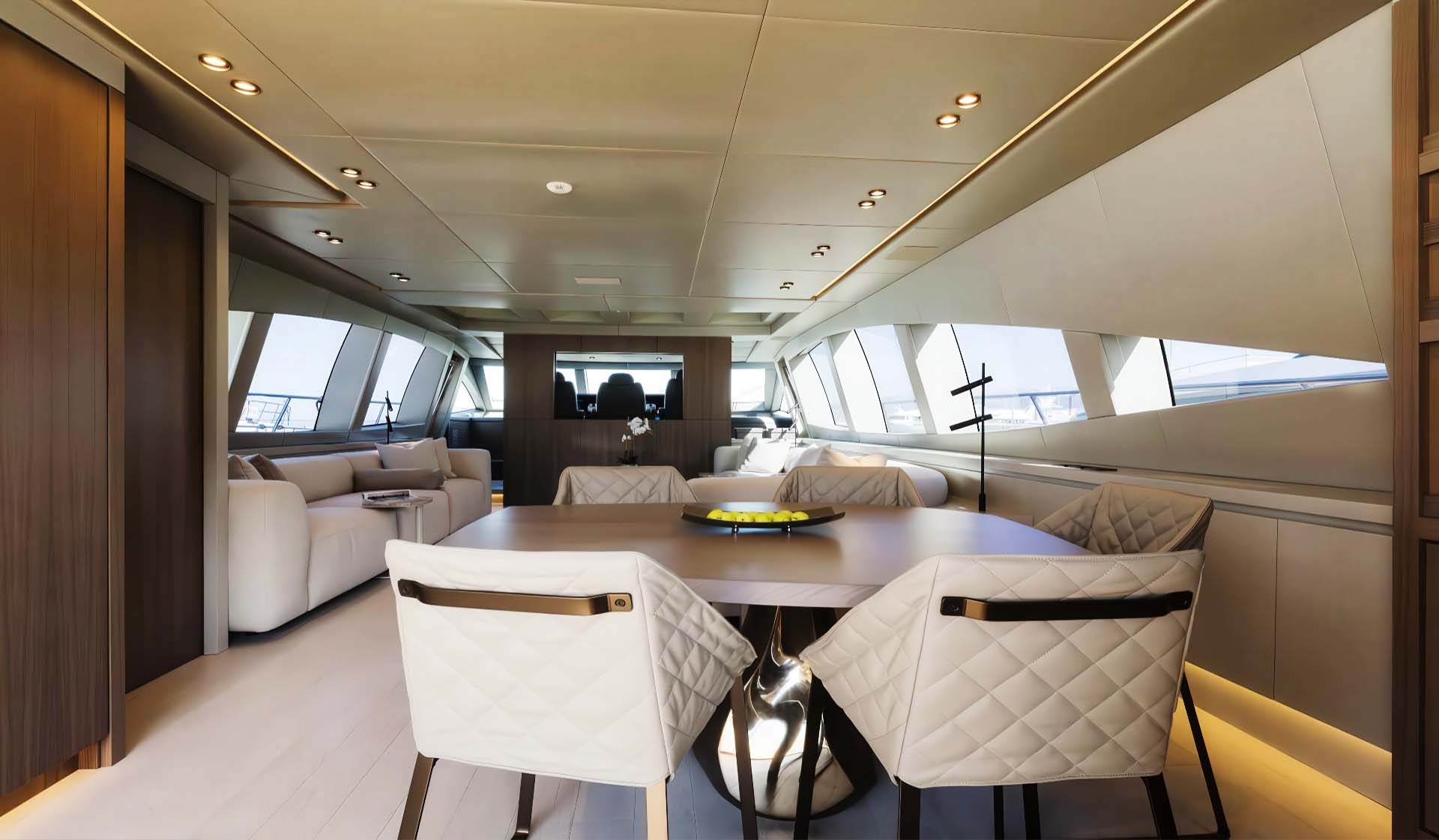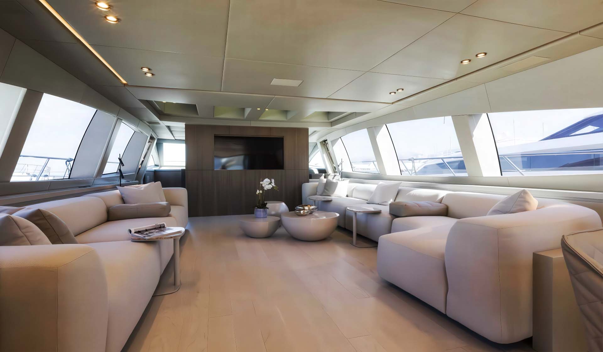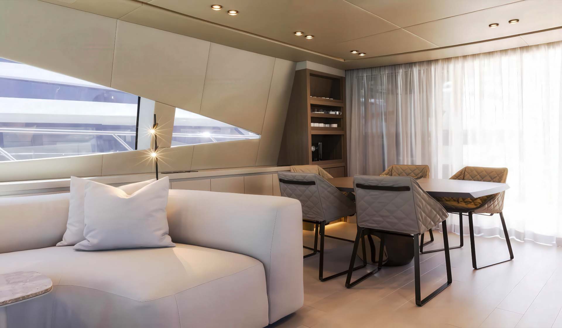 Ступив на борт Mangusta 110, вы попадаете в мир современной роскоши. Просторный салон открытой планировки наполнен естественным светом, благодаря панорамным окнам увеличенного размера, а элегантный декор создает спокойную и расслабляющую атмосферу.