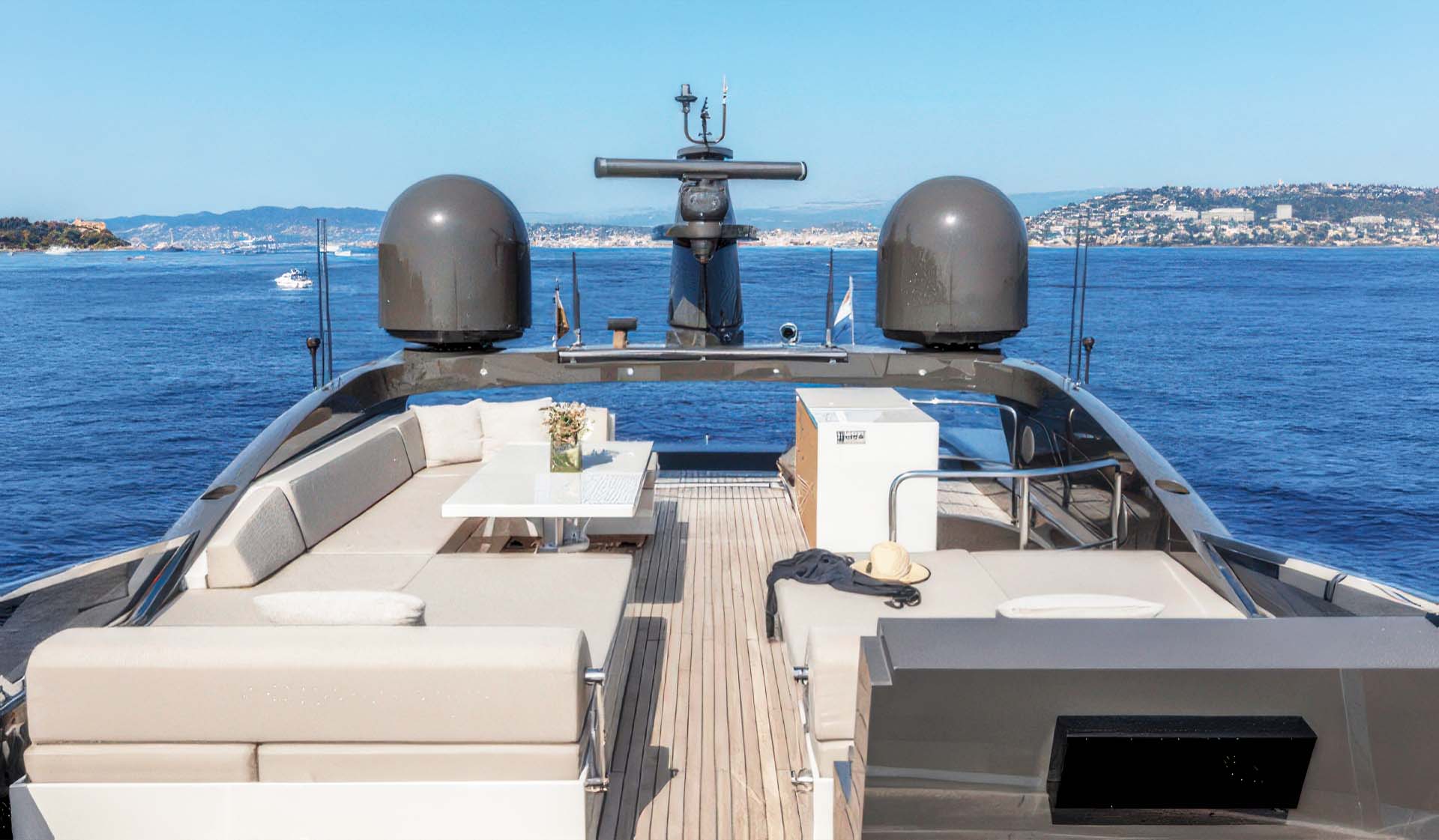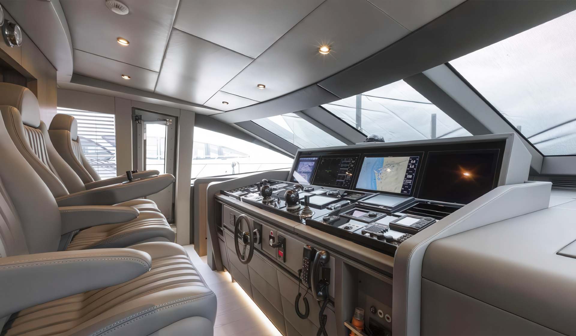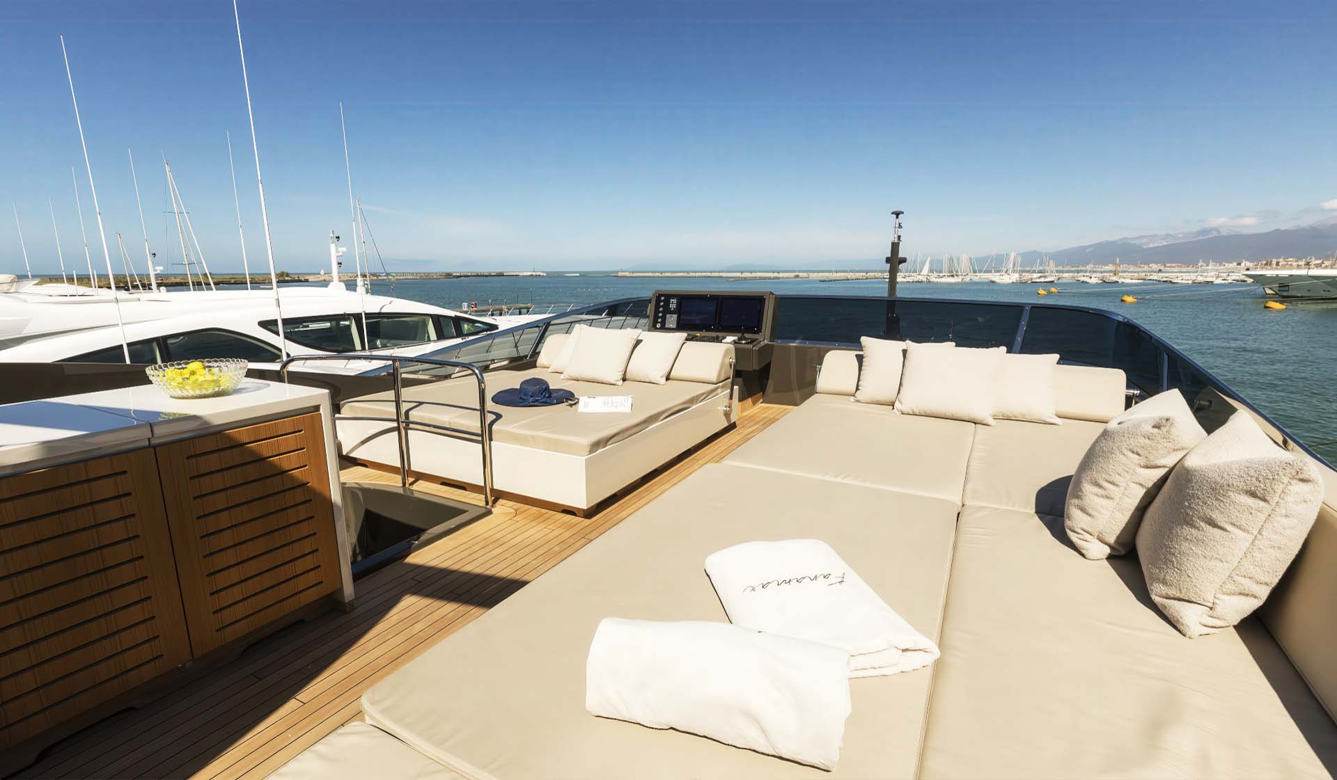 Впечатляющий флайбридж площадью 56 кв.м, является настоящей жемчужиной этой яхты. Верхняя палуба включает в себе: обширную зону отдыха с мягкими диванами, обеденную зону al fresco и отдельную зону для принятия солнечных ванн. Боковые крылья навеса создают уютную интимную атмосферу, защищая от ветра, в то время как световые люки наполняют пространство естественным светом. Встроенные шкафы обеспечивают легкий доступ к удобствам для гостей, а панорамные виды на 360 градусов делают флайбридж идеальным местом для наблюдения за закатами и вечерних коктейлей.