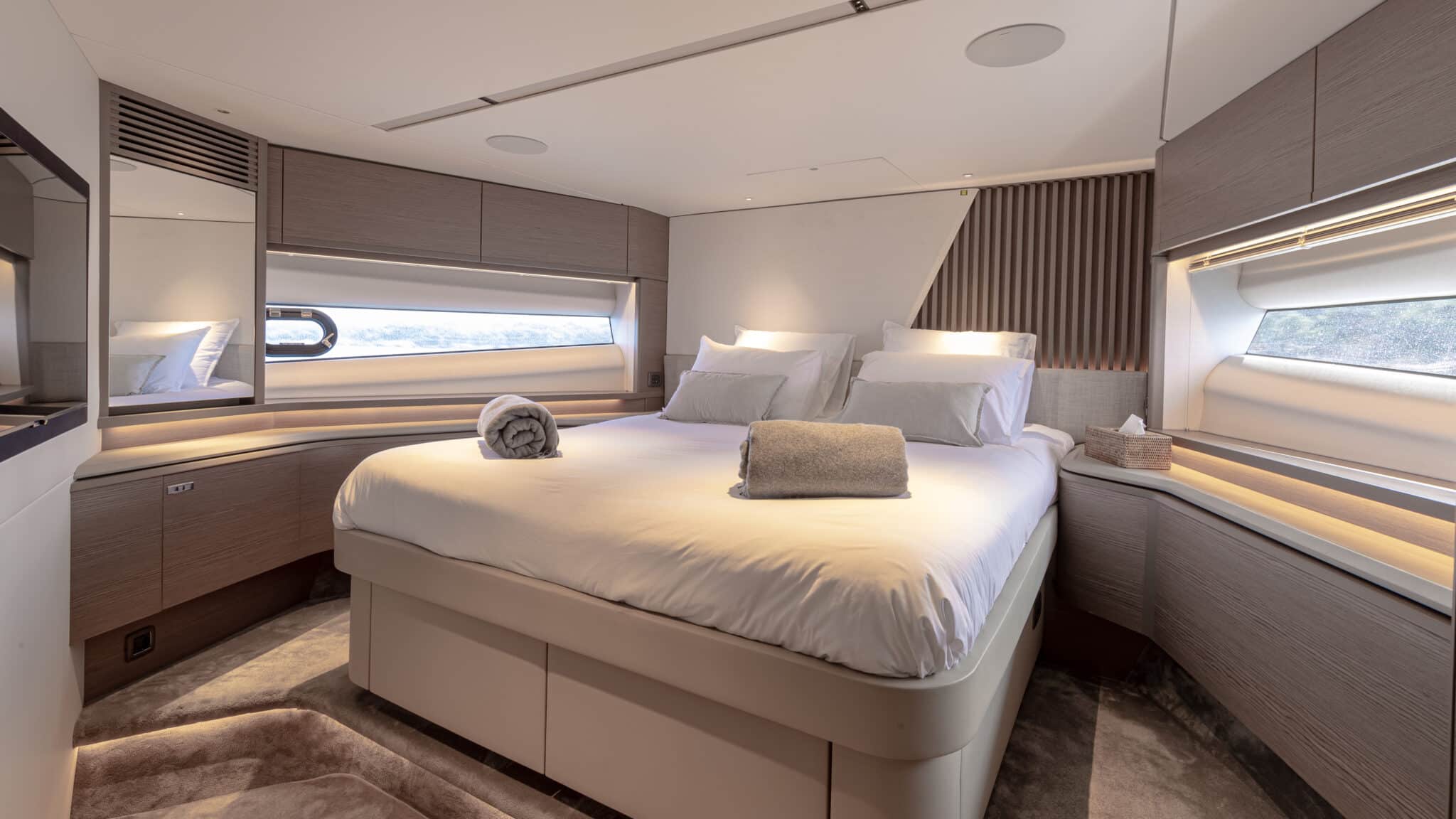 Princess Y72 это не просто яхта, а пространство, продуманное до деталей для комфортного отдыха в кругу семьи или друзей. Интерьер выполнен в светлых, приглушённых тонах с натуральными акцентами, создаётся ощущение свежести и простора. В салоне уютная лаунж-зона с ТВ, полноценная обеденная группа и стильный бар. Всё, что нужно для идеального аперитива с видом на закат.