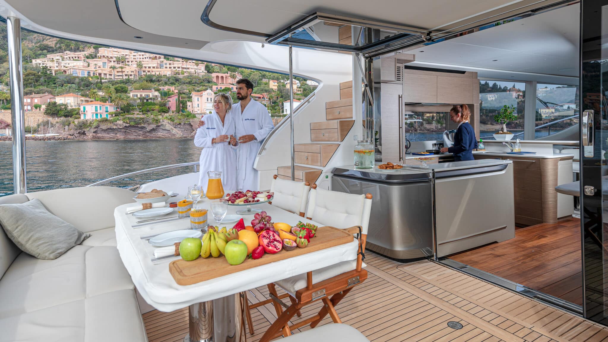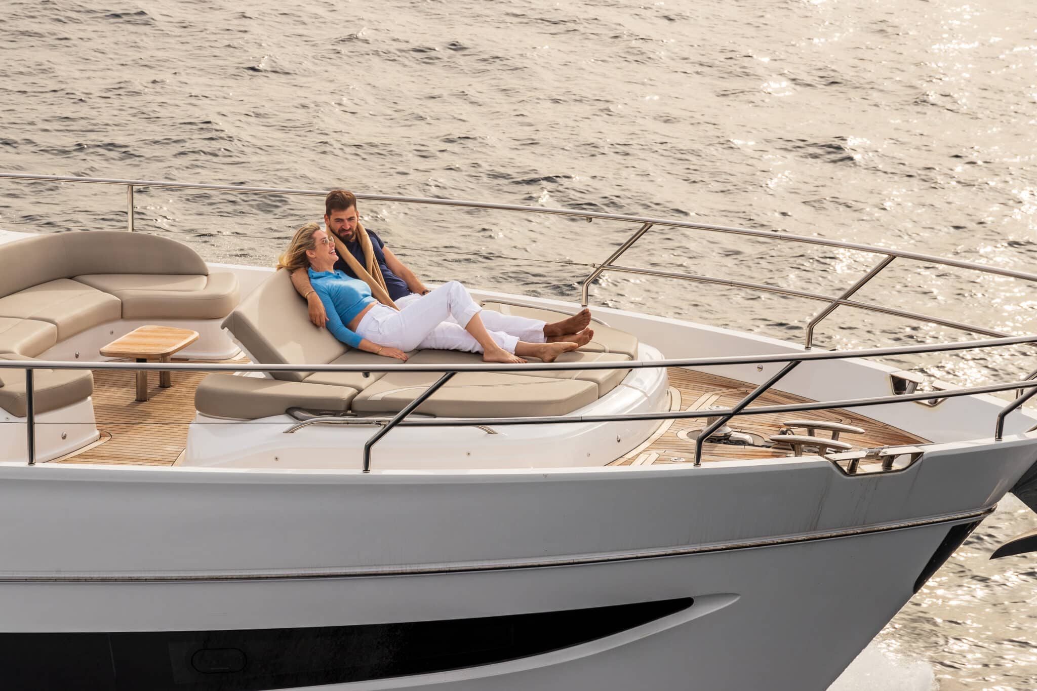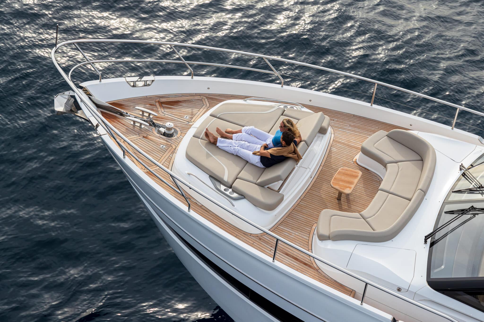 Одна из главных жемчужин Princess Y72, просторный флайбридж. Здесь удобные шезлонги, барная стойка, зона отдыха и место для ужина на свежем воздухе. Идеальное место, чтобы проводить день под солнцем и встречать вечер под звёздами. На носовой палубе, модульные шезлонги, которые легко превращаются в комфортные диваны: ваша зона релакса там, где вы захотите.
