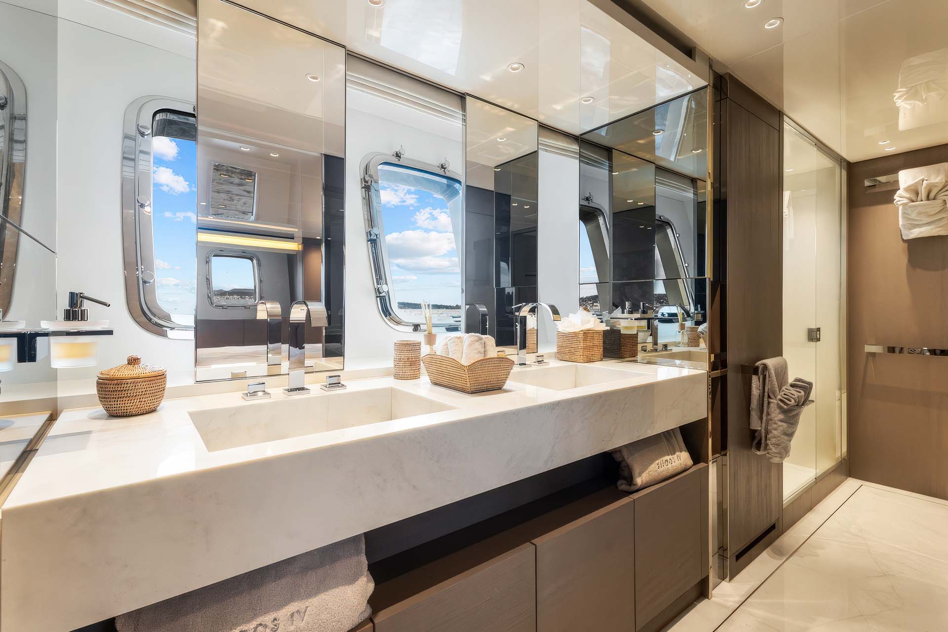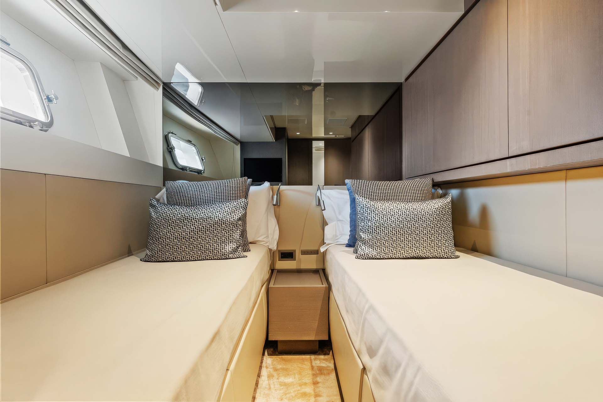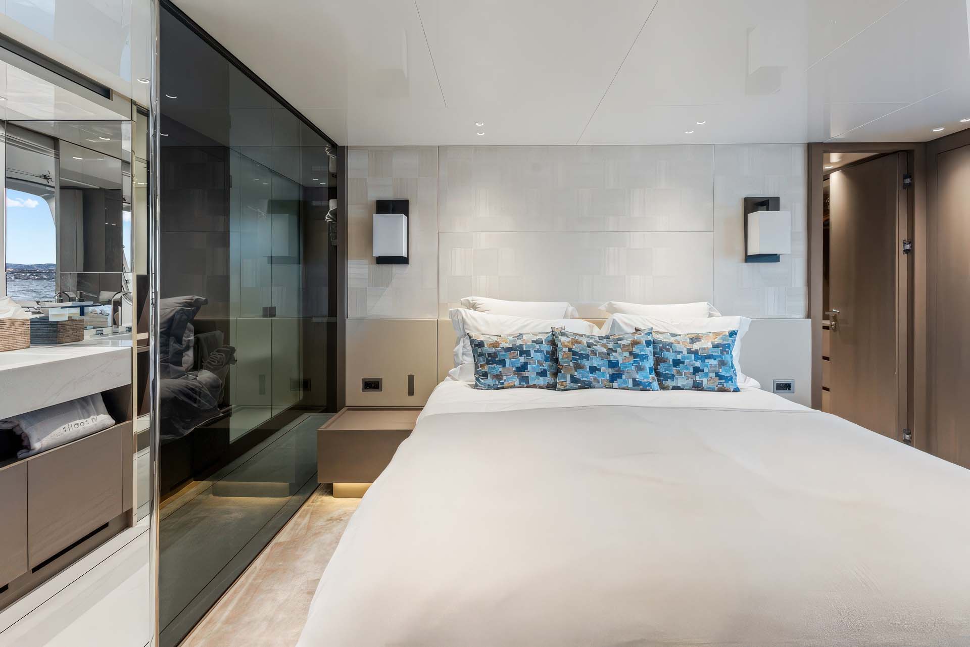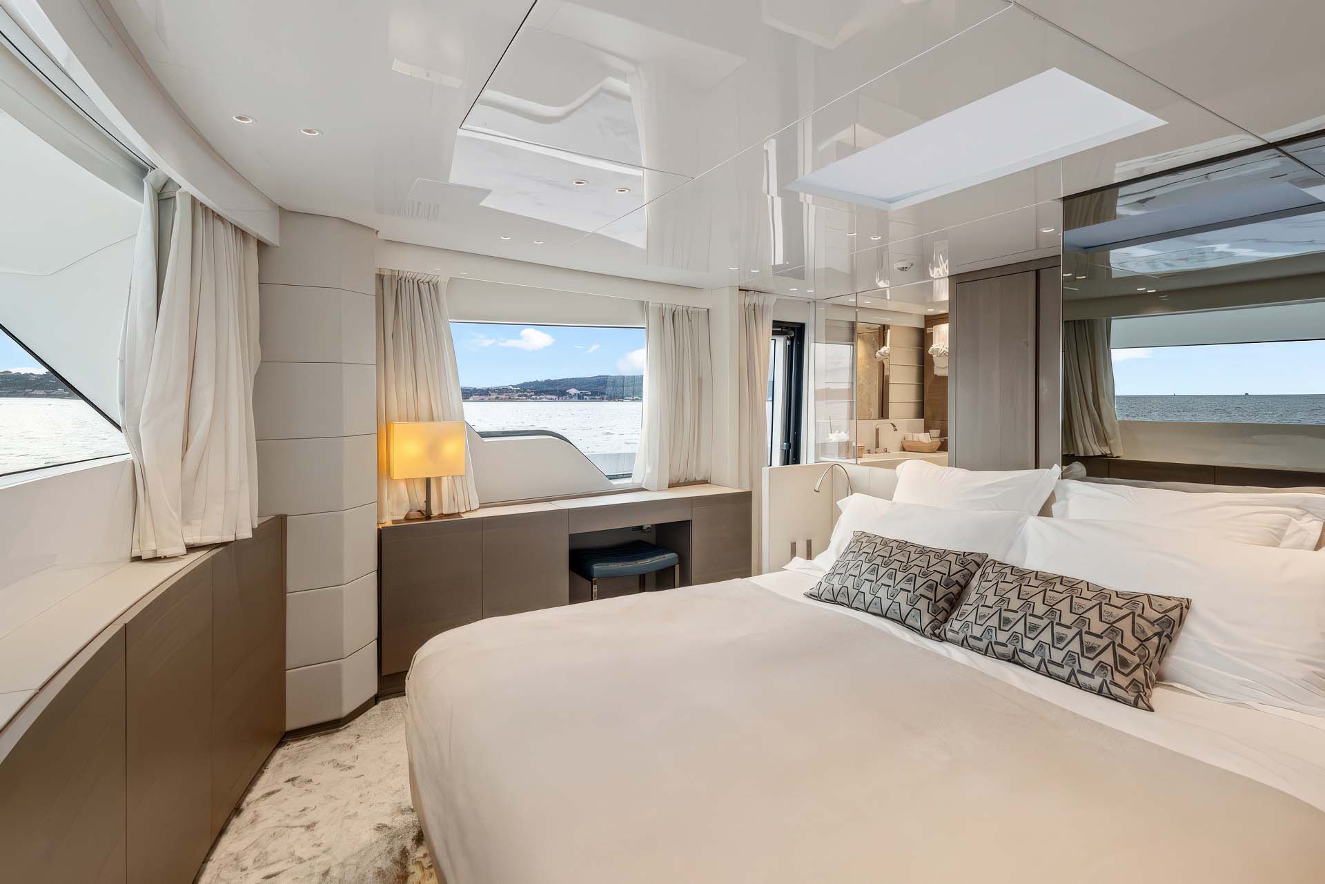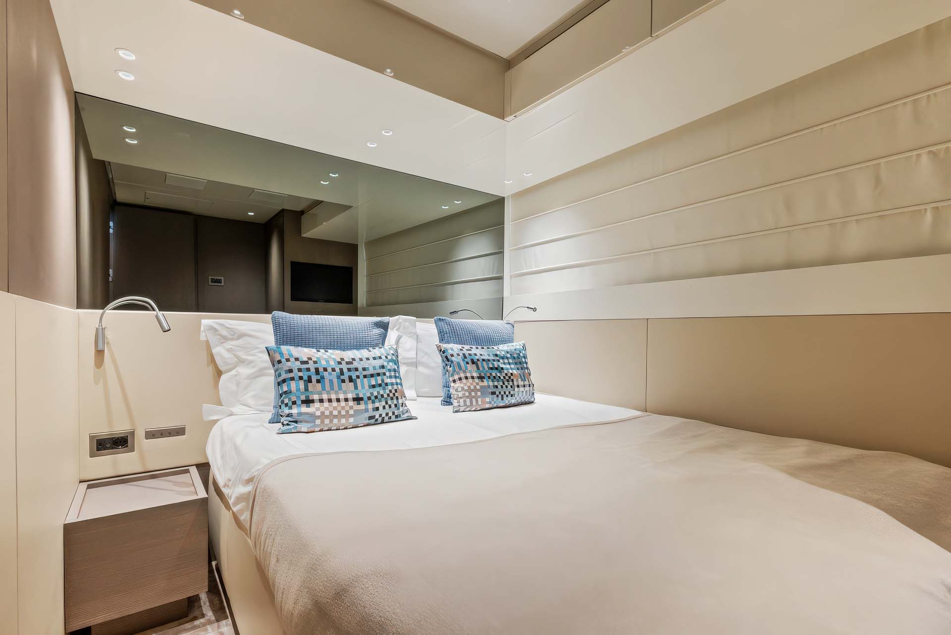 На борту яхты 4 элегантные каюты с собственными ванными комнатами. Особая гордость - мастер-сьют на главной палубе с панорамными окнами, что обычно встречается на яхтах большего размера, в другом ценовом диапазоне. Утро здесь начинается с вида на Лазурный берег, а не с вибрации от двигателей. Яхта идеально подходит для восьми гостей при длительных круизах, и до двенадцати человек при дневной аренде.