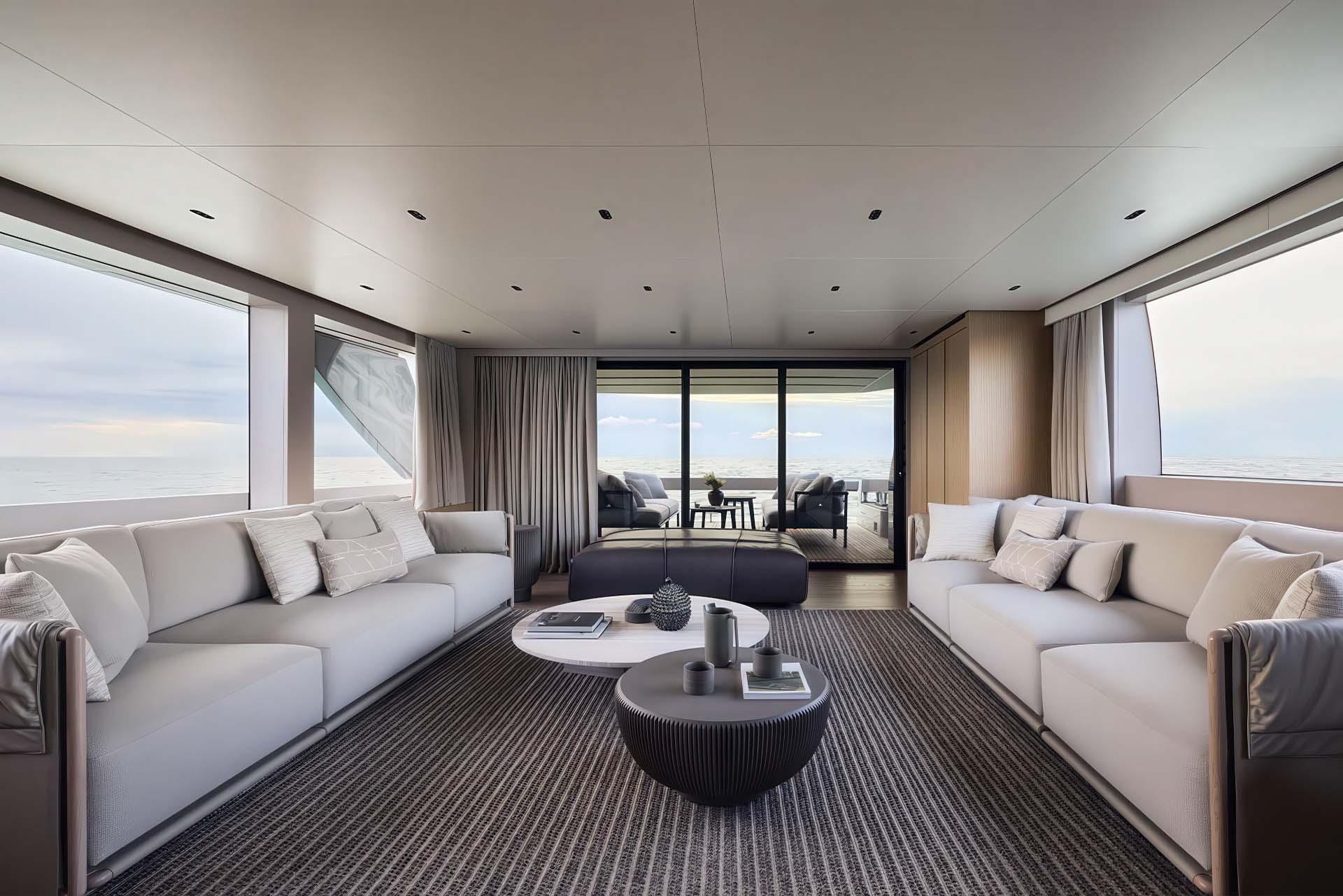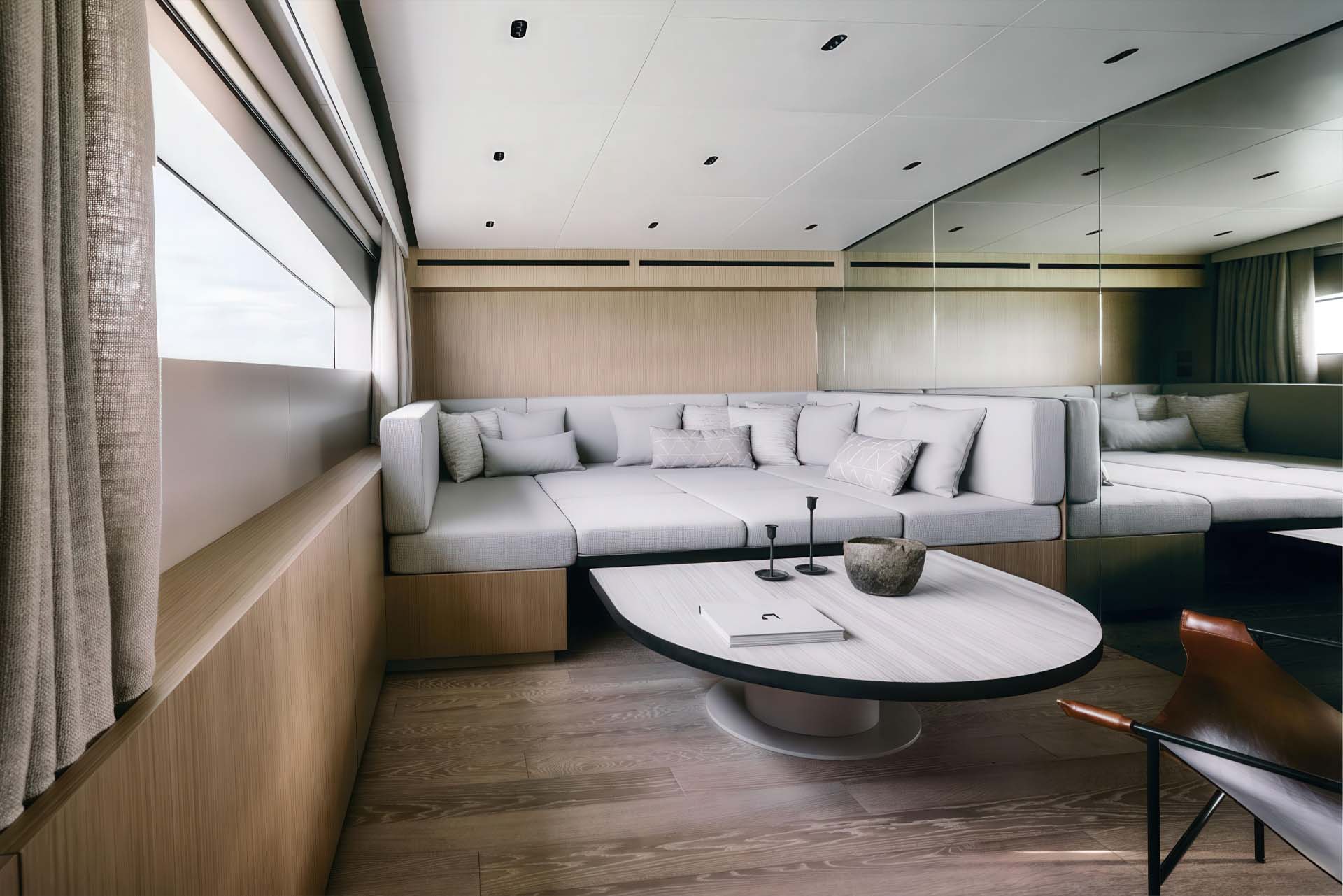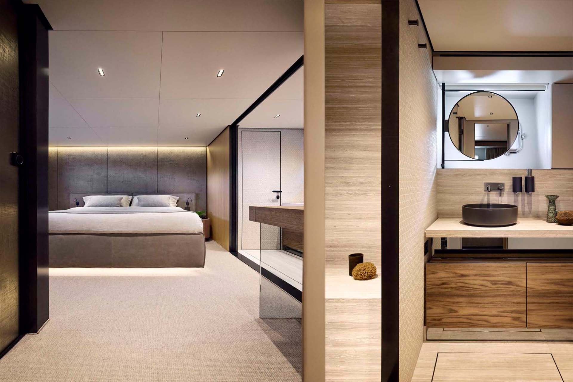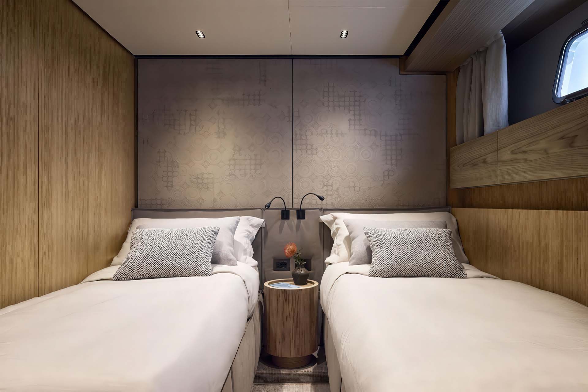 Яхта располагает четырьмя изысканными каютами для размещения восьми гостей, включая мастер-сьют во всю ширину корпуса. Профессиональный экипаж из четырех человек обеспечивает обслуживание высочайшего уровня на протяжении всего чартера. Главная палуба полностью посвящена отдыху и социализации гостей, спроектированная как большое открытое пространство с плавными переходами. Инновационная планировка под палубой переосмысливает вертикальную циркуляцию, уменьшая громоздкость и максимизируя полезный объем.