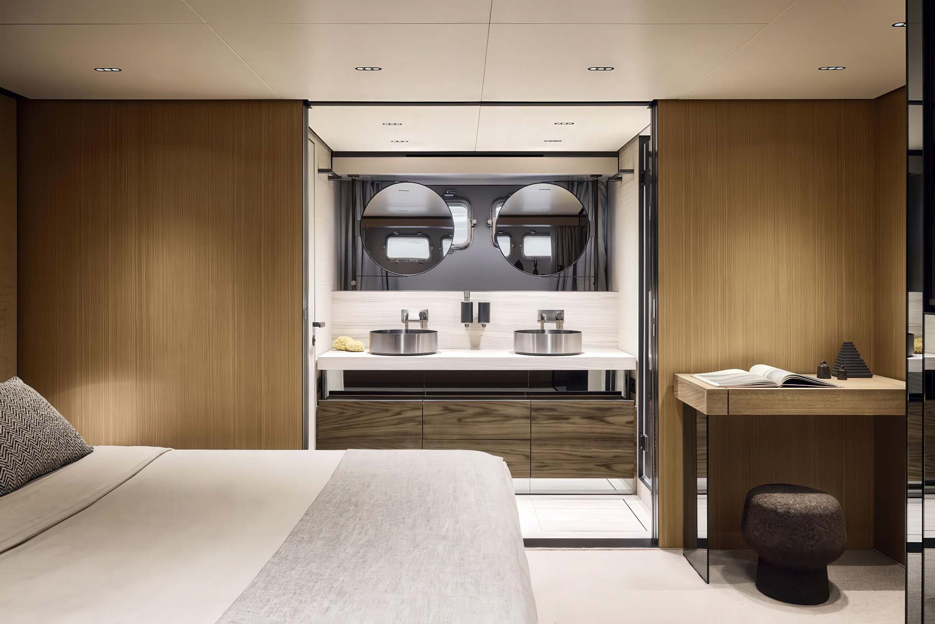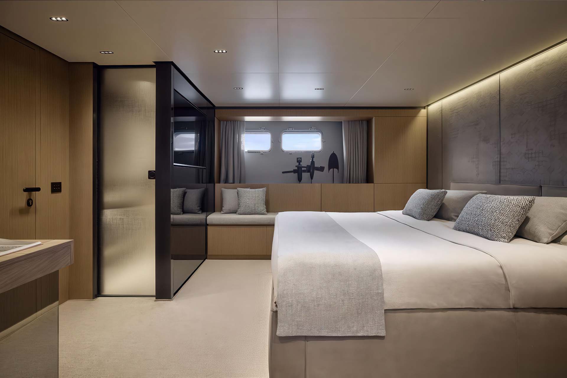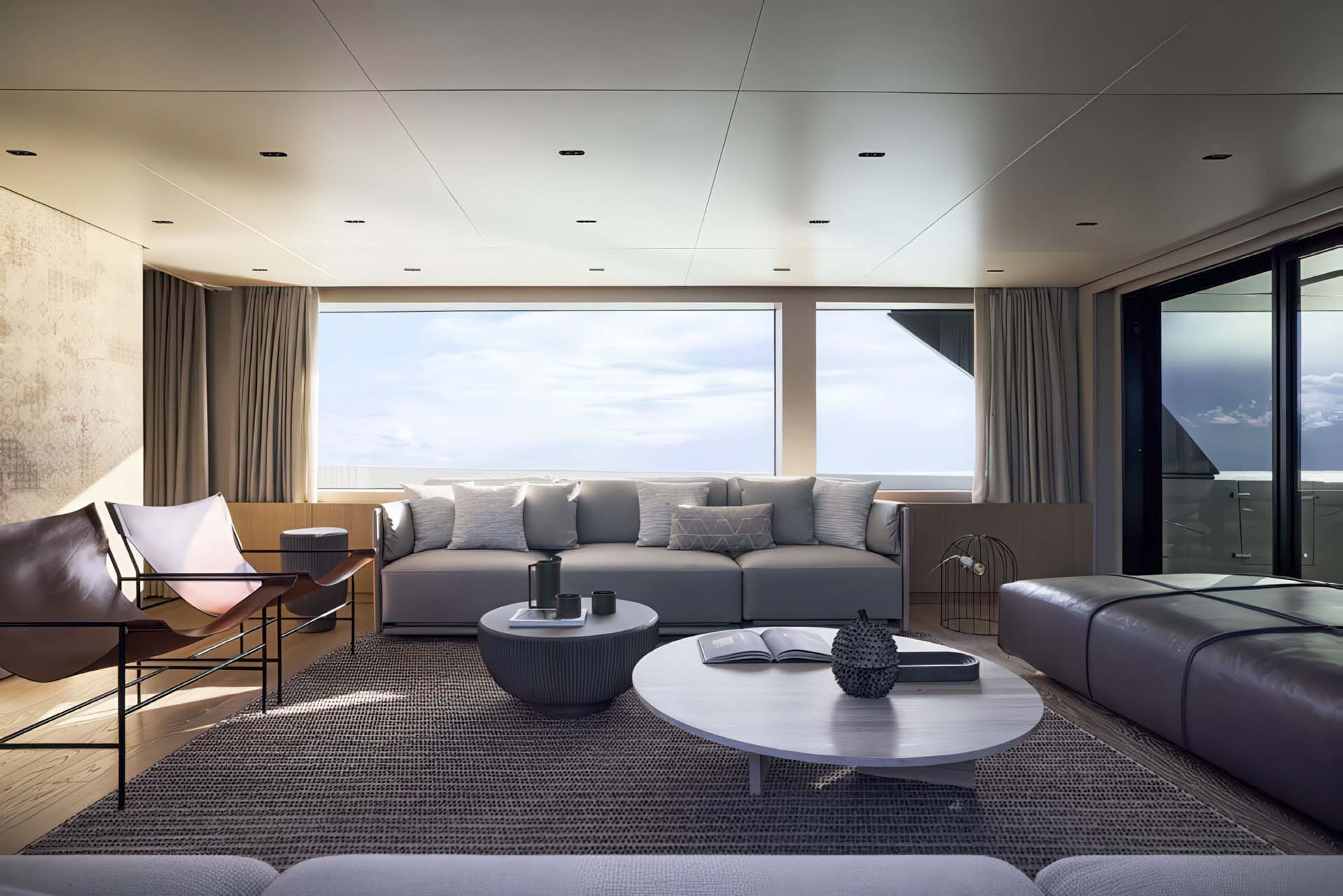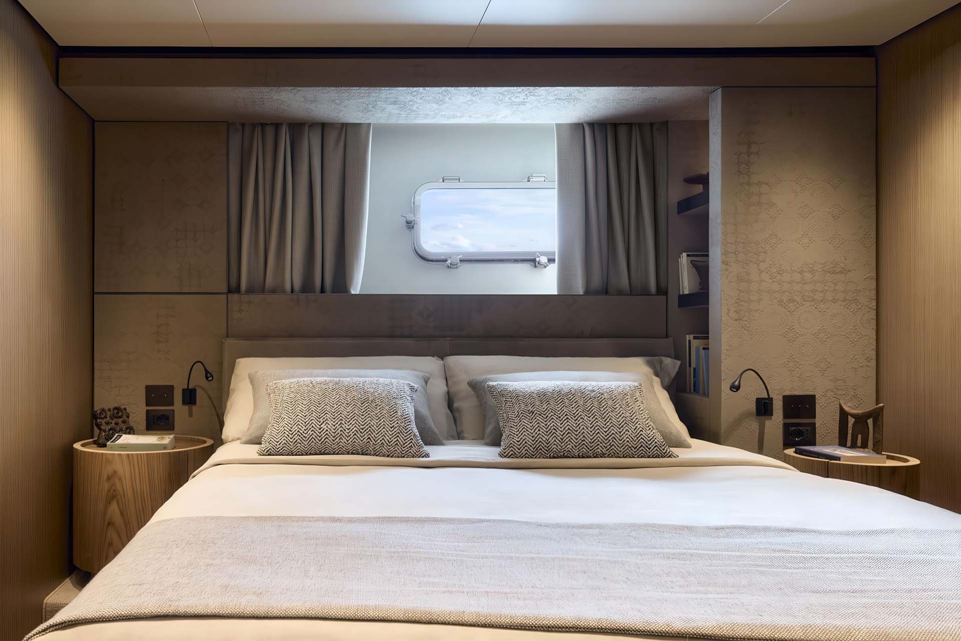Яхта располагает четырьмя изысканными каютами для размещения восьми гостей, включая мастер-сьют во всю ширину корпуса. Профессиональный экипаж из четырех человек обеспечивает обслуживание высочайшего уровня на протяжении всего чартера. Главная палуба полностью посвящена отдыху и социализации гостей, спроектированная как большое открытое пространство с плавными переходами. Инновационная планировка под палубой переосмысливает вертикальную циркуляцию, уменьшая громоздкость и максимизируя полезный объем.