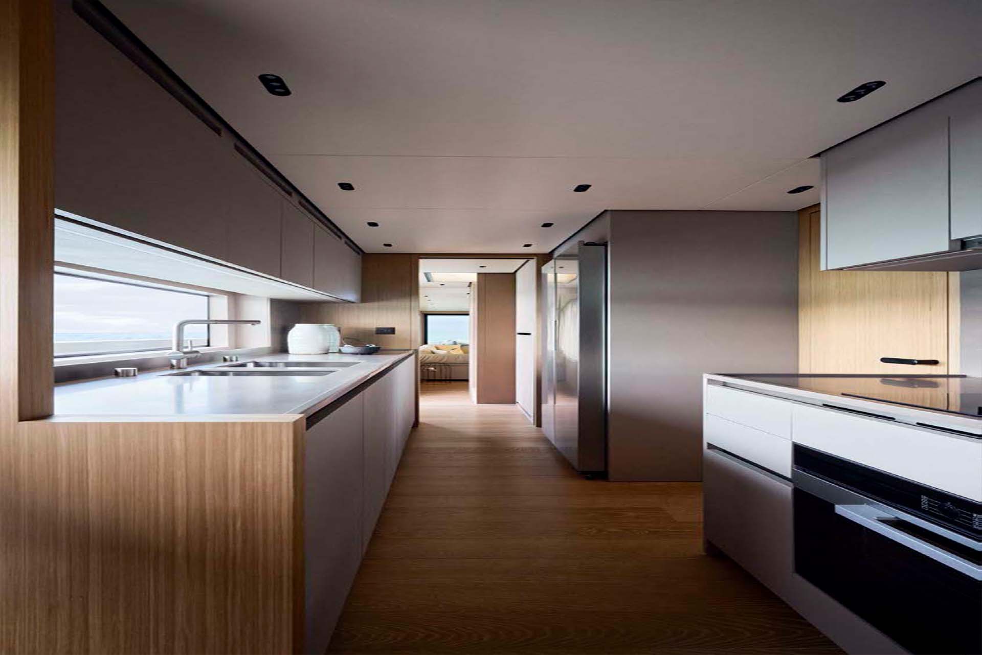 Разработанная в сотрудничестве с престижной студией Zuccon International Project, яхта SL86A воплощает в себе смелые дизайнерские решения, которые кардинально переосмысливают пространство на борту. Применение принципов асимметрии к яхте меньшего размера стало сложной задачей, но результатом стало еще более выразительное решение с точки зрения расширения внутренних и внешних пространств. Главной особенностью является масштабное асимметричное окно, протянувшееся от кормы до носа, которое устраняет визуальные препятствия и создает непрерывную связь с морем. Такой подход максимизирует обитаемость и предлагает непревзойденные панорамные виды на окружающий пейзаж.