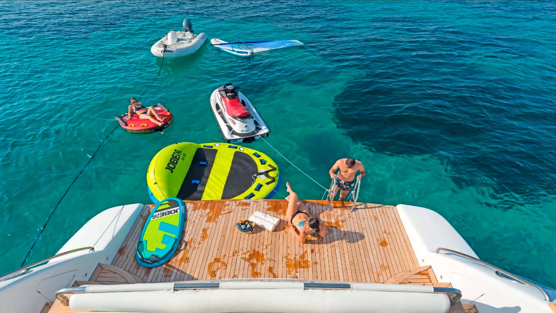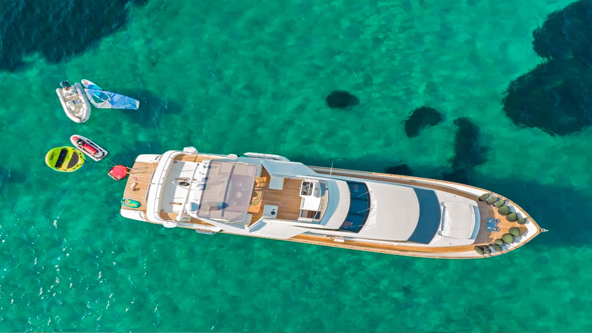 На Falcon 92 скучать точно не придётся - особенно тем, кто не мыслит море без экстрима и скорости. В вашем распоряжении целый арсенал водных игрушек: мощный Jet Ski для стремительных виражей, Jetsurf - доска с мотором для тех, кто хочет соединить серфинг и скорость, Seabob - подводный скутер, позволяющий скользить под водой, словно дельфин. Любителям коллективного веселья подойдут надувные ватрушки (Tubes) - проверенный способ разбудить адреналин. А если хочется тишины и медитации - берите SUP-доску и уходите к горизонту. Для трансферов к берегу и исследованию укромных бухт предусмотрен удобный тендер. Всё оборудование новое, обслуженное и готово к приключениям - остаётся только выбрать, с чего начать.