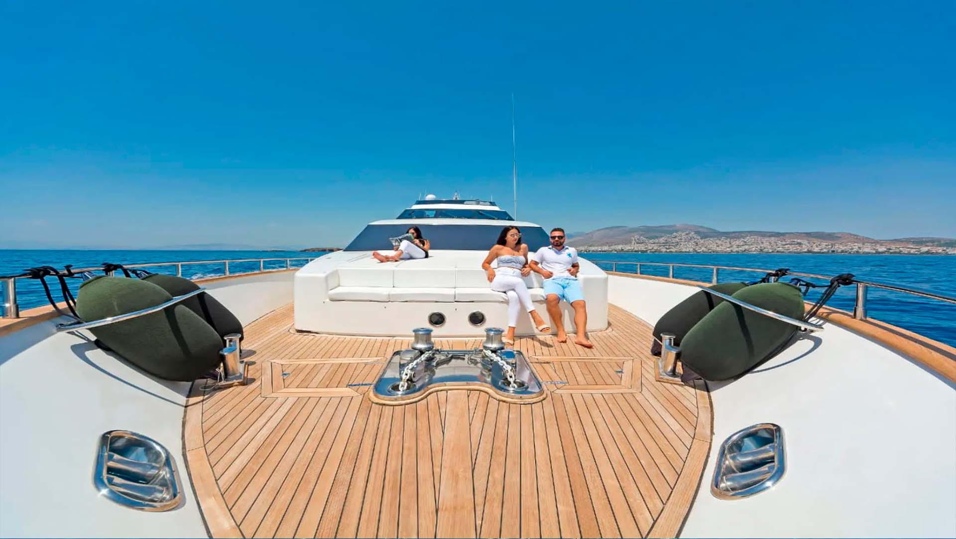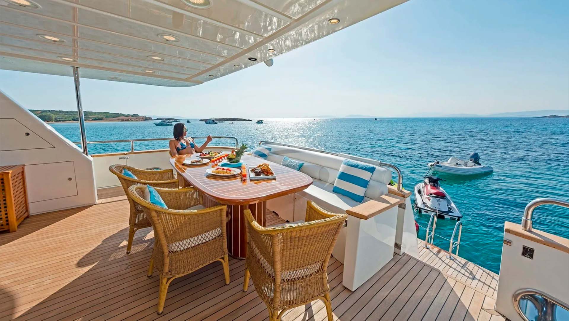 На борту вас ждёт всё, что ассоциируется с идеальным отдыхом в Эгейском море: просторный и уютный салон в стиле модерн, просторные зоны для загара и обеда на свежем воздухе, мягкая носовая палуба для ленивого отдыха под солнцем и, конечно, безупречный сервис команды из 5 человек, которая умеет слышать желания до того, как вы их озвучите.