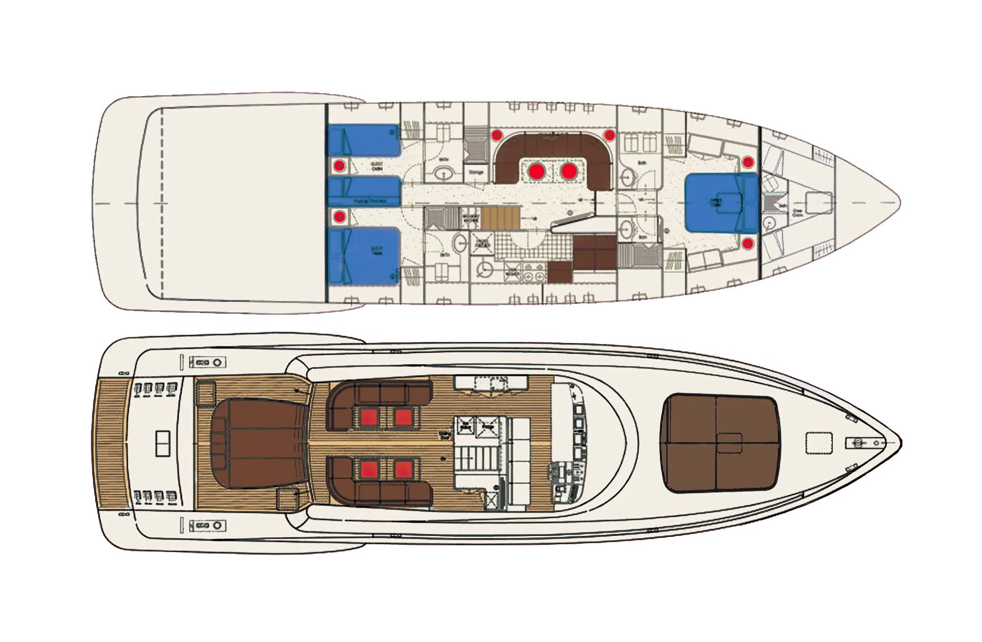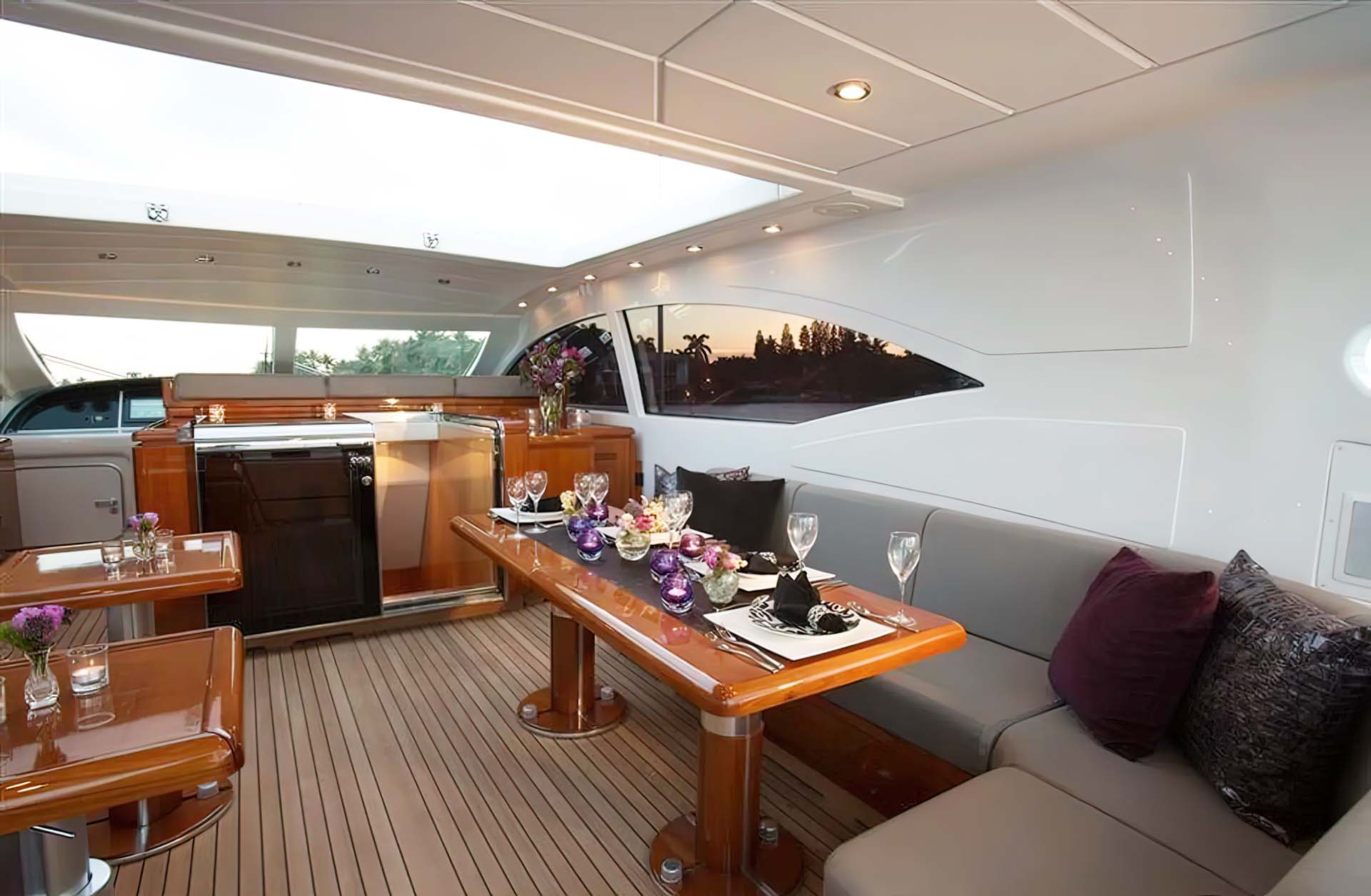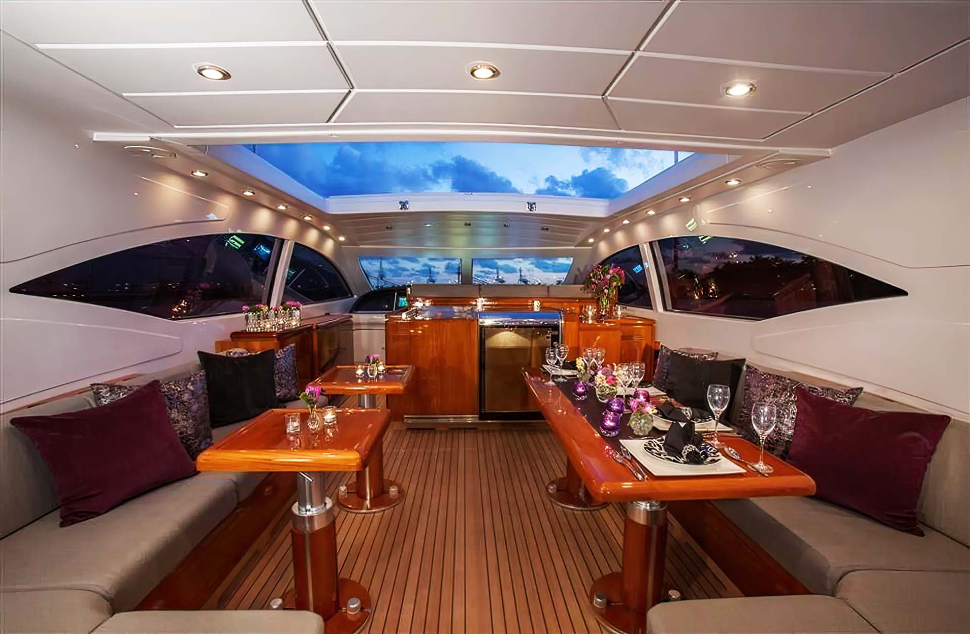 Что особенно ценно - скорость. Эта яхта действительно летит по волнам благодаря двум двигателя MAN по 1300 л.с. с Arneson-драйвами, превращают каждую прогулку в удовольствие для тех, кто знает толк в драйве и любит ветер в лицо. Это не просто морская прогулка, а настоящее приключение с ноткой адреналина.