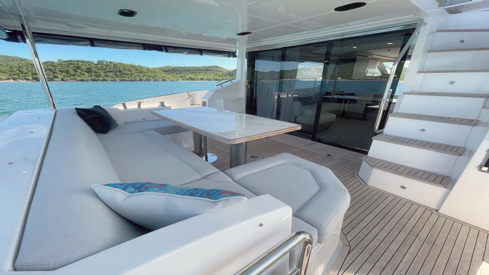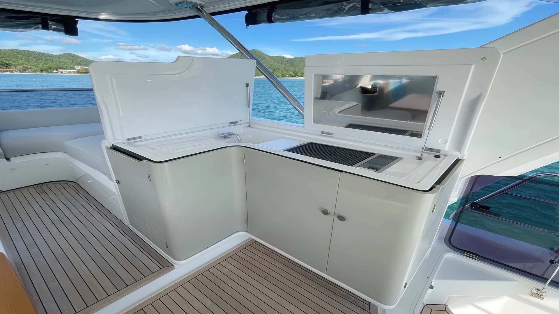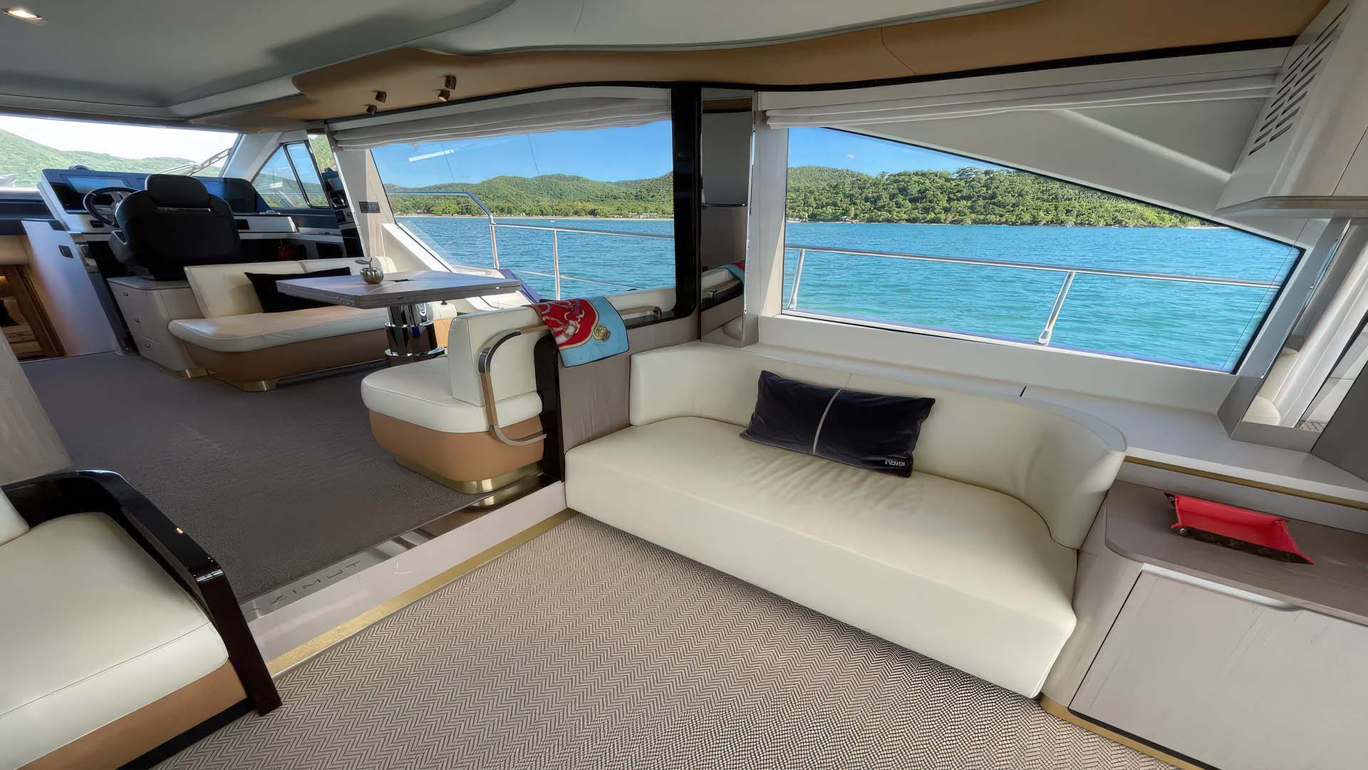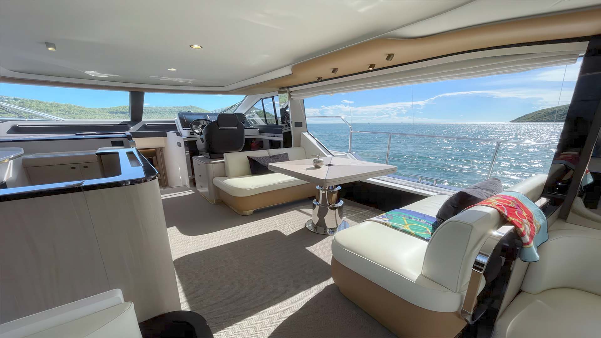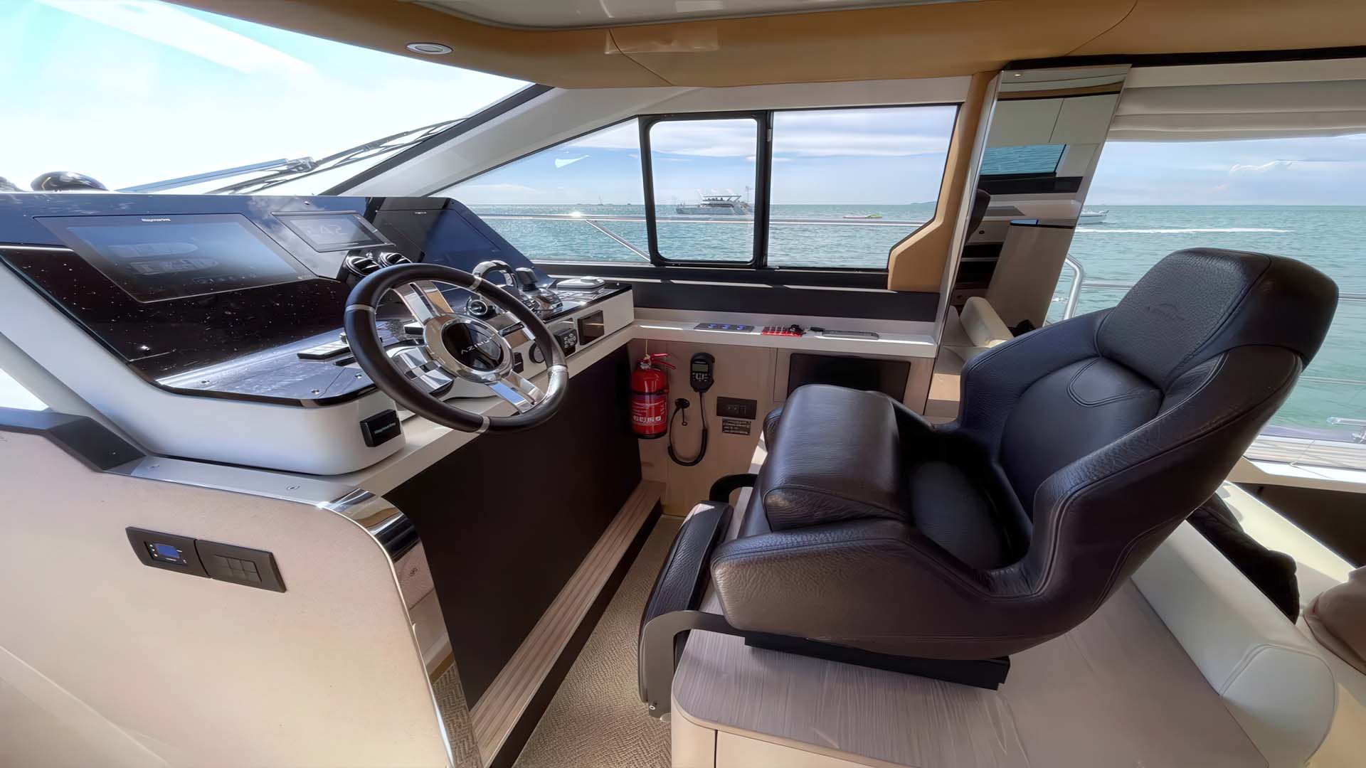 Поднимитесь по лестнице на флайбридж, и перед вами откроется пространство, созданное для жизни. Модульная зона отдыха с мягкими подушками, где можно разместить до 12 человек. Полноценный мокрый бар с холодильником для шампанского и винным кулером, электрические навесы в кокпите защищают от полуденного зноя, но при этом не крадут ощущение свободы.