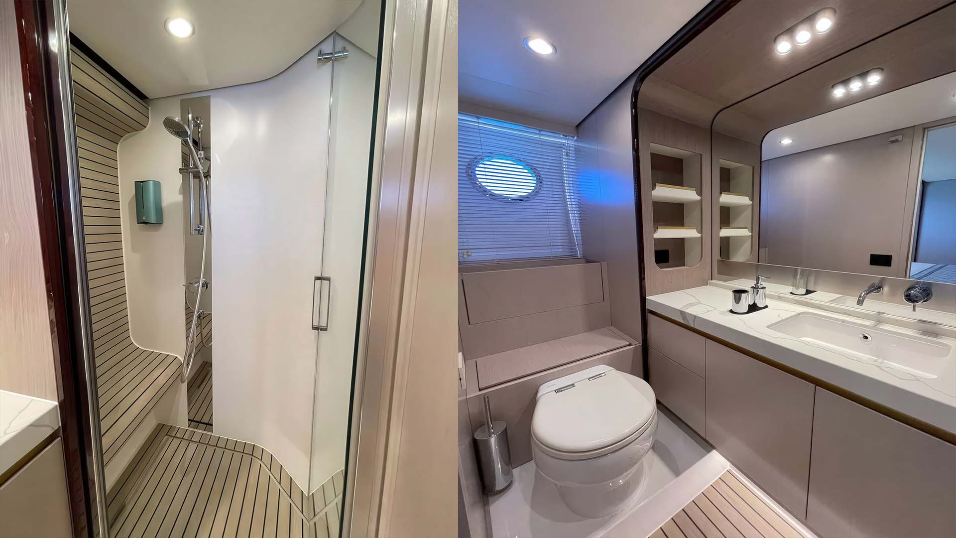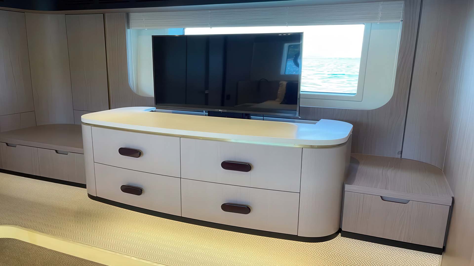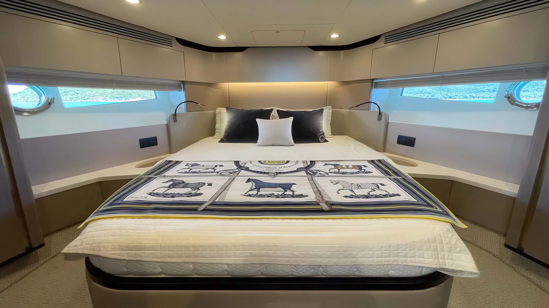 Три каюты готовы принять до 6 гостей на ночь (до 12 на дневных чартерах), предлагая уединение и комфорт после дня, проведённого на солнце и волнах. Мастер-каюта во всю ширину кормы - это личная вселенная с большой кроватью, встроенными шкафами и собственной ванной с отдельным душем. Vip-каюты находится в носу яхты и еще одна гостевая каюта с двумя односпальными кроватями идеальна для детей, друзей или просто для тех, кто ценит личное пространство. Плюс каюты для экипажа, которые обеспечат сервис, достойный пятизвёздочного отеля.