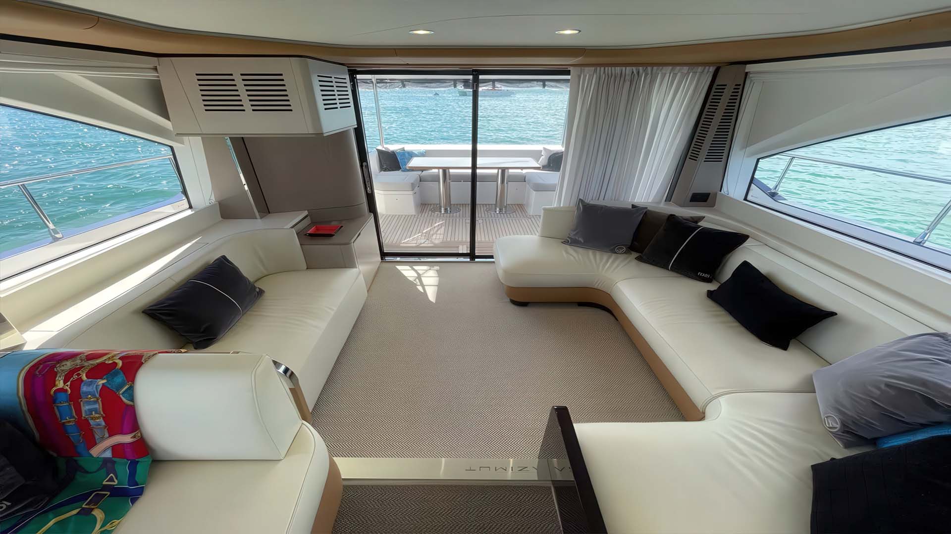 Внутри Azimut 60 царит атмосфера изысканной непринуждённости. Светлые тона, матовое дерево, кожаные диваны и хромированные акценты создают пространство, где роскошь не кричит, а шепчет. Высокий-низкий стол в салоне трансформируется одним движением, утром это обеденная зона для завтрака с панкейками и свежими фруктами, вечером - коктейльный бар для аперитивов под джаз.