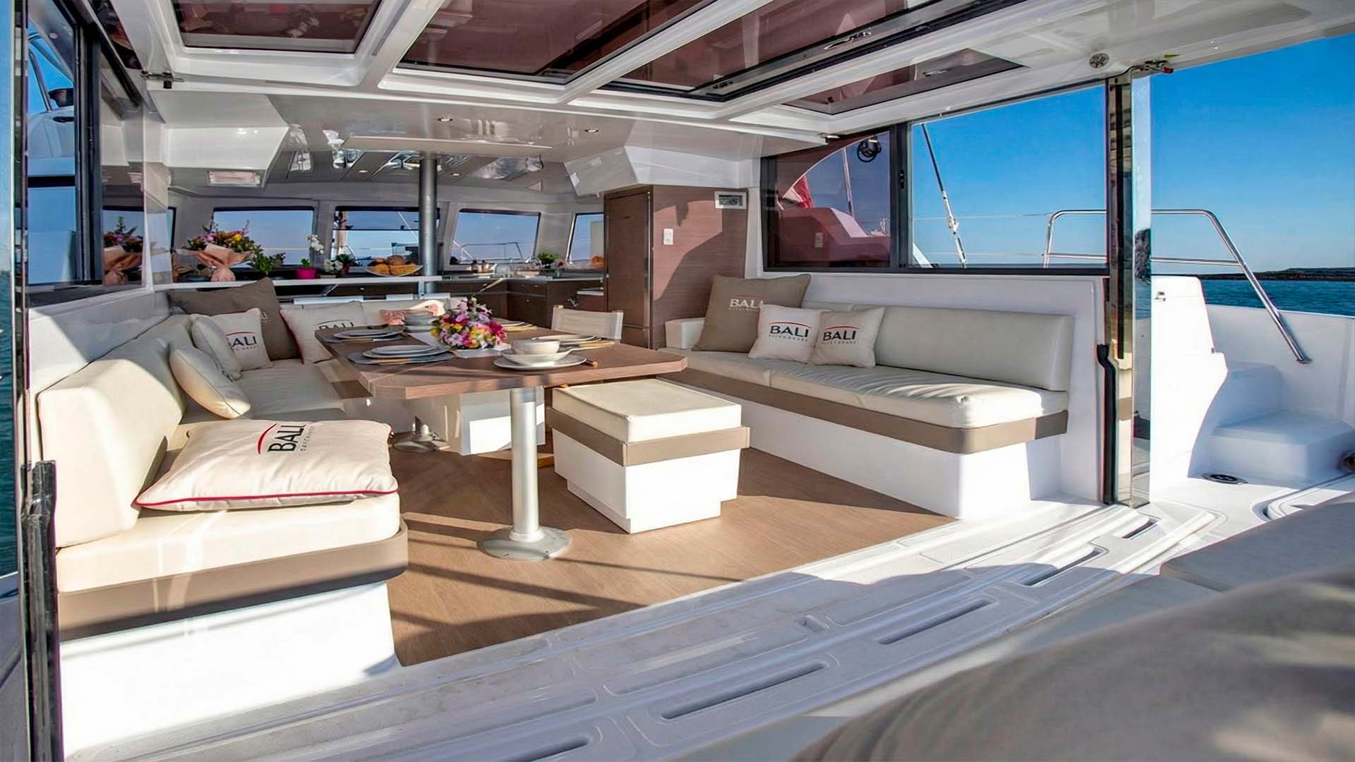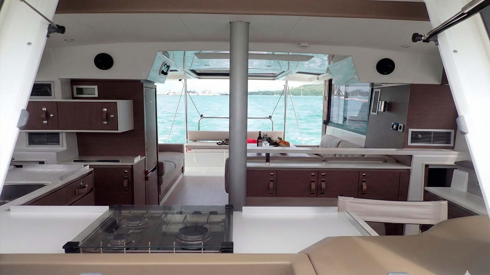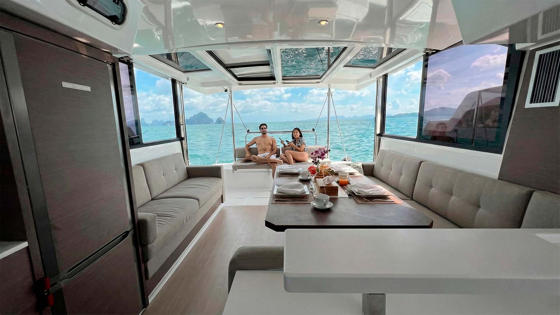 Первое, что поражает при взгляде на Bali Catspace 40 - это огромное открытое пространство, объединяющее кокпит и салон. Раздвижные двери полностью убираются, создавая единую зону площадью около 30 квадратных метров. Здесь нет традиционного разделения на "внутри" и "снаружи" - есть единое пространство, где ваша компания из 12 гостей естественным образом распределяется, в зависимости от настроения и времени суток. Если погода меняется, те же раздвижные двери, за секунды превращают открытое пространство в защищенную зону, где можно комфортно переждать кратковременный тропический дождь.