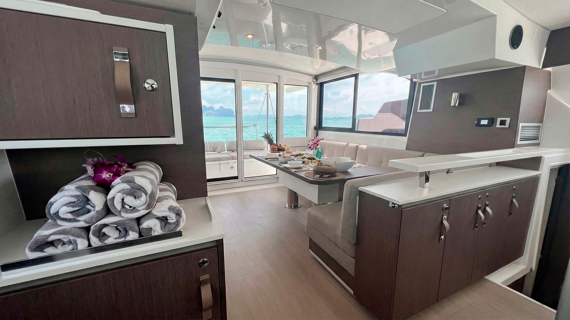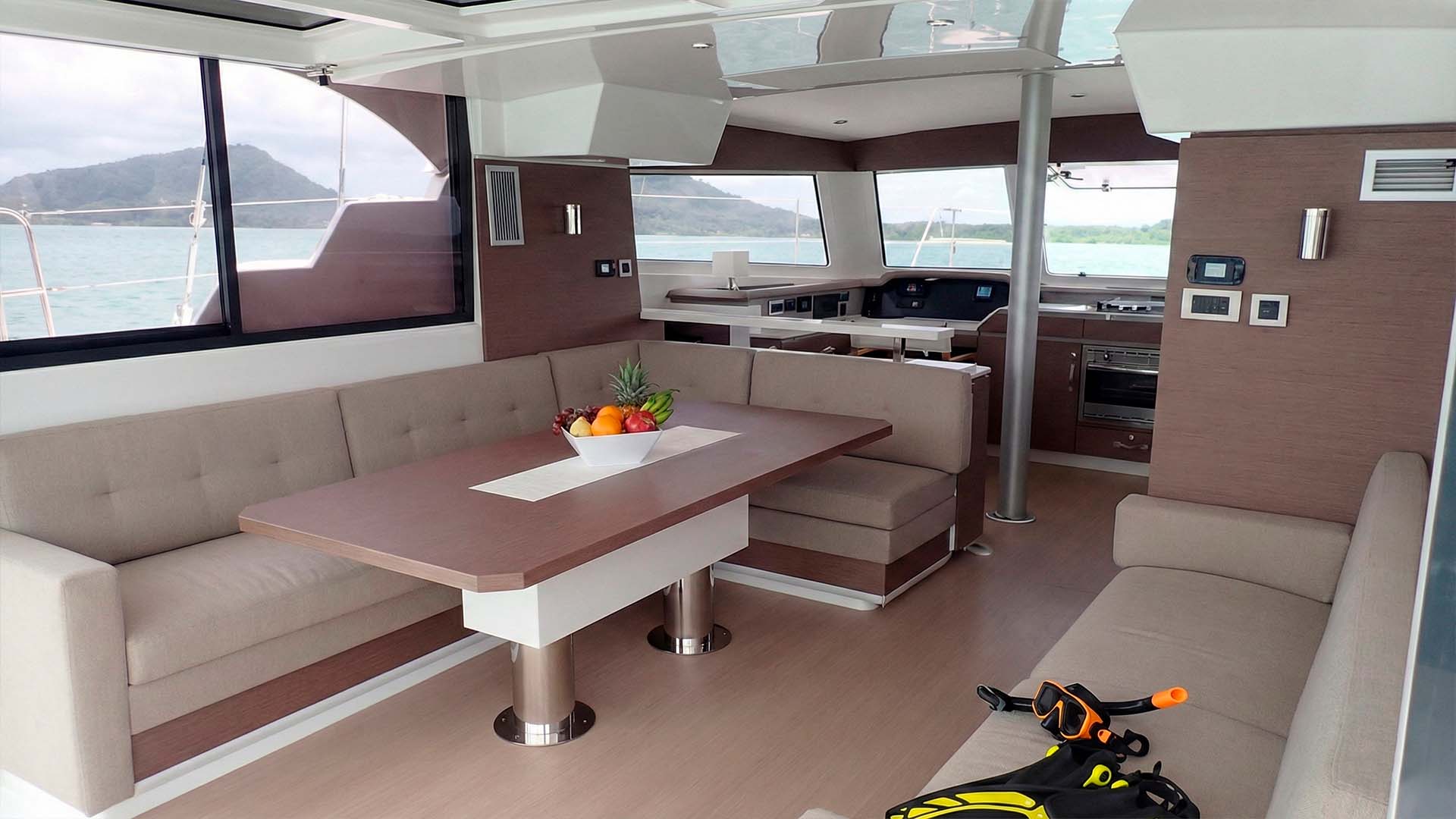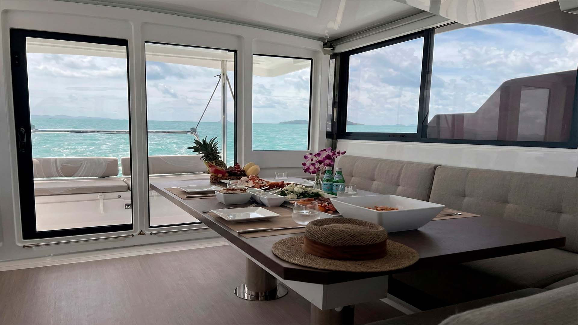 Первое, что поражает при взгляде на Bali Catspace 40 - это огромное открытое пространство, объединяющее кокпит и салон. Раздвижные двери полностью убираются, создавая единую зону площадью около 30 квадратных метров. Здесь нет традиционного разделения на "внутри" и "снаружи" - есть единое пространство, где ваша компания из 12 гостей естественным образом распределяется, в зависимости от настроения и времени суток. Если погода меняется, те же раздвижные двери, за секунды превращают открытое пространство в защищенную зону, где можно комфортно переждать кратковременный тропический дождь.