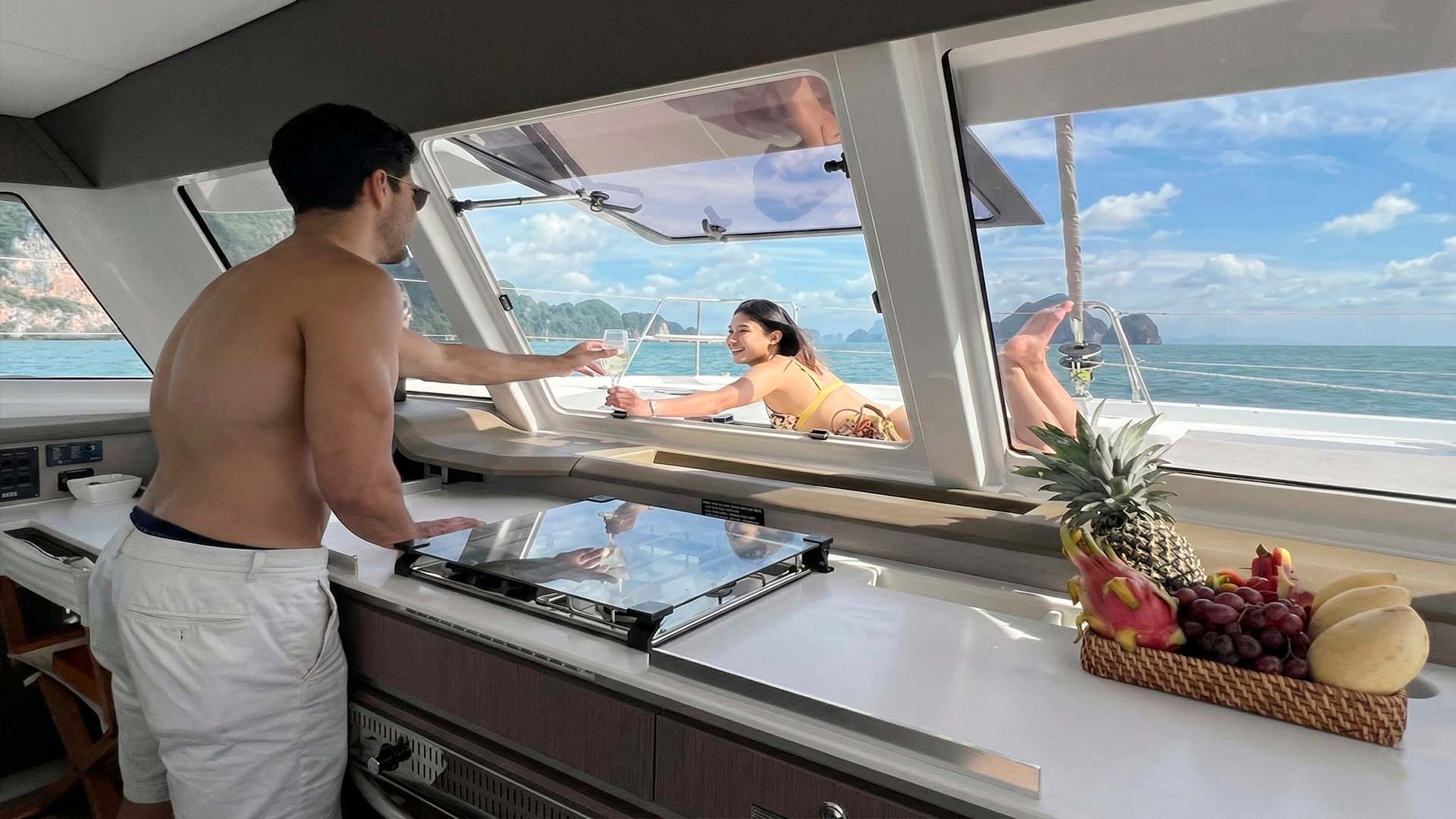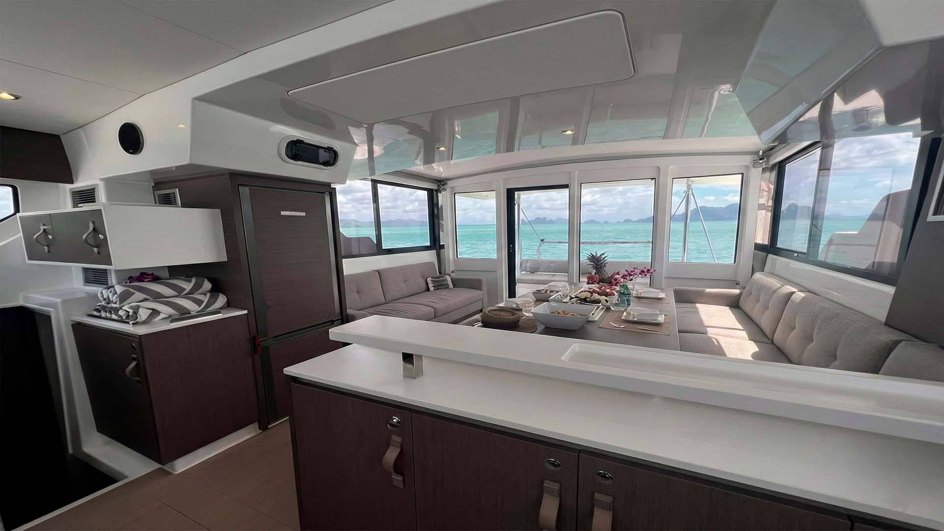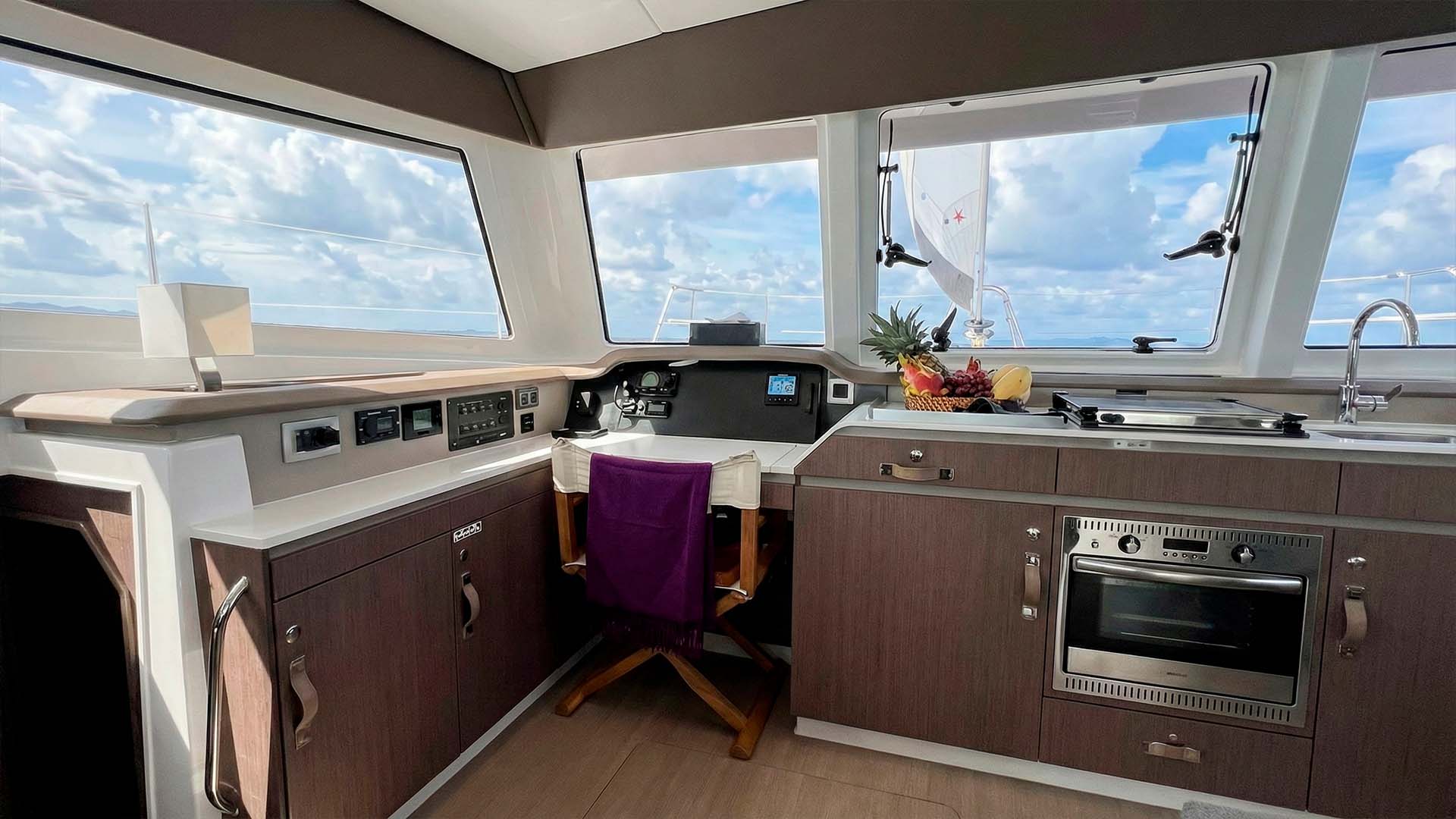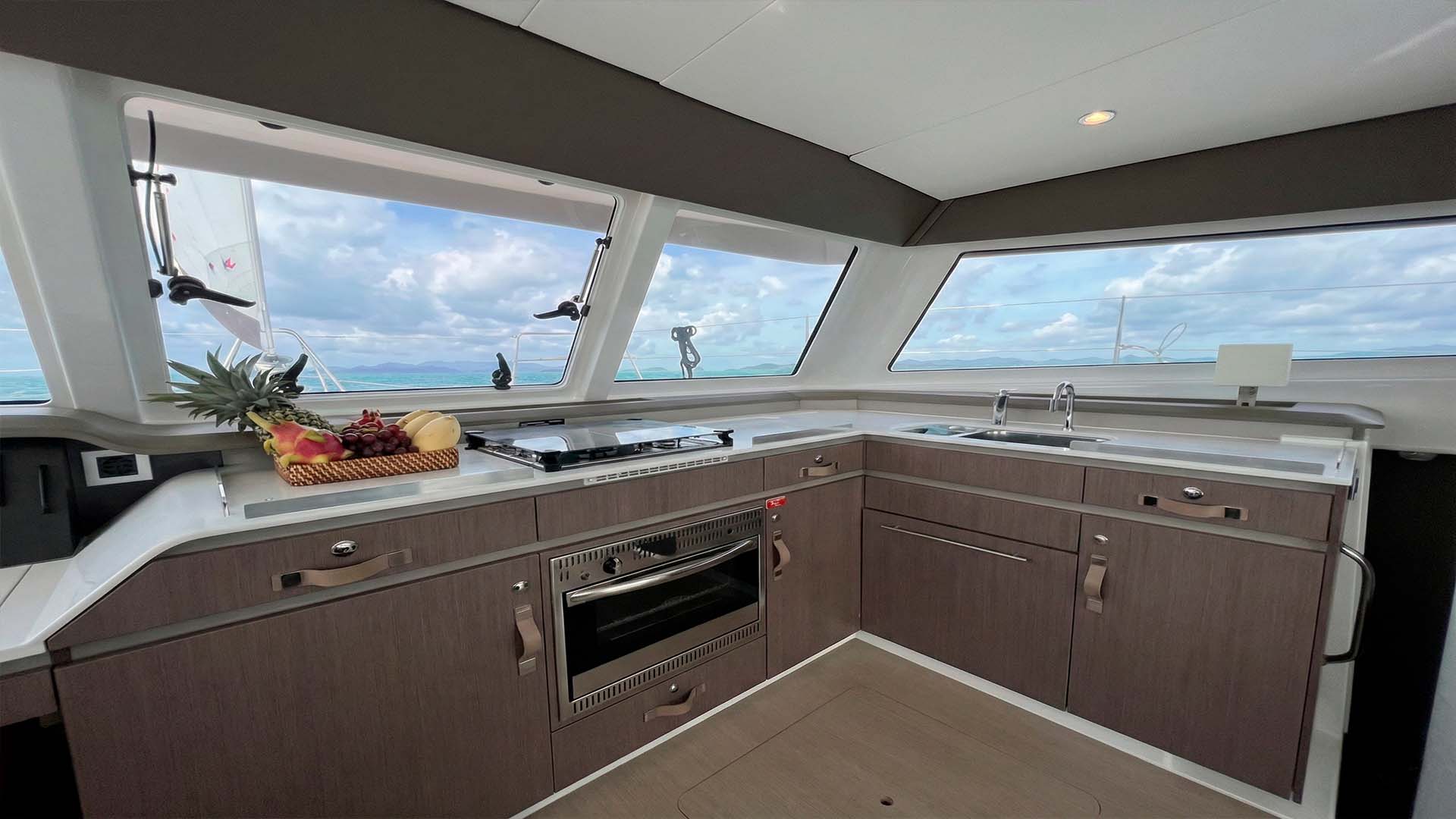 Камбуз Bali Catspace 40 расположен так, что повар может общаться с гостями, готовя блюда. Холодильник, плита, все необходимое оборудование, все под рукой. Это не огромная кухня мега-яхты, но для катамарана 12.3 метра она функциональна и продумана.