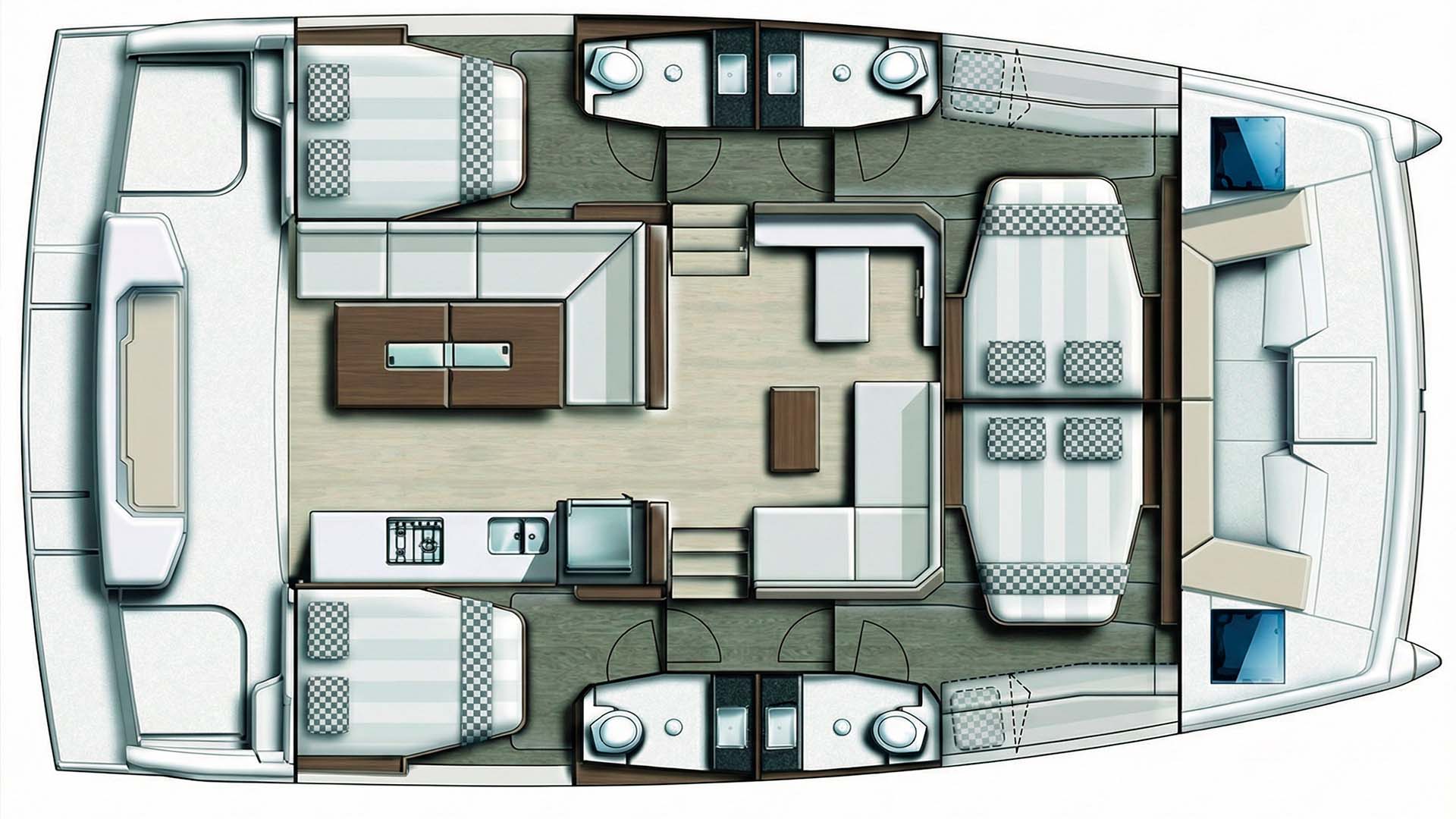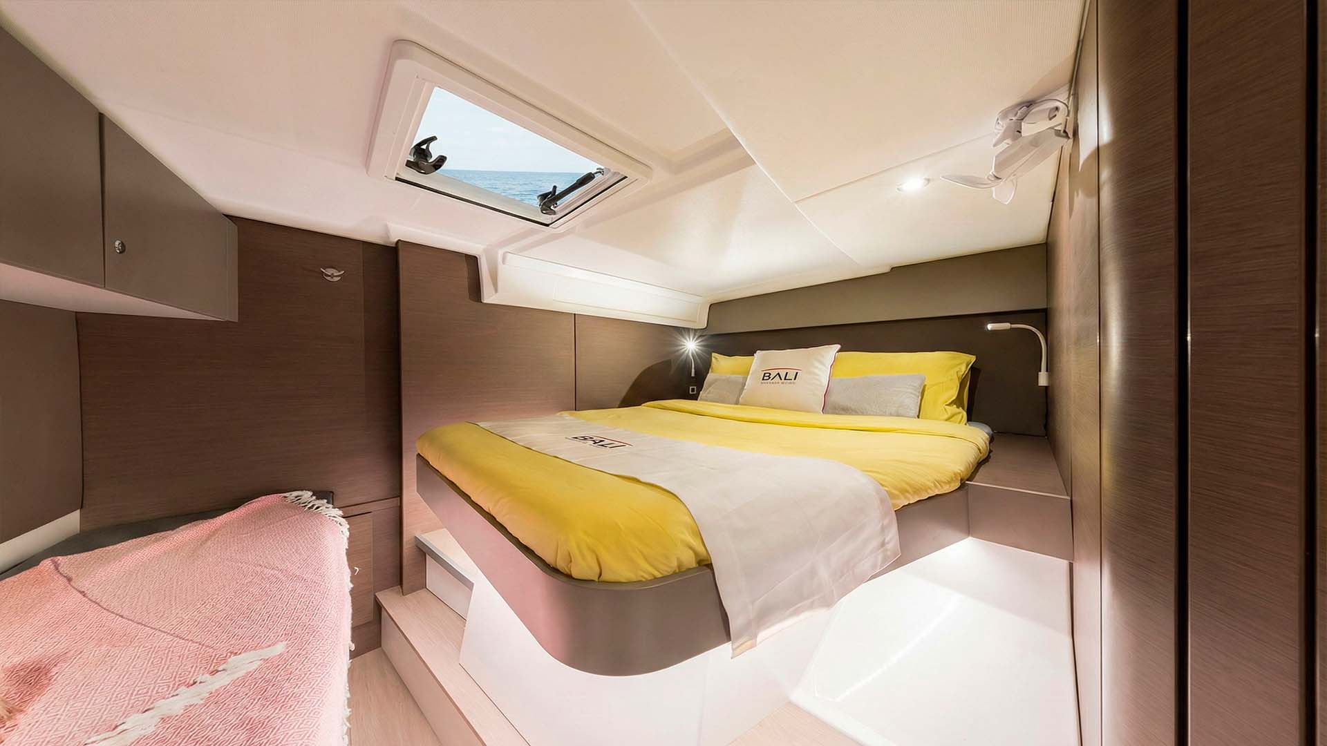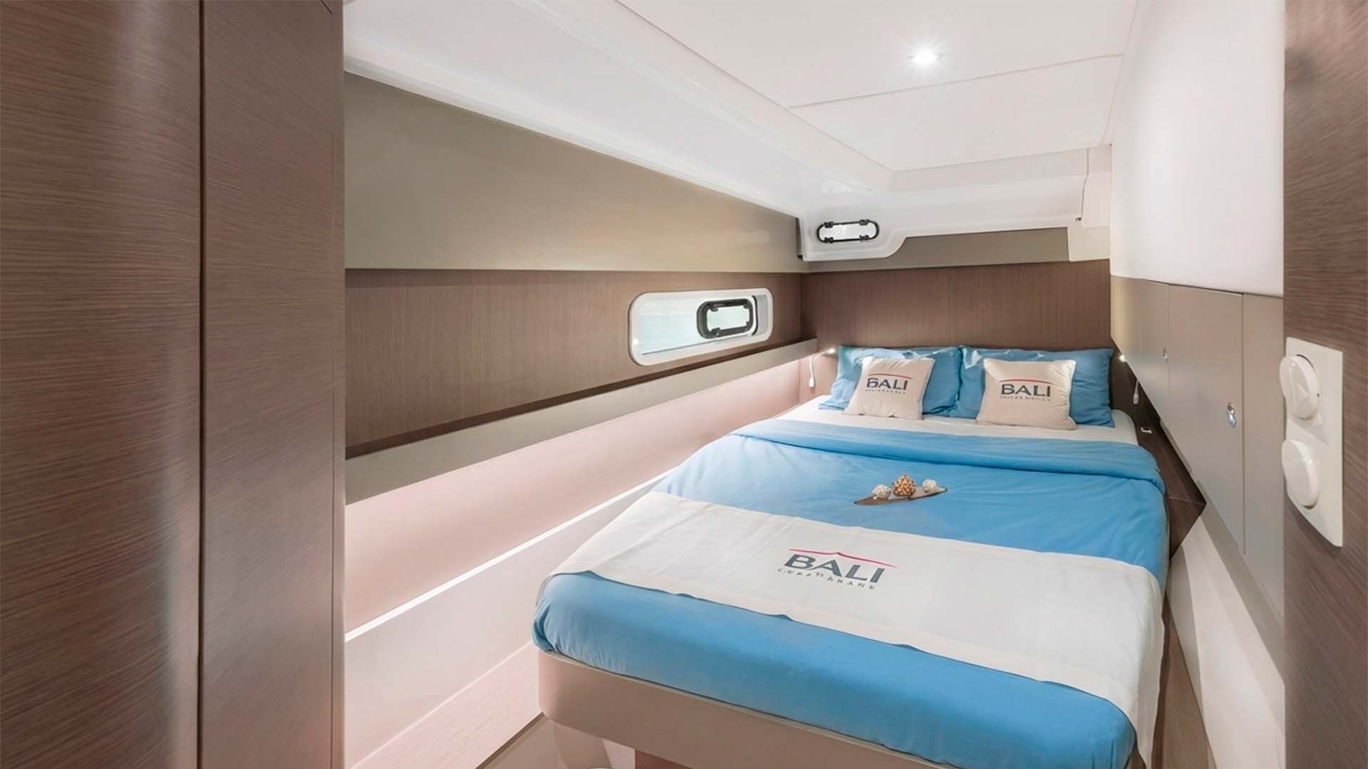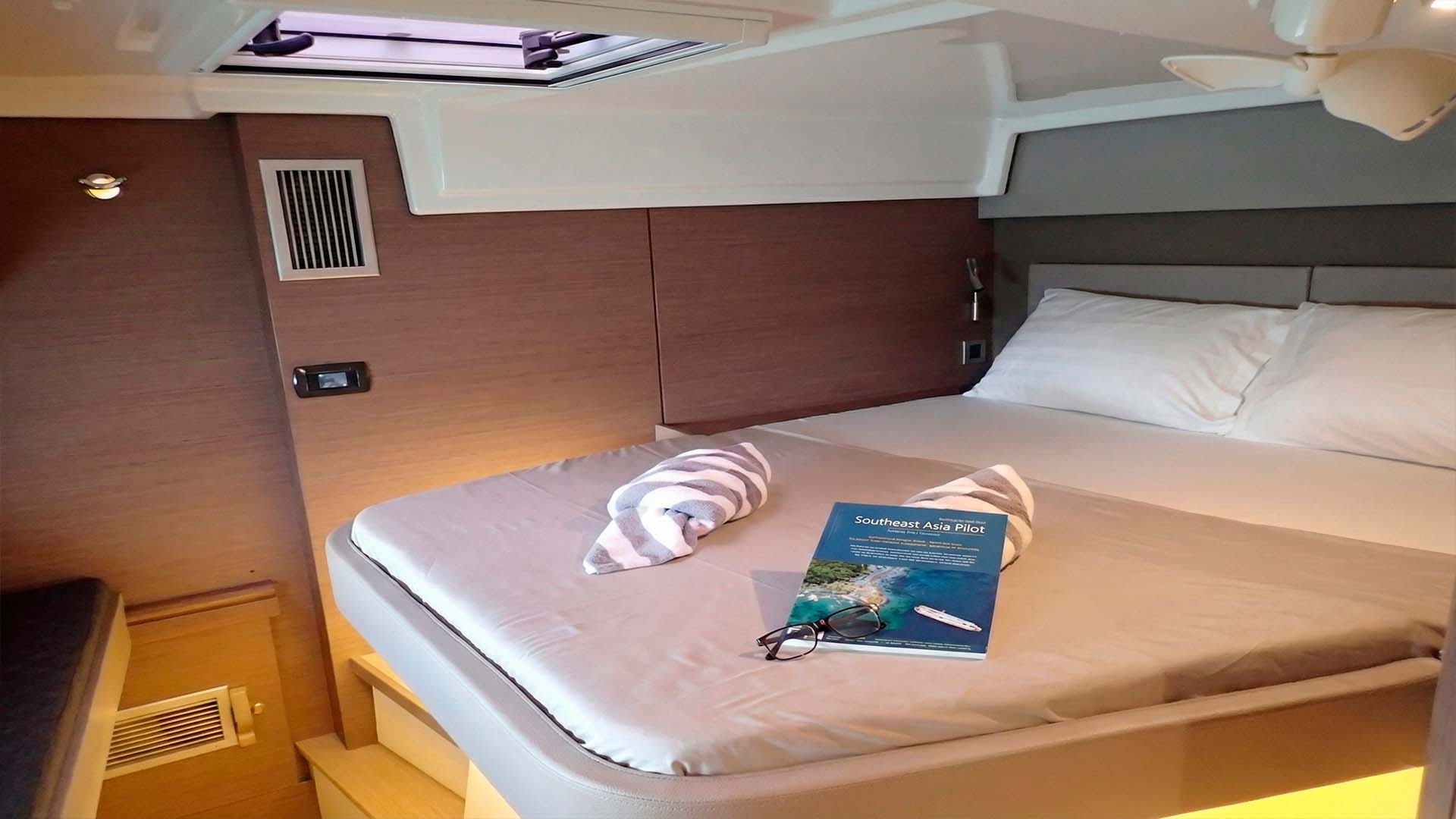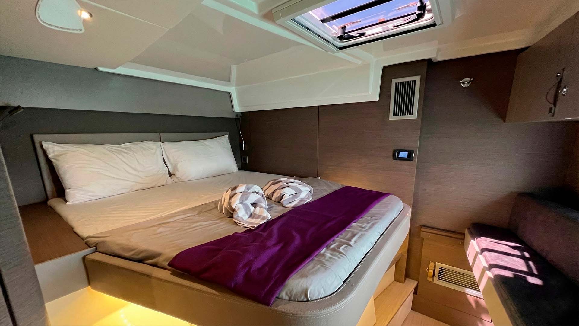 Спустившись на нижнюю палубу, вы обнаруживаете четыре каюты, каждая из которых продумана с французским вниманием к деталям. Bali Catspace 40 может разместить до 8 гостей для ночевок, обеспечивая комфорт и приватность. Каждая из четырех кают имеет собственную ванную комнату, что критически важно для комфорта. Двуспальные кровати, системы хранения, иллюминаторы, через которые утром проникает мягкий свет - все создано для того, чтобы вы чувствовали себя как дома, но с видом на океан. Вентиляция продумана так, что даже без кондиционера (который есть на борту), в каютах комфортно благодаря естественной циркуляции воздуха - особенность хорошо спроектированного катамарана.