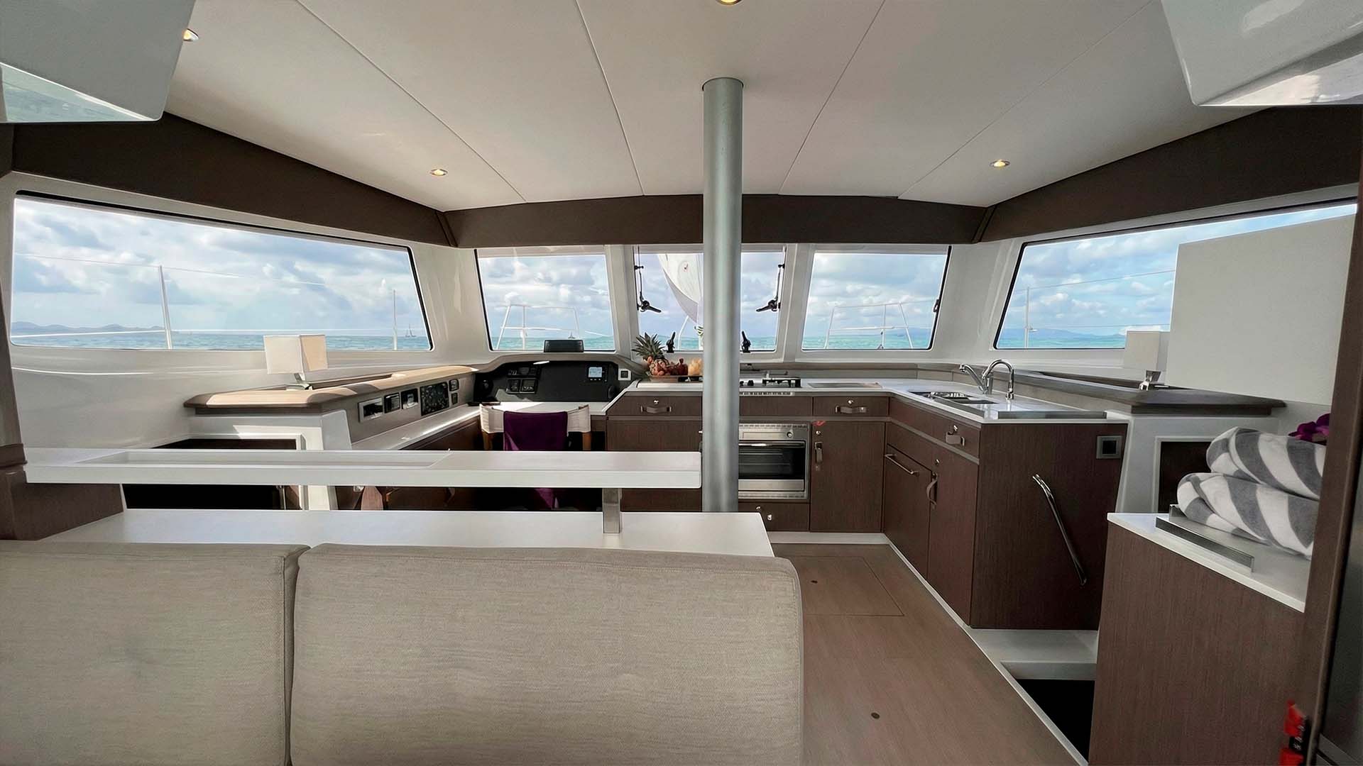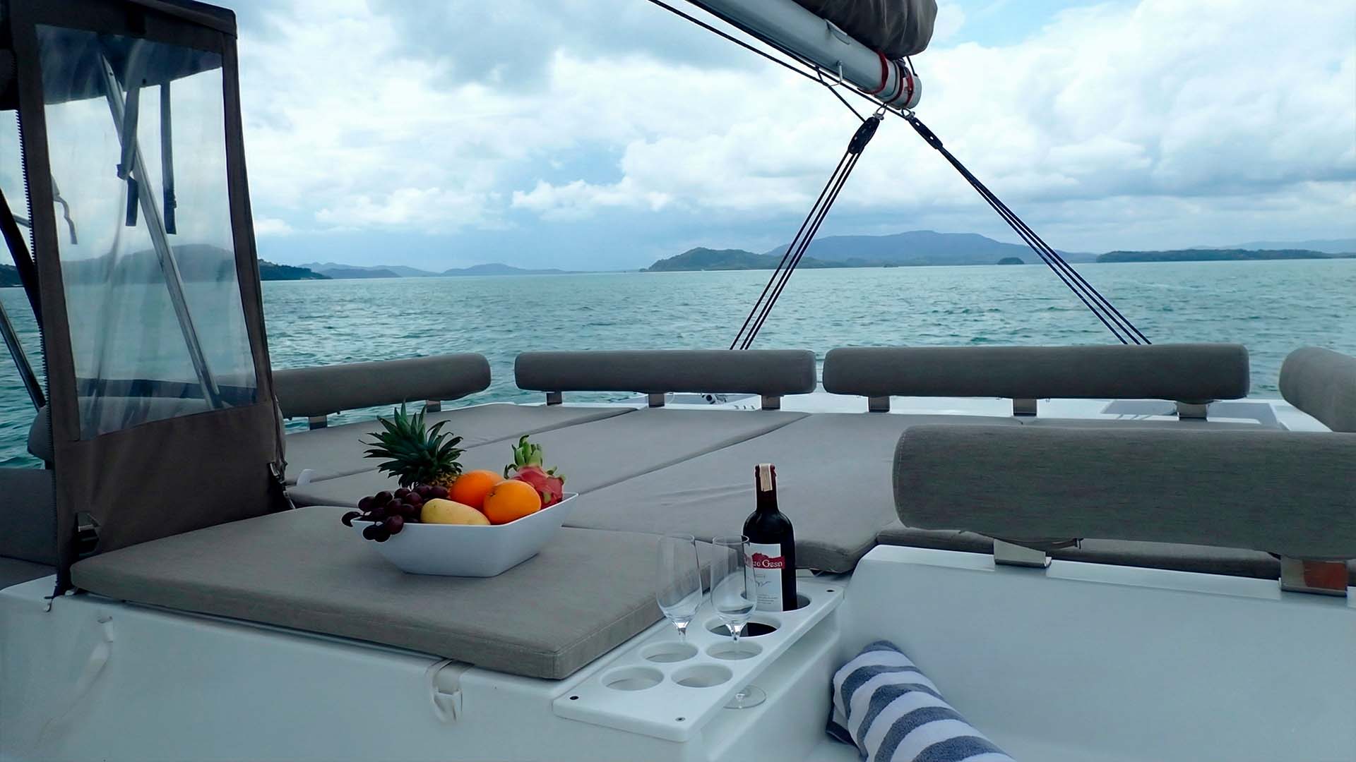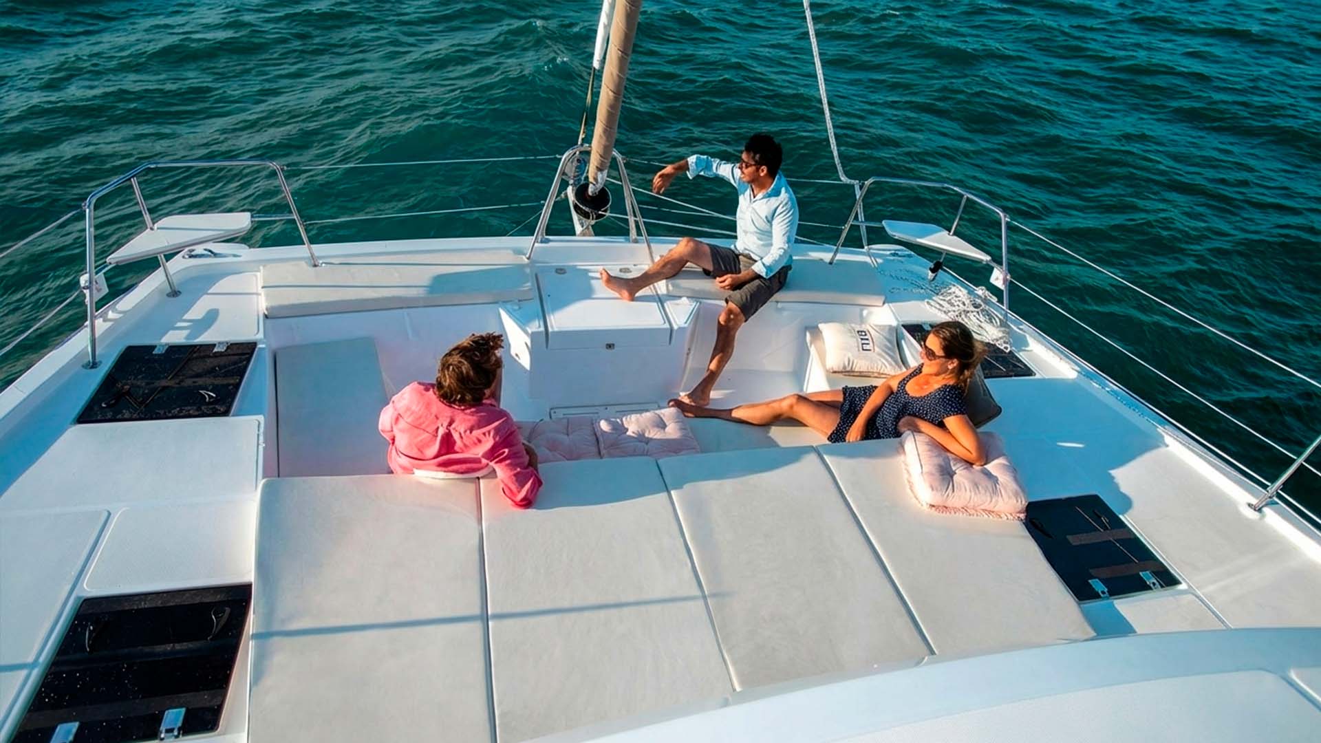 Необычное решение у Bali Catspace 40 - это передняя палуба, вместо привычных сеток между корпусами, здесь расположена полноценная лаунж-зона с мягкими подушками и столиком, как у больших моторных яхт. Это не просто место для загара, это пространство, где можно проводить часы, наблюдая, как катамаран мягко скользит по волнам под парусом.