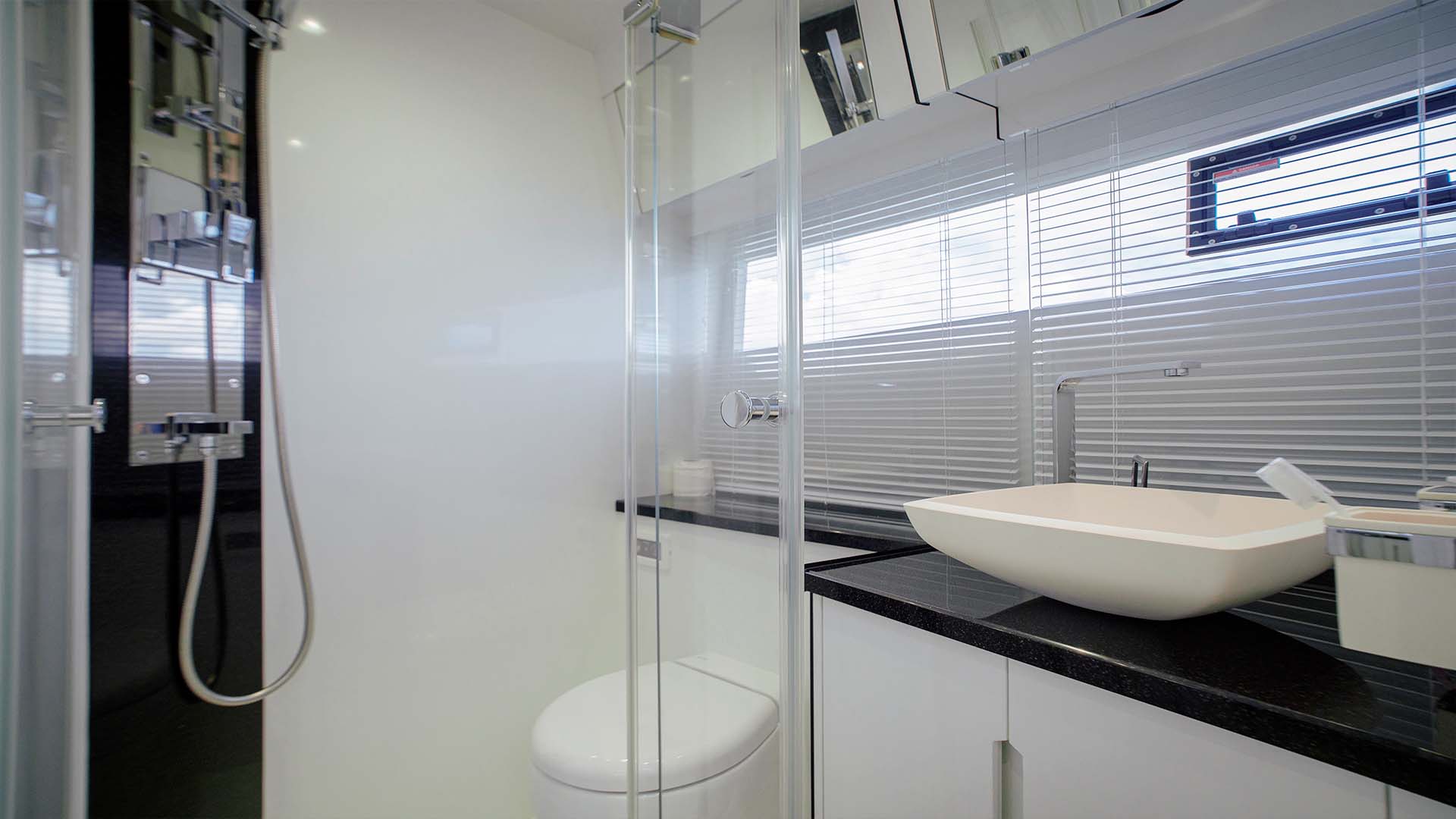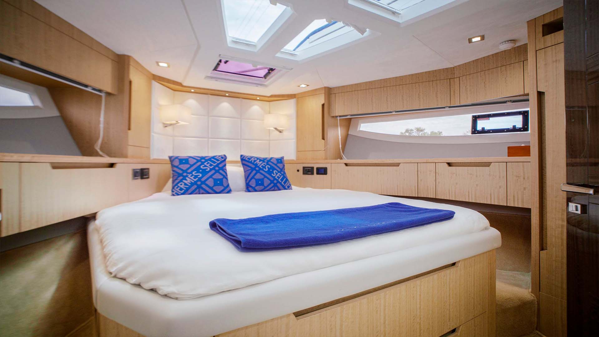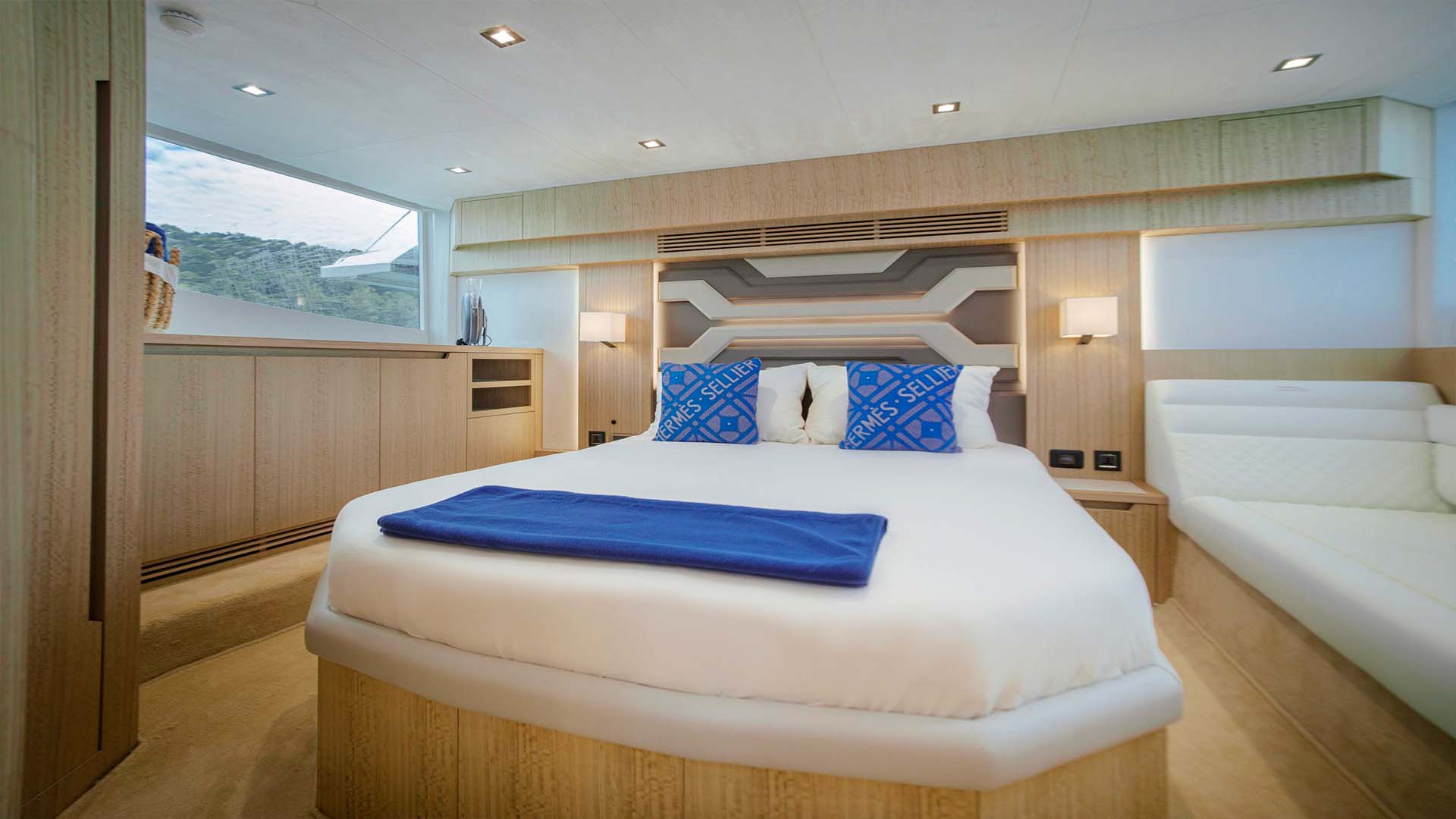 Мастер каюта во всю ширину яхты предлагает king-size кровать, отдельную зону с диваном, который может трансформироваться в дополнительное спальное место, и собственную ванную комнату. Хранение продумано до мелочей, характерная черта европейского дизайна.