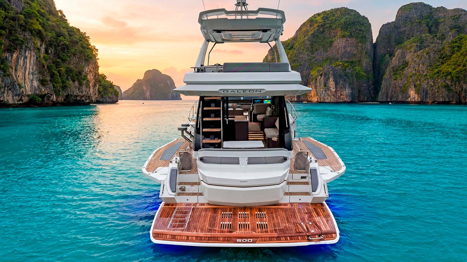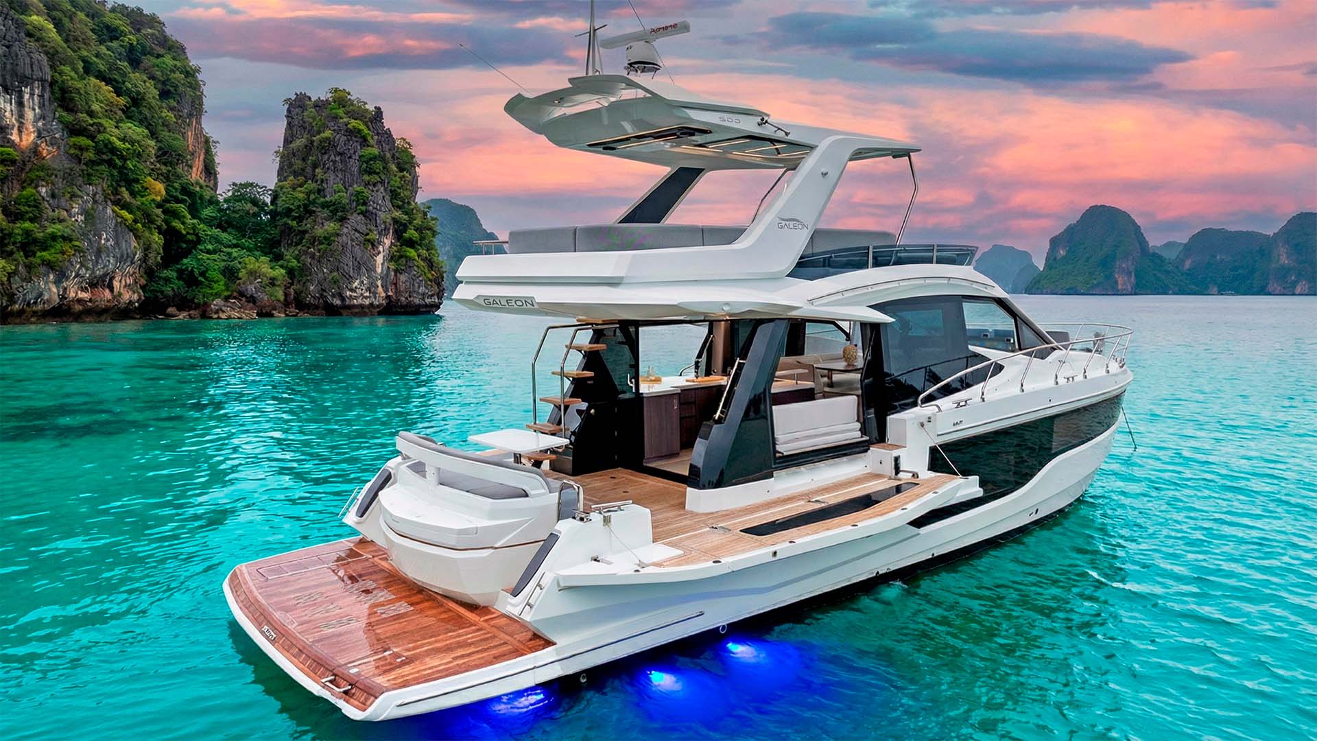 Залив Пханг Нга - это место, где архитектура Galeon 500 встречается с архитектурой природы. Фантастические известняковые башни, поднимающиеся вертикально из изумрудной воды, создают естественный амфитеатр, а развернутые балконы превращаются в VIP-ложи этого природного театра. Уникальность маршрута в том, что ваши гости могут одновременно фотографировать остров Джеймса Бонда с трех разных ракурсов: левого балкона, правого балкона и флайбриджа, создавая уникальную панораму. Когда яхта проходит через узкие каналы между скалами, балконы можно сложить одним нажатием кнопки, а затем снова развернуть в открытой лагуне. Плавучая деревня Ко Панйи становится особенно интересной с боковых платформ, можно наблюдать за жизнью на сваях буквально на уровне глаз.
