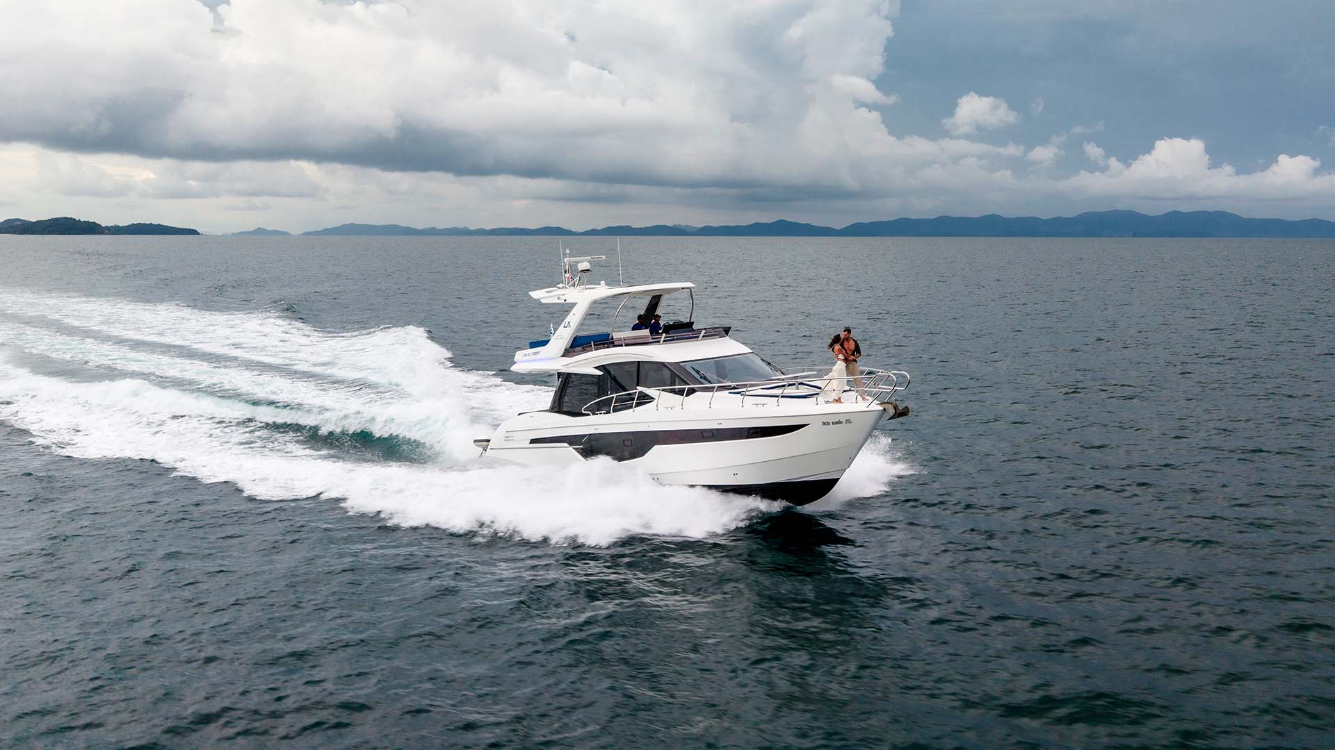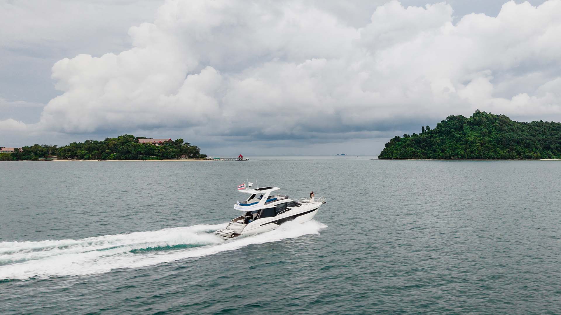 Эти ближайшие острова созданы специально для того, чтобы познакомиться с уникальными возможностями Galeon 500 Fly. Когда яхта встает на якорь в спокойной бухте Khai Nok, происходит трансформация: балконы плавно раскладываются, превращая яхту в плавающую террасу площадью почти 50 квадратных метров. Здесь можно по-настоящему оценить инновацию Galeon, пока одна часть вашей компании загорает на левом балконе, другие спускаются в воду прямо с правой платформы, а центральная палуба остается свободной для обеда. На Naka Yai, где вода более активная, откидные террасы становятся идеальными для наблюдения за проплывающими мимо аутентичными тайскими лодками и гидроциклами. Малая осадка яхты позволяет подойти к пляжу ближе других яхт, делая балконы буквально продолжением берега.