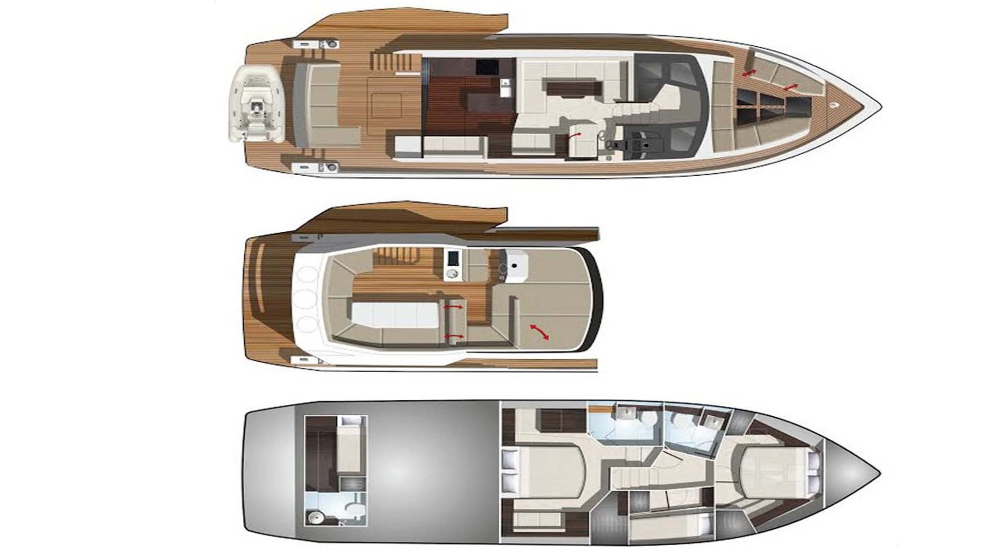 Спустившись вниз, вы обнаруживаете три каюты, способные разместить до 6 гостей для длительных чартеров. Galeon 500 Fly спроектирована так, что каждая каюта получает естественный свет через иллюминаторы.